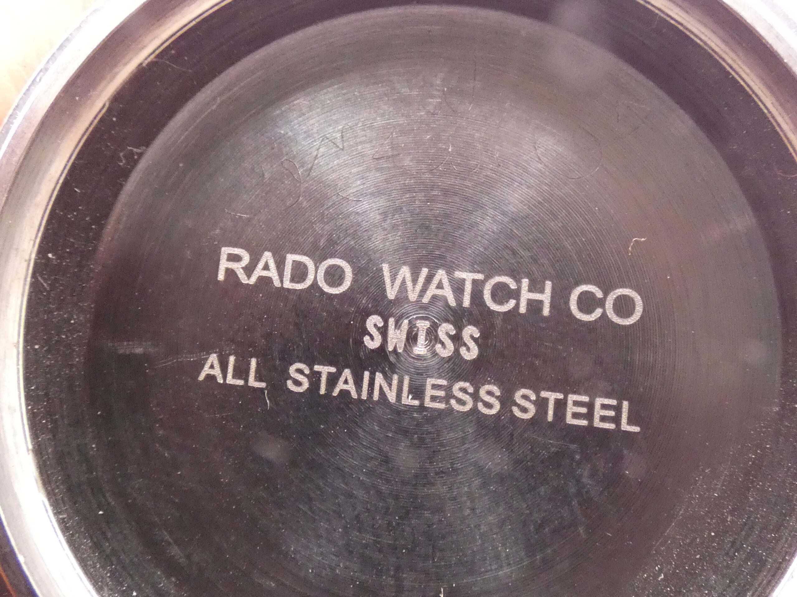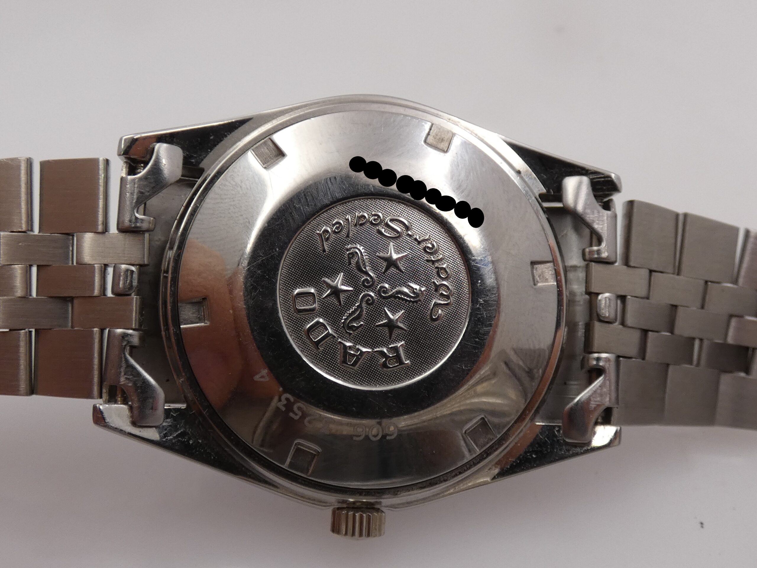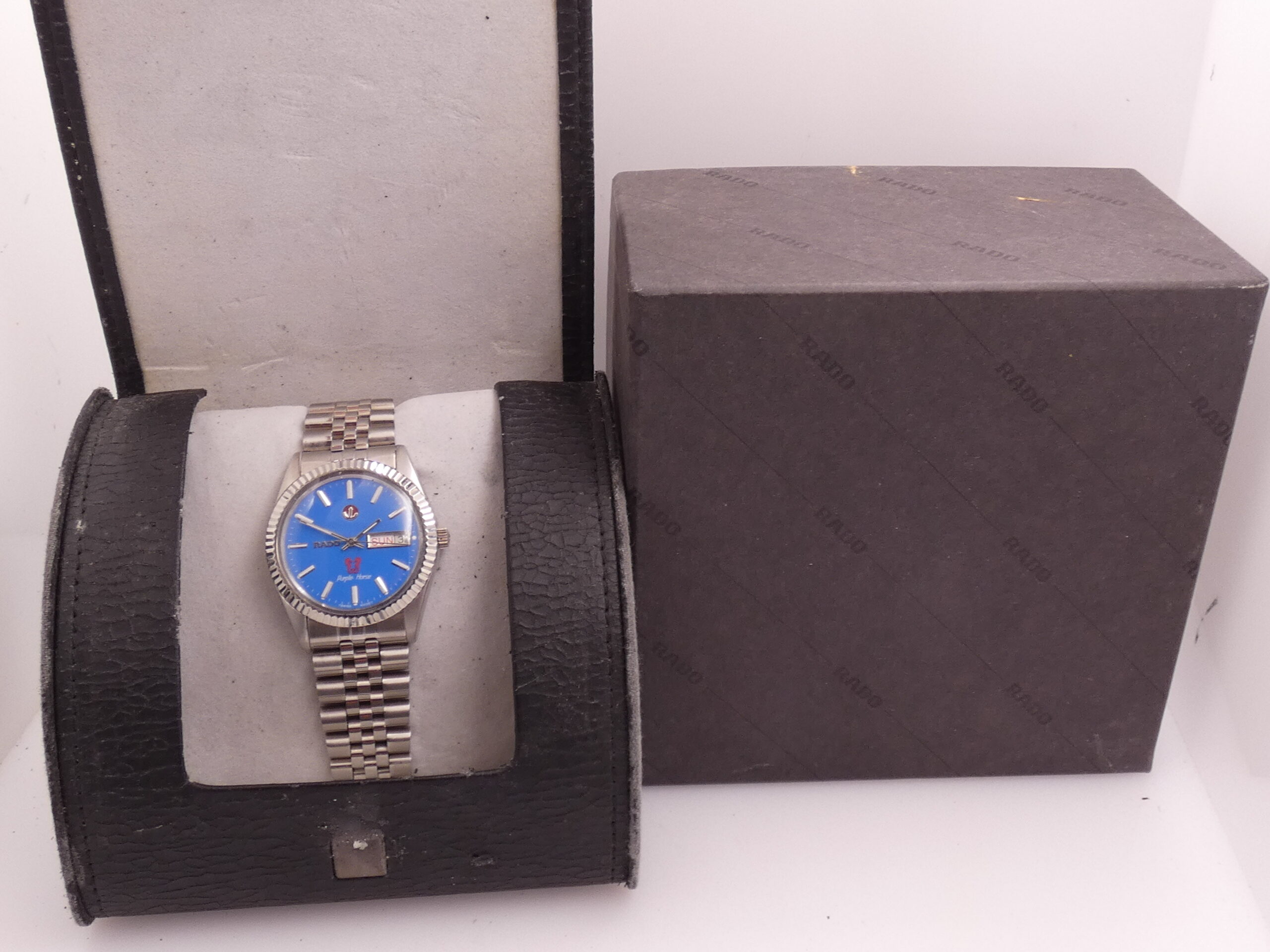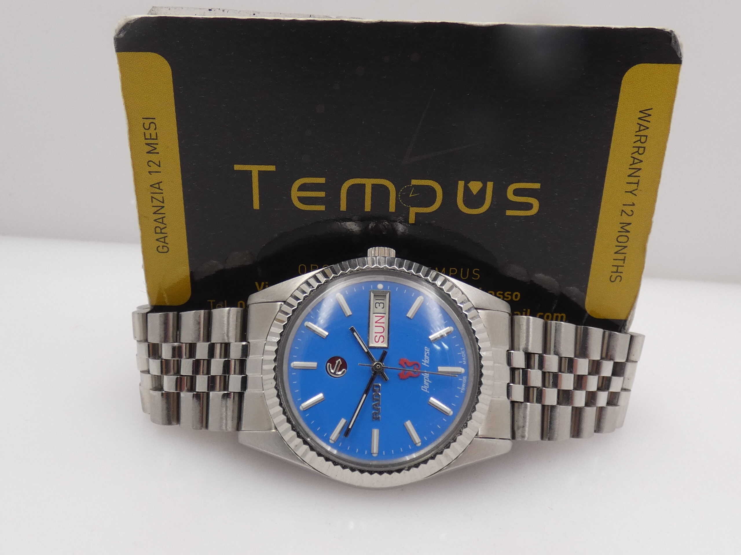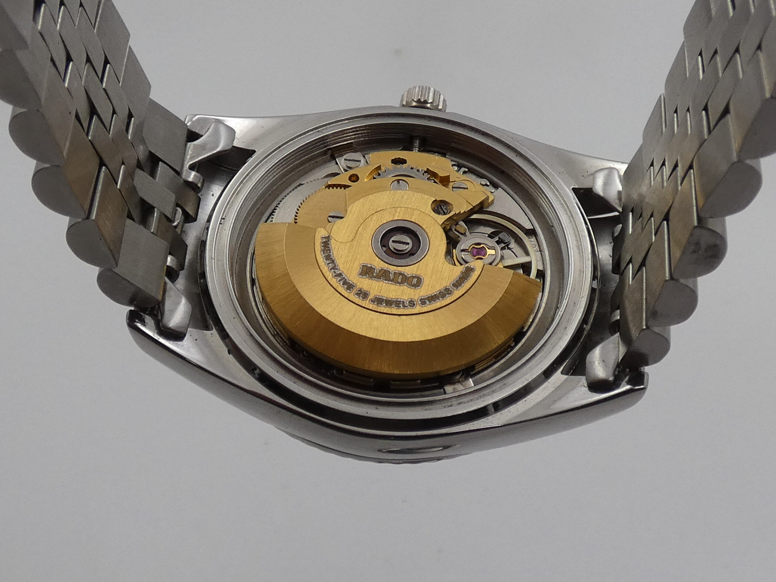 Quadrante: azzurro, con indici a barrette in acciaio, in rilievo e trattate al trizio, lancette a batone anch’esse in acciaio e trattate al trizio, secondi al centro, day-date (Inglese-Arabo) tramite finestrella al 3 con rimessa rapida in corona, logo Rado al 12 e al 9