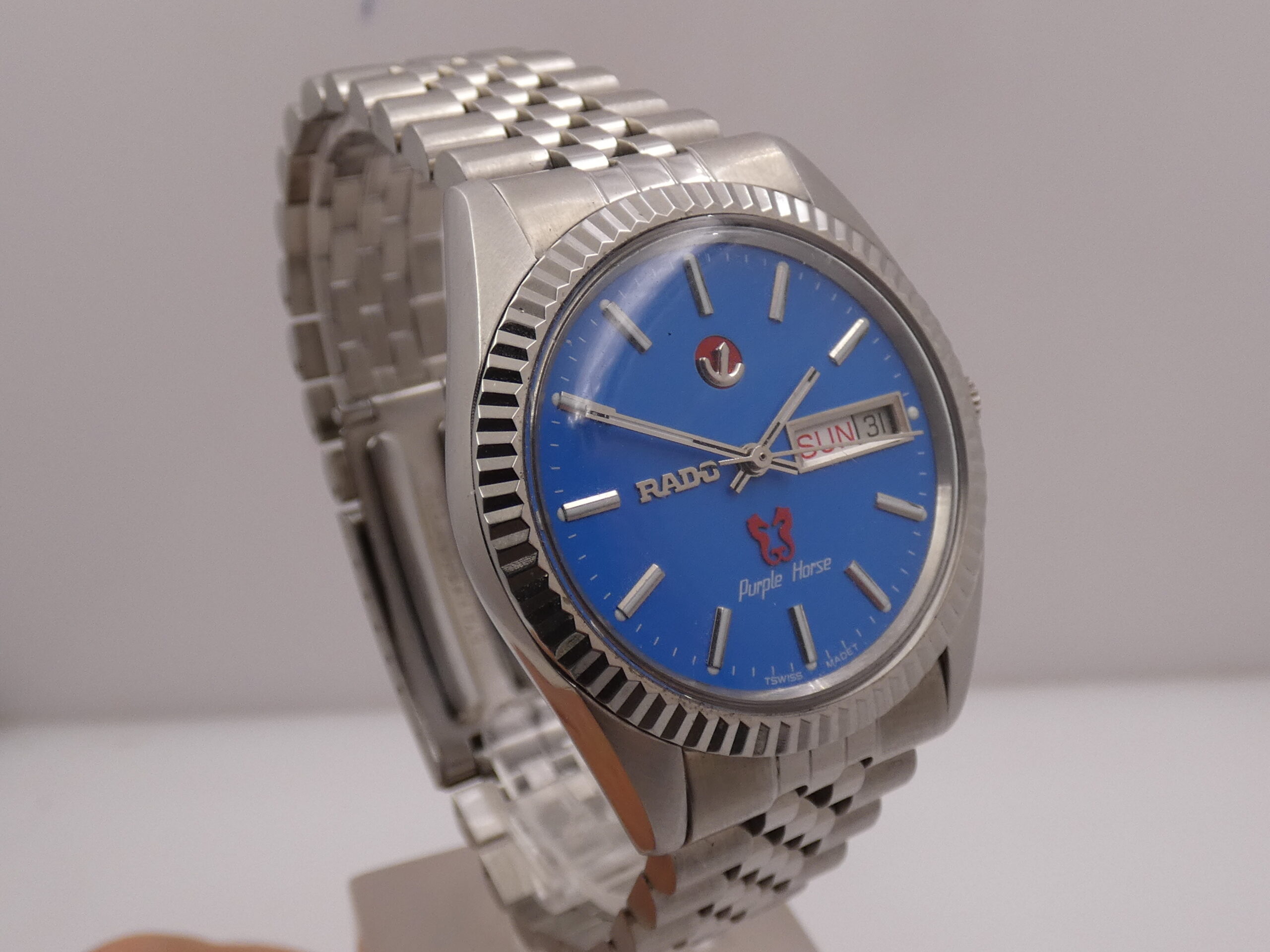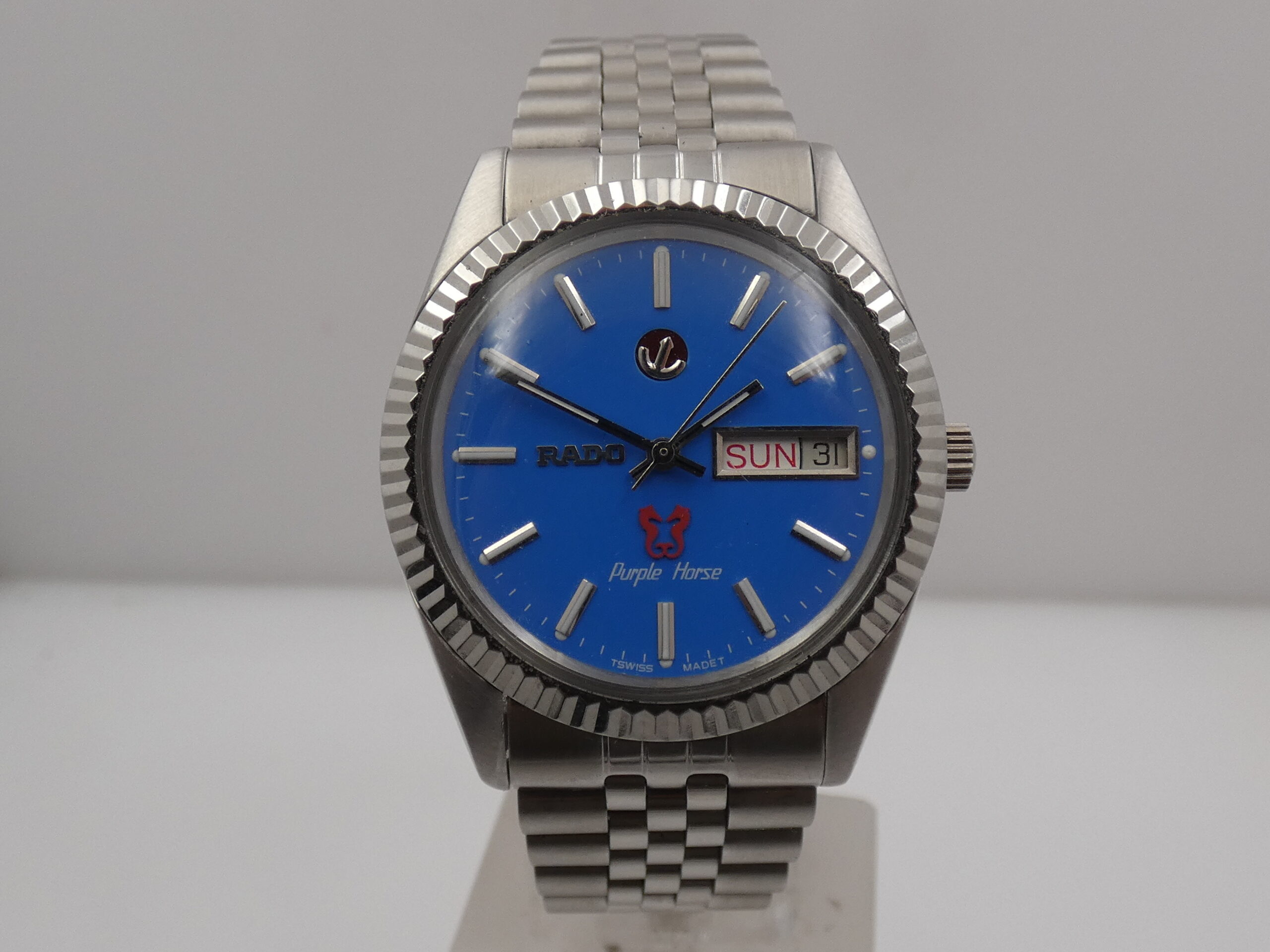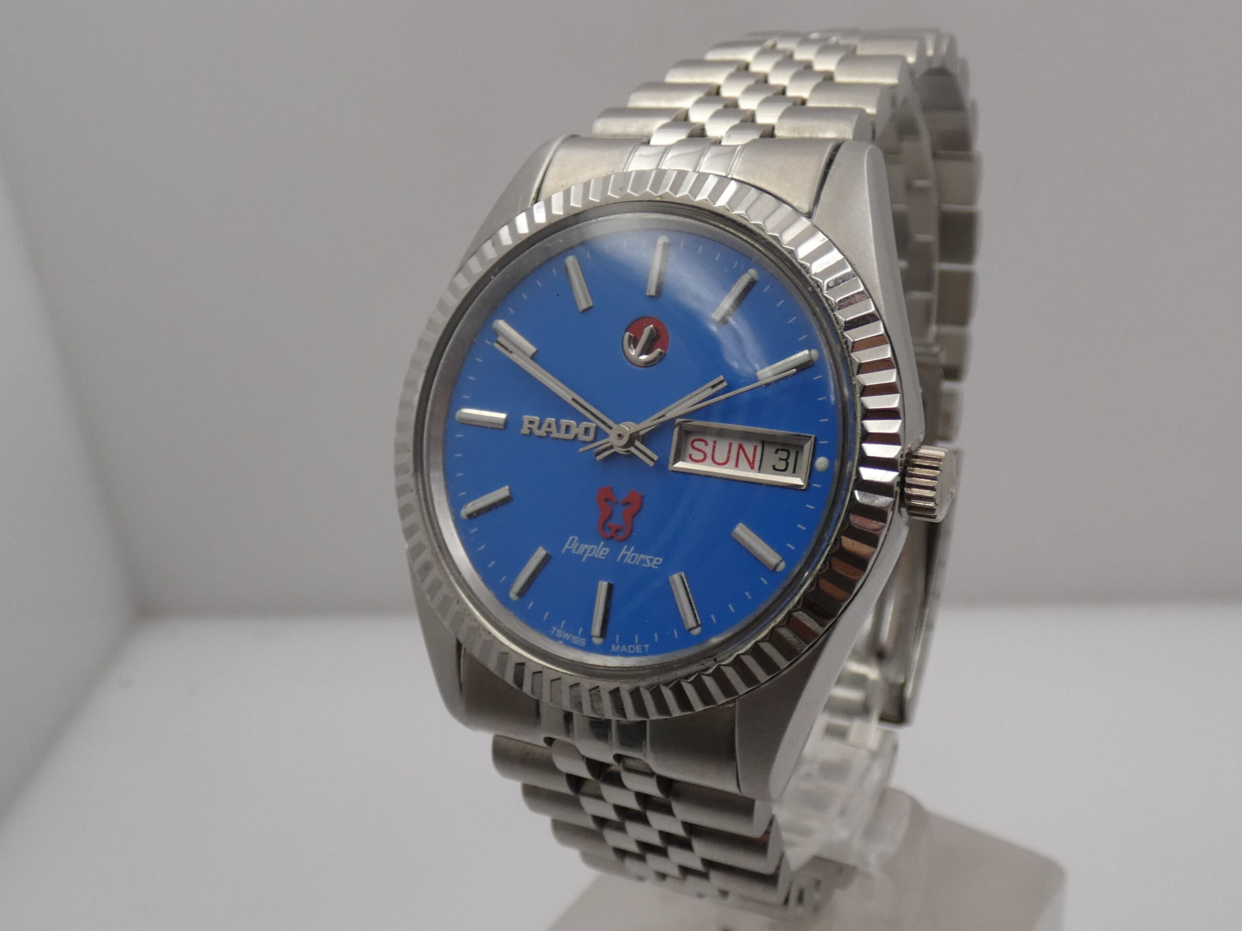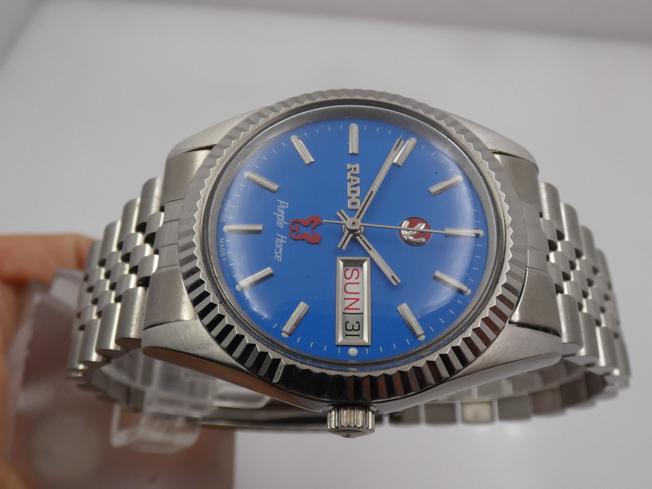 Model: Purple Horse Day-Date Reference: 606.3253.4 Year: 1970s Movement: Self-winding mechanical ETA 2878 caliber with 25 jewels Functions: Hours, minutes, seconds, day-date Case: All-steel Bezel: Fluted Crown: Original fluted Lugs: Curved Dimensions: 36 mm excluding crown, 43 mm at the lugs Crystal: Plexiglas Case back: Screw-down, featuring the brand logo Dial: Light blue, with raised, tritium-coated steel bar indexes, steel, tritium-coated baton hands, center seconds, day-date (English-Arabic) via a window at 3 o’clock with quick-set crown, Rado logo at 12 o’clock and at 9 Bracelet: Original, steel Jubilee Rado Clasp: Steel deployant with comfort adjustment, original RadoThe watch you see for sale is in excellent condition, in perfect working order, accurate, and reliable. It is completely original. It will be delivered with its original leather box (unfortunately damaged) and outer box, plus our 12-month warranty on proper functioning!!! It’s pictured. Vintage!!! WE WILL EXAMINE YOUR PRE-OWNED ITEM. WE SHIPP FREE WORLDWIDE. INTERNAL CODE: QCZ |