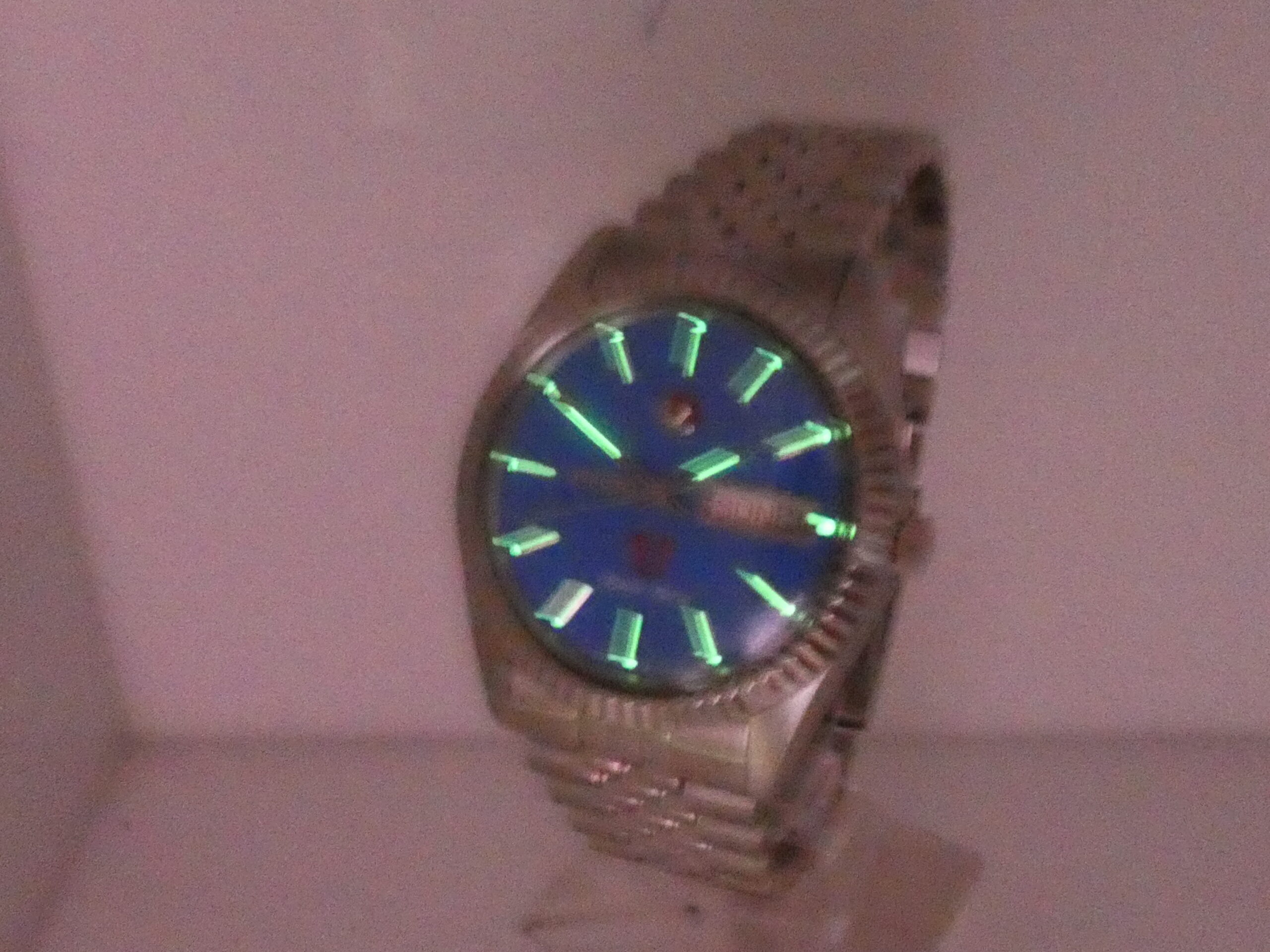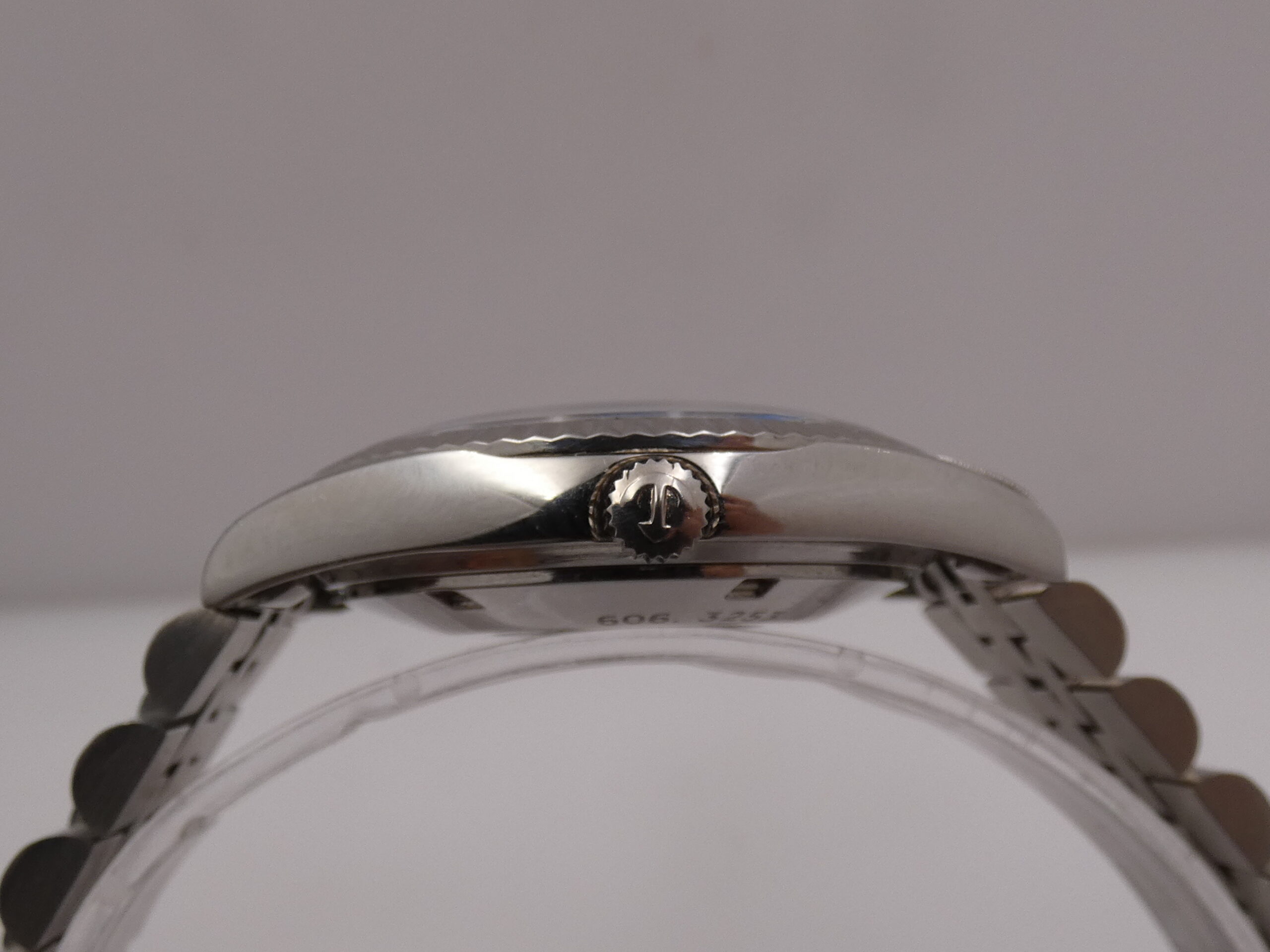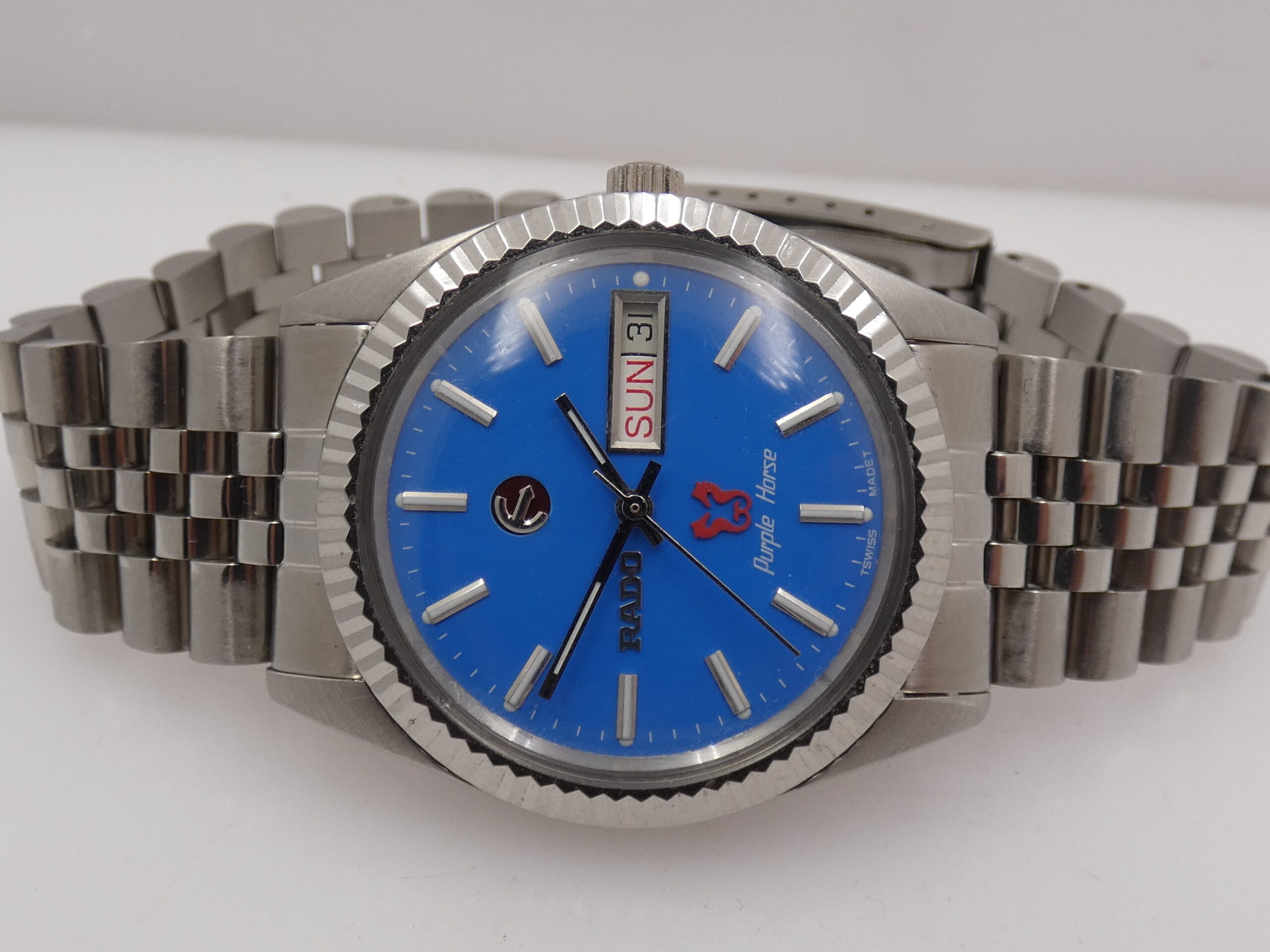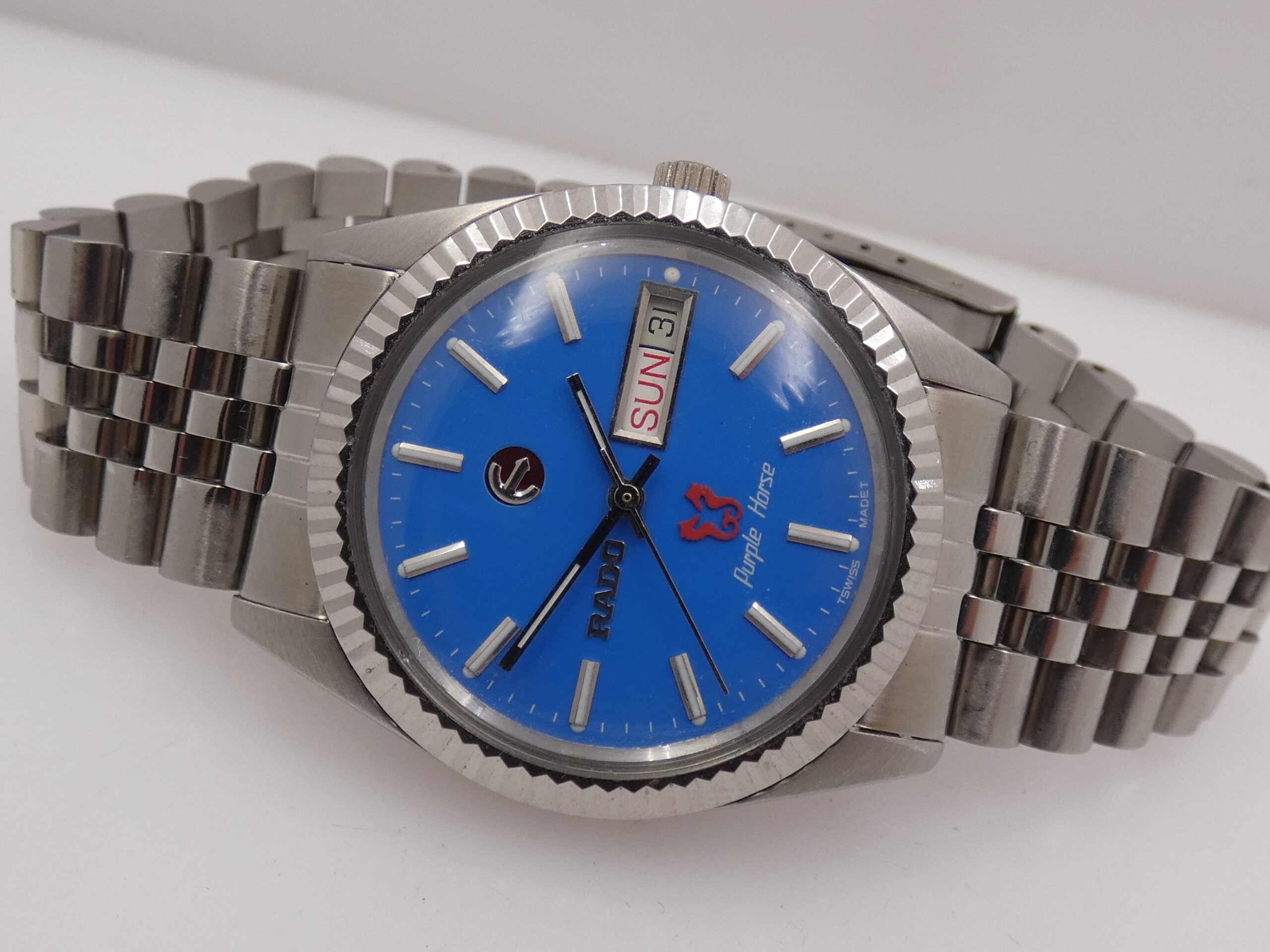 Model: Purple Horse Day-Date Reference: 606.3253.4 Year: 1970s Movement: Self-winding mechanical ETA 2878 caliber with 25 jewels Functions: Hours, minutes, seconds, day-date Case: All-steel Bezel: Fluted Crown: Original fluted Lugs: Curved Dimensions: 36 mm excluding crown, 43 mm at the lugs Crystal: Plexiglas Case back: Screw-down, featuring the brand logo Dial: Light blue, with raised, tritium-coated steel bar indexes, steel, tritium-coated baton hands, center seconds, day-date (English-Arabic) via a window at 3 o’clock with quick-set crown, Rado logo at 12 o’clock and at 9 Bracelet: Original, steel Jubilee Rado Clasp: Steel deployant with comfort adjustment, original RadoThe watch you see for sale is in excellent condition, in perfect working order, accurate, and reliable. It is completely original. It will be delivered with its original leather box (unfortunately damaged) and outer box, plus our 12-month warranty on proper functioning!!! It’s pictured. Vintage!!! WE WILL EXAMINE YOUR PRE-OWNED ITEM. WE SHIPP FREE WORLDWIDE. INTERNAL CODE: QCZ |