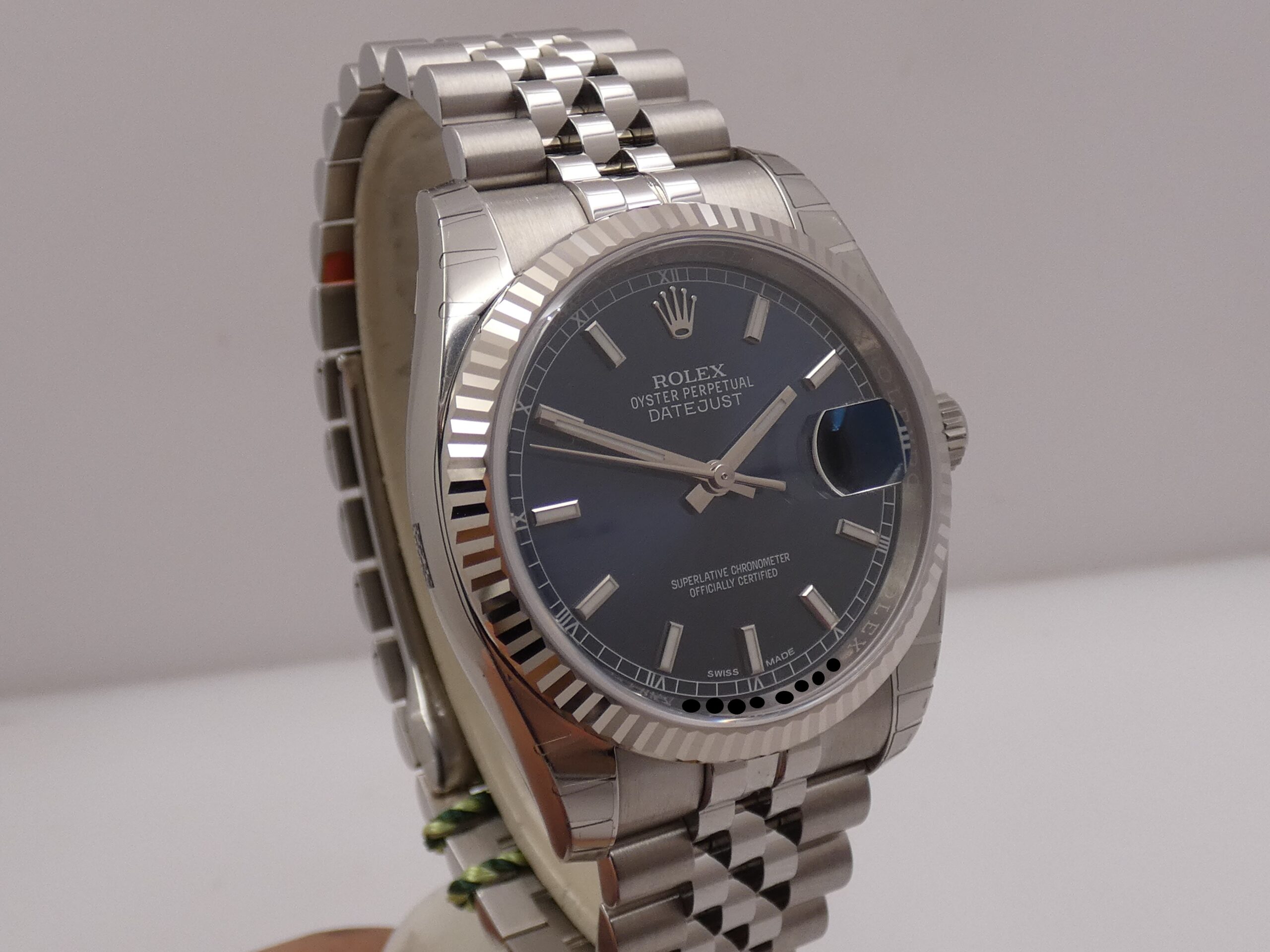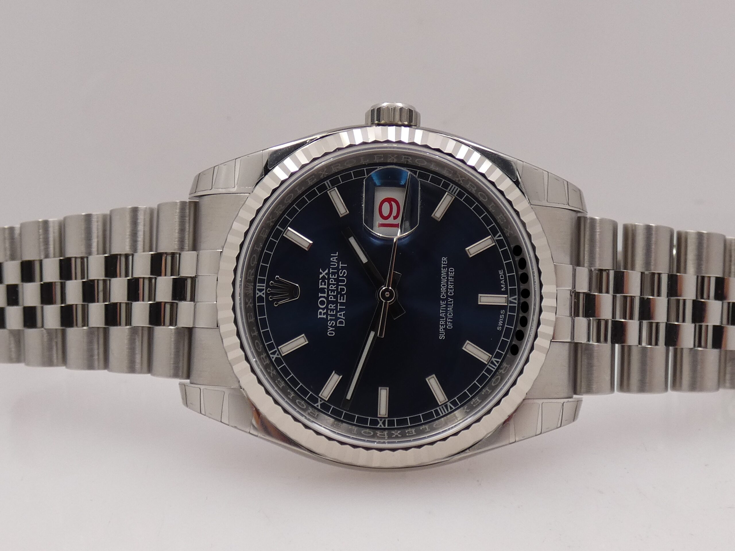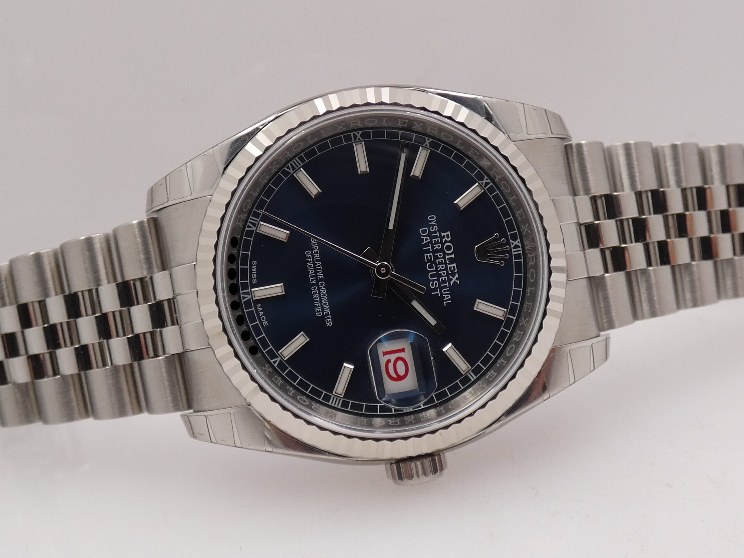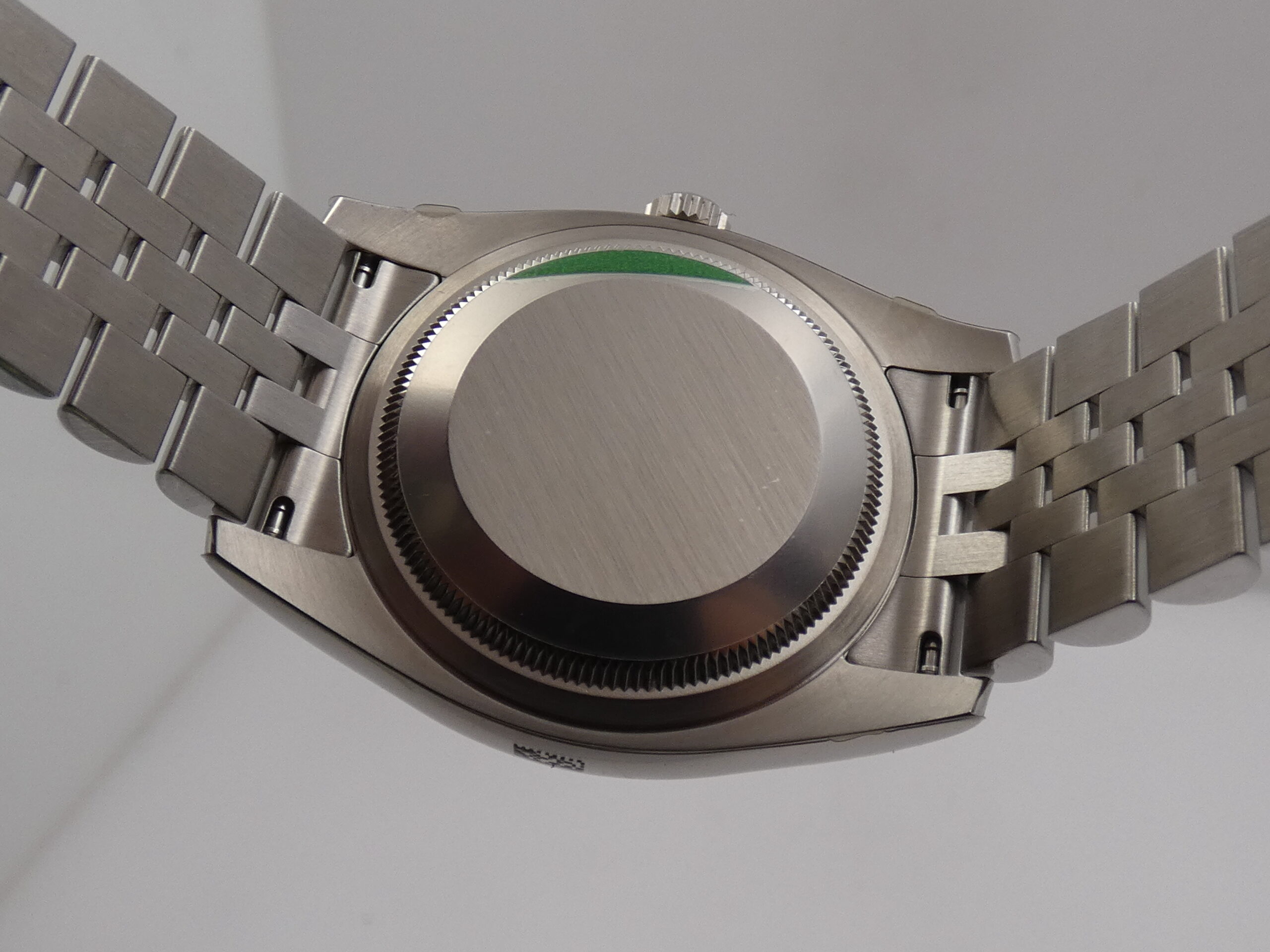 Quadrante: blue soleil, con indici a barretta, romani in corrispondenza, in acciaio, in rilievo e trattati con materiale lumiescente, lancette a bastone, anch’esse in acciaio e luminescenti, secondi al centro, datario roulette (numeri pari neri e numeri dispari rossi) al 3 con lente magnificatrice e rimessa rapida in corona, scala sessantesimale a Chemin De Fer, logo Rolex al 12