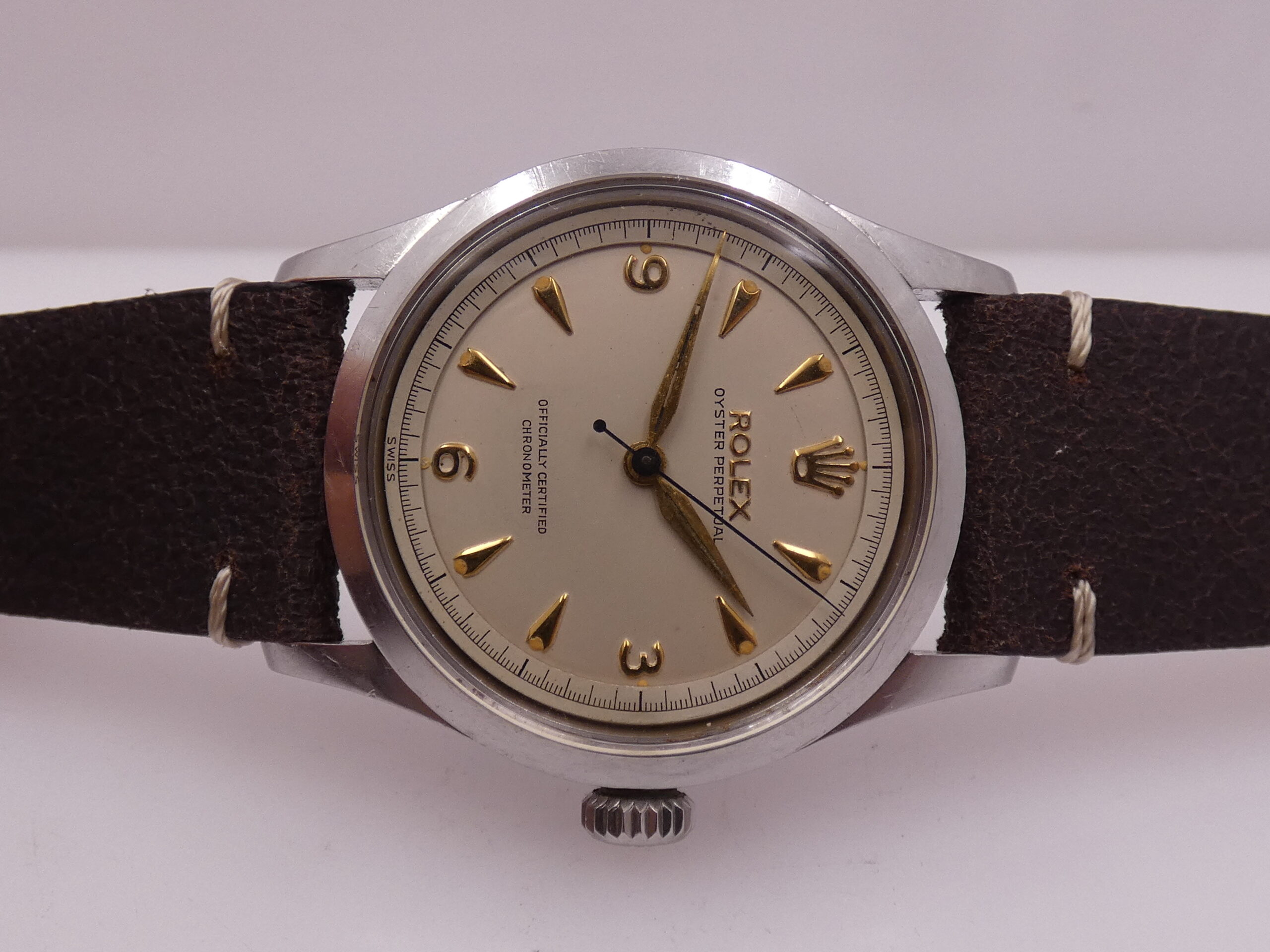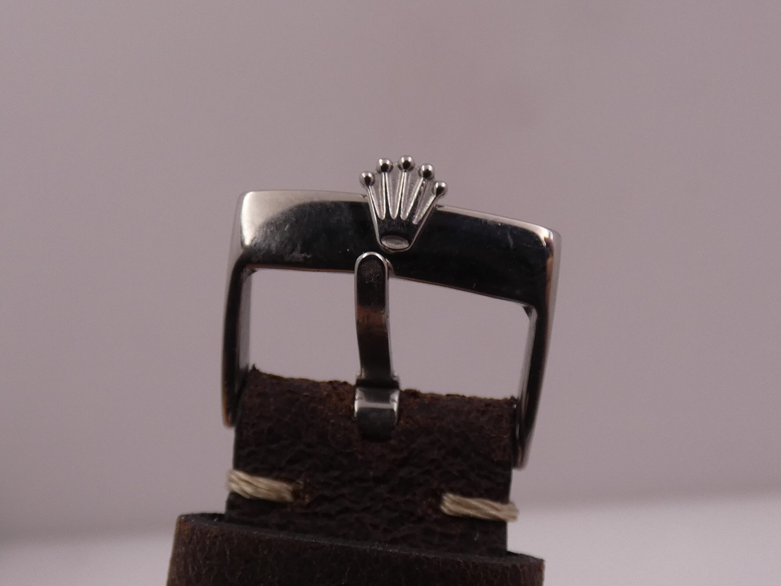 Dial: Silvered, Explorer-style (professionally refurbished), geometric hour markers, Arabic numerals 3, 6, and 9, gold and embossed, gold leaf hands, center seconds, Chemin de Fer scale on the flange, Rolex logo at 12 o’clock