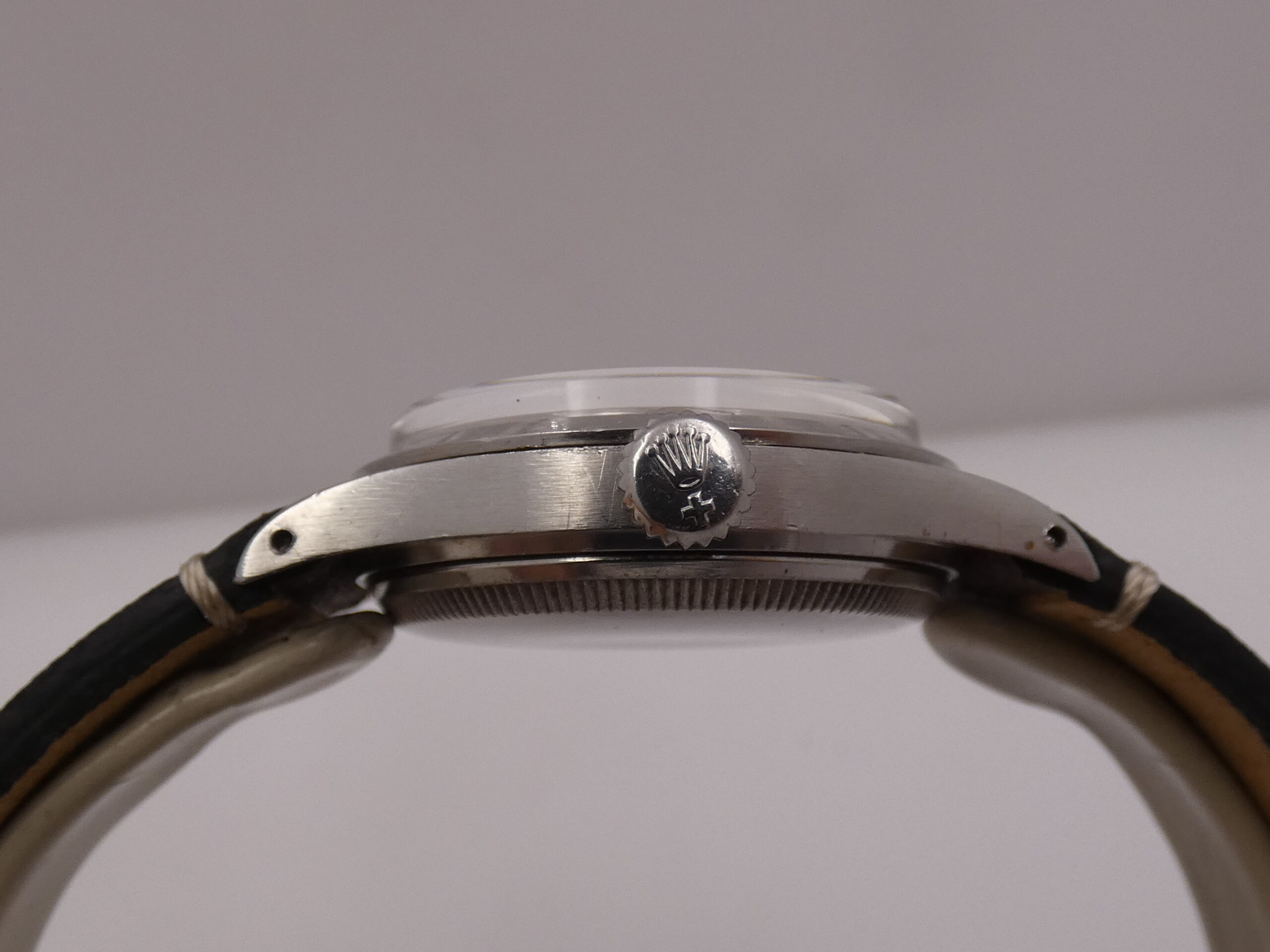 Quadrante: argentè, stile Explorer, (rigenerato in maniera professionale), indici geometrici, arabi 3-6-9, in oro ed in rilievo, lancette a foglia anch’esse in oro, secondi al centro, scala sessantesimale a Chemin de Fer sul rehaut, logo Rolex al 12