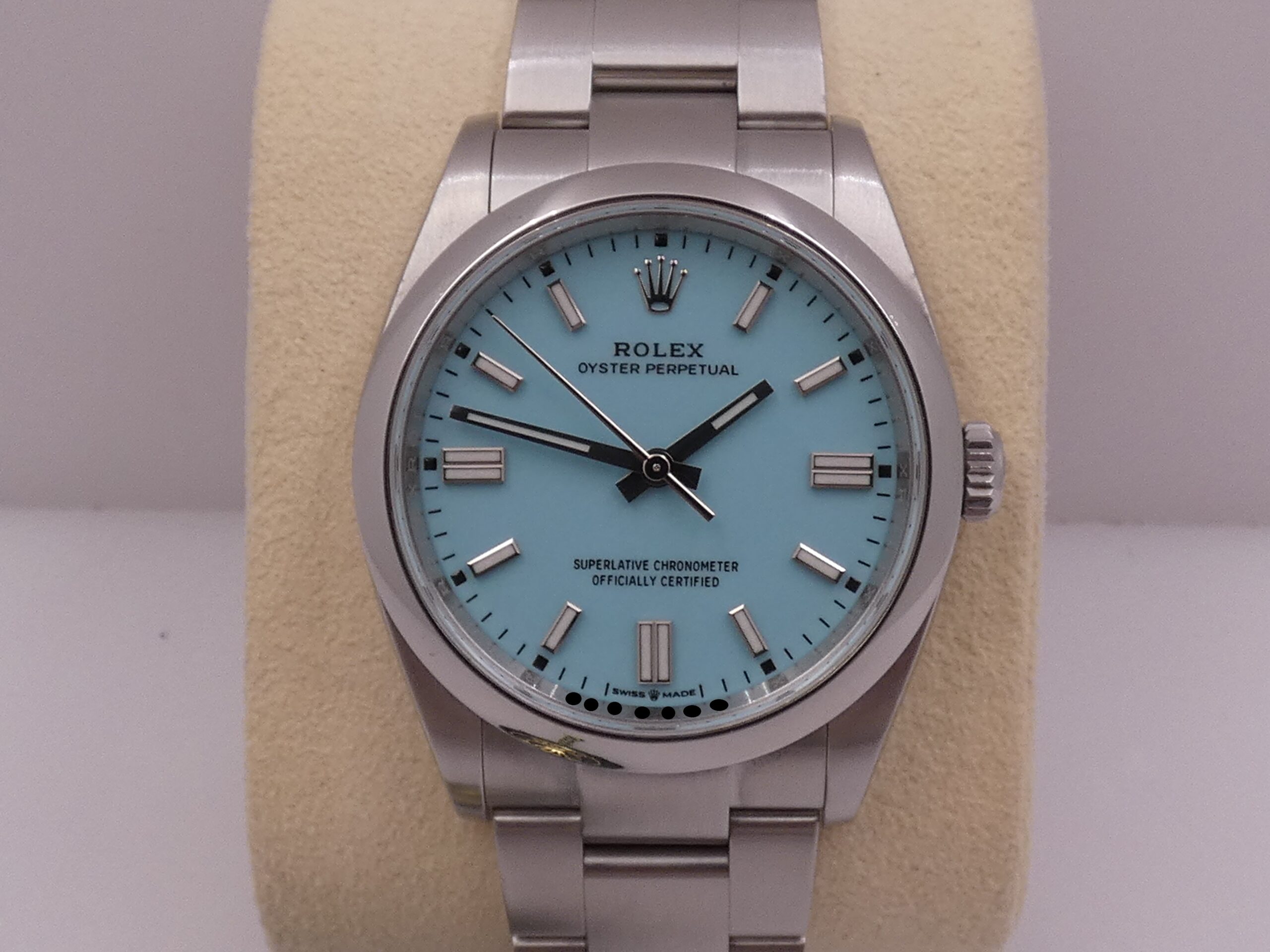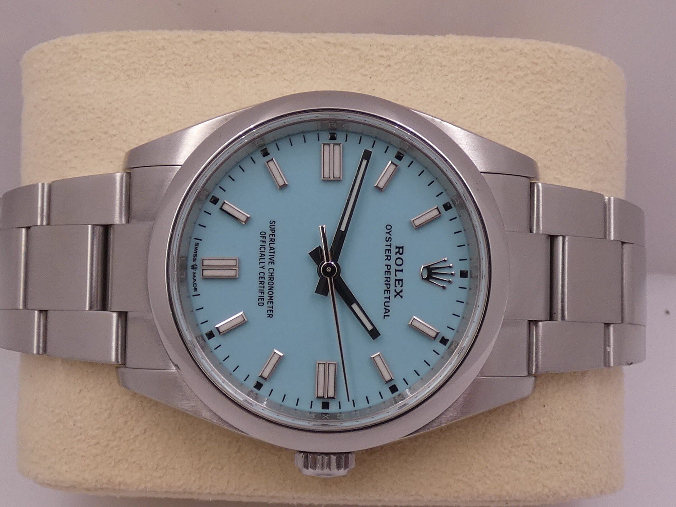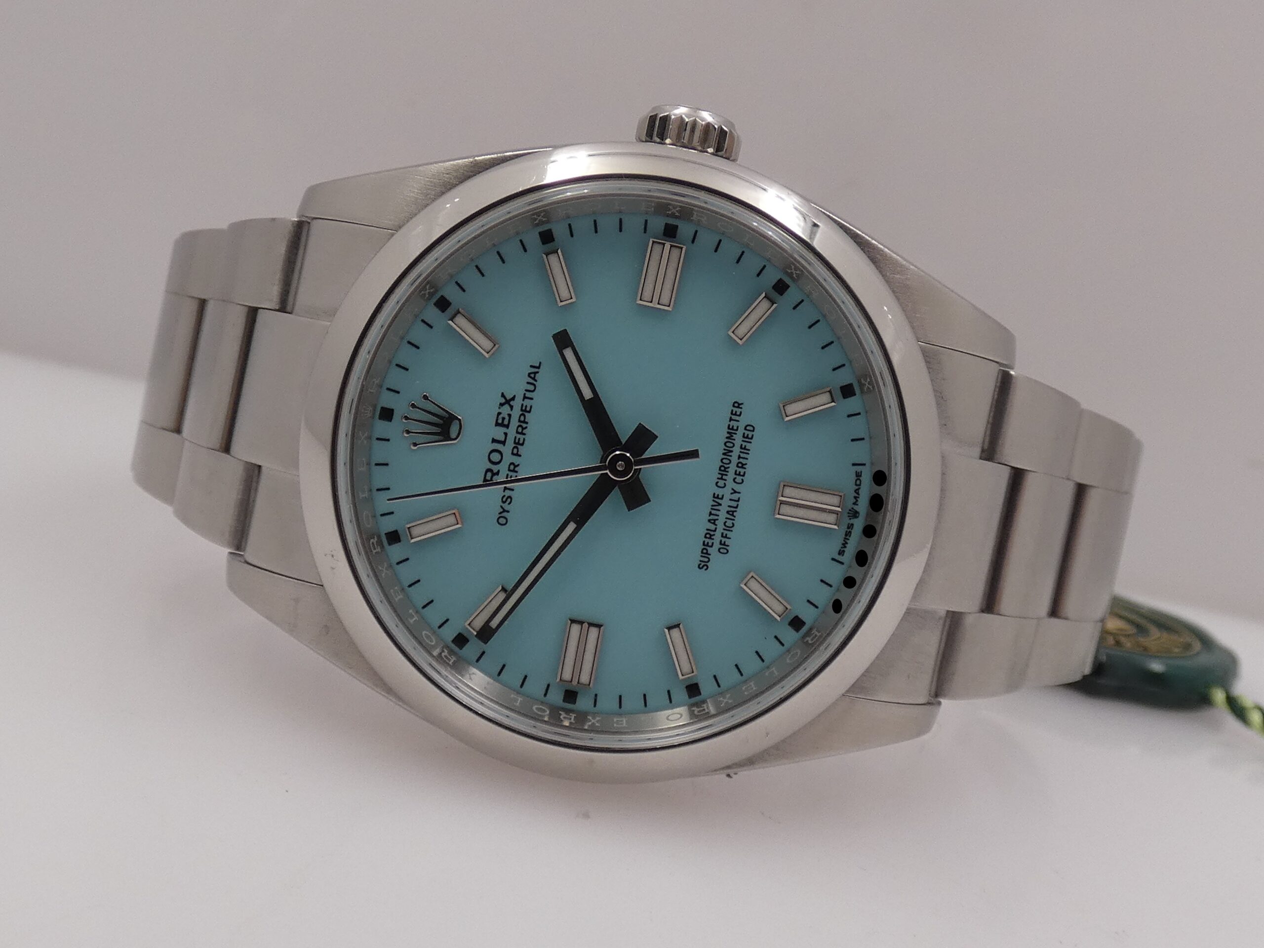 Model: Oyster Perpetual 36 Reference: 126000 Year: May 2022 Movement: Rolex-manufactured self-winding mechanical movement, caliber 3230, officially chronometer-certified by the C.O.S.C. Functions: Hours, minutes, seconds Case: Oyster, all-steel Bezel: Smooth Crown: Original Screw-Down Lugs: Curved Dimensions: 36 mm excluding crown, 43 mm at the lugs Crystal: Sapphire, with Rolex hologram at 6 o’clock, visible when held up to the light Case Back: Screw-Down Dial: Tiffany, with raised steel bar indexes and luminescent coating, steel baton hands, center seconds, 60-minute scale, Rolex logo at 12 o’clock Bracelet: Oyster, SEL, steel, original Rolex Clasp: Steel folding clasp, original RolexThe watch you see for sale is in EXCELLENT condition, in perfect working order, accurate and reliable, and waterproof: its water resistance has been tested and is visible in the photos. It is completely original. It will be delivered to you with its original Rolex box, outer box, manuals, leather document holder, C.O.S.C. seal, and Italian warranty dated May 2022!!! It’s in the photo. SPECTACULAR!!! WE WILL EXAMINE YOUR PRE-OWNED ITEM. WE SHIPPED FREE WORLDWIDE. INTERNAL CODE: UUCZZ DO YOU HAVE THE SAME WATCH AND WANT TO SELL IT???? …..WE WILL TRY TO GIVE YOU THE BEST QUOTE