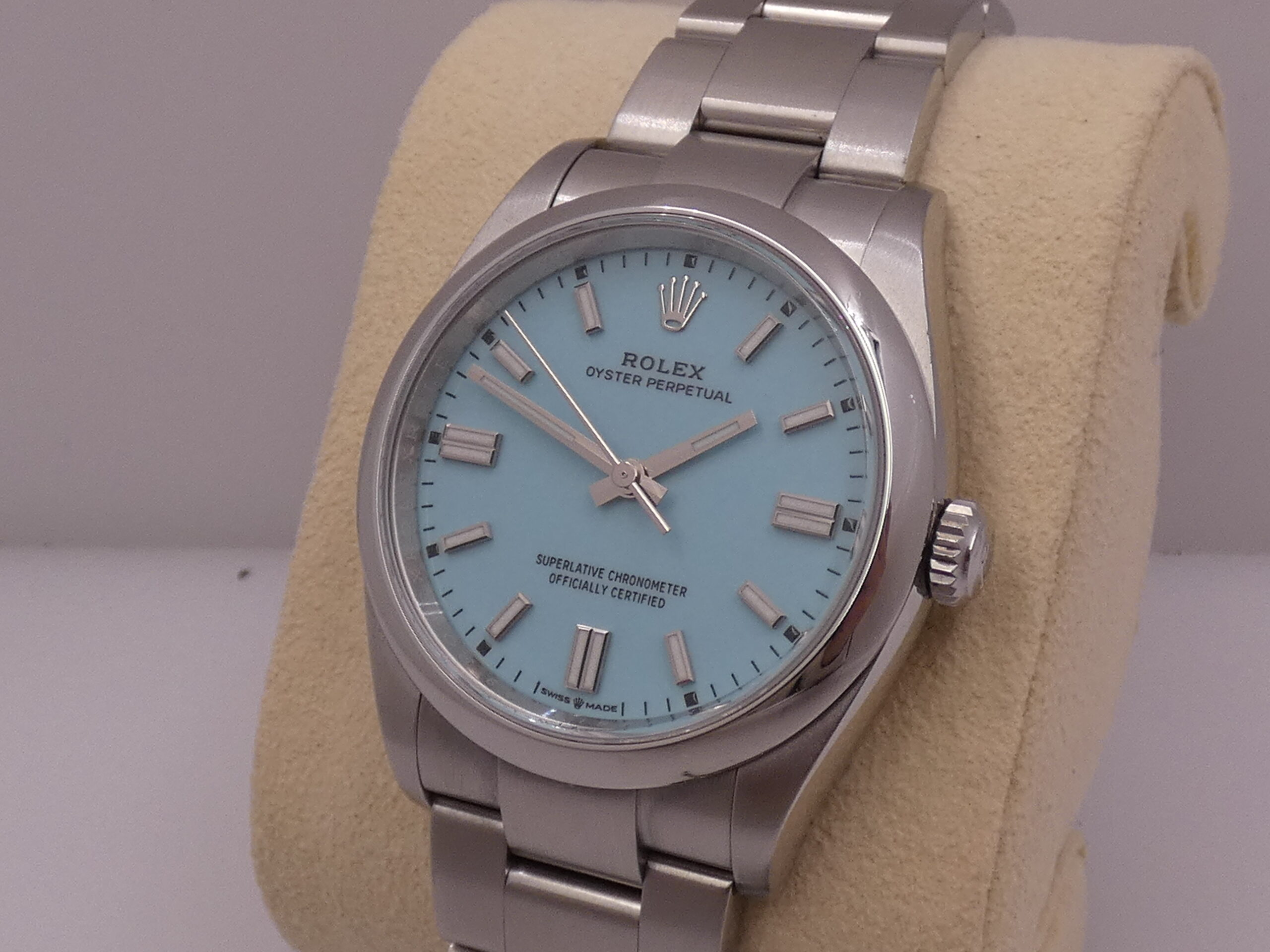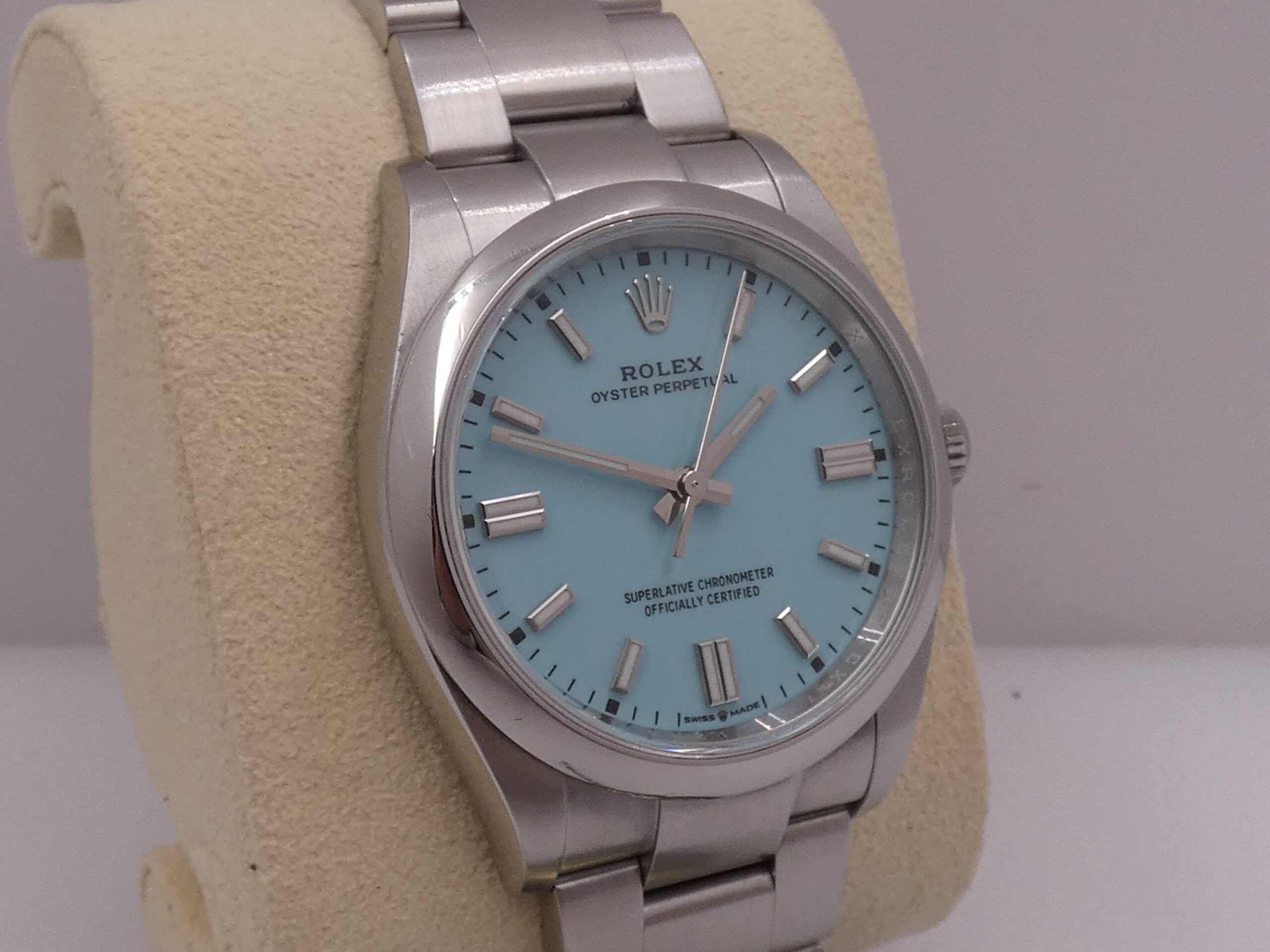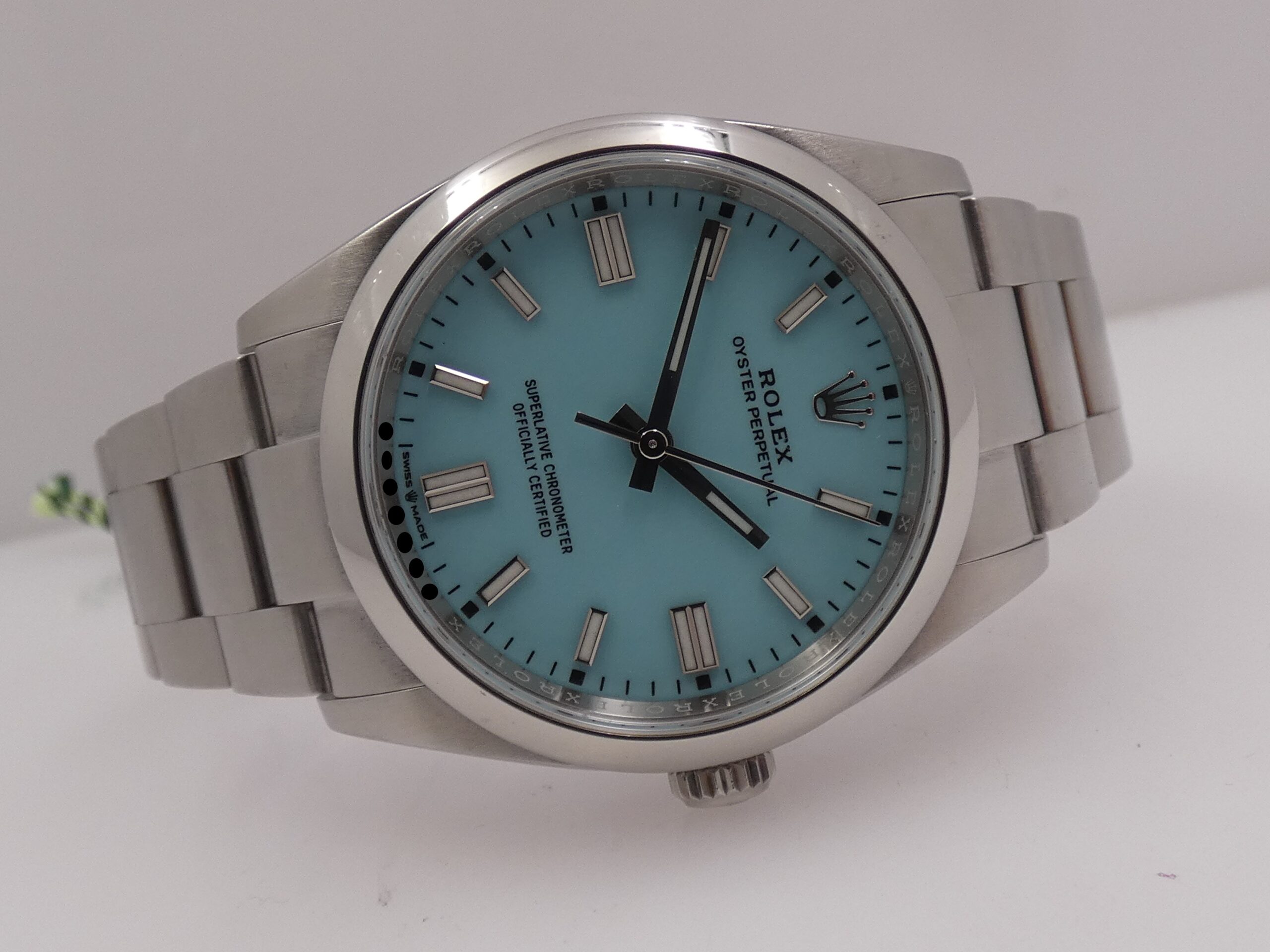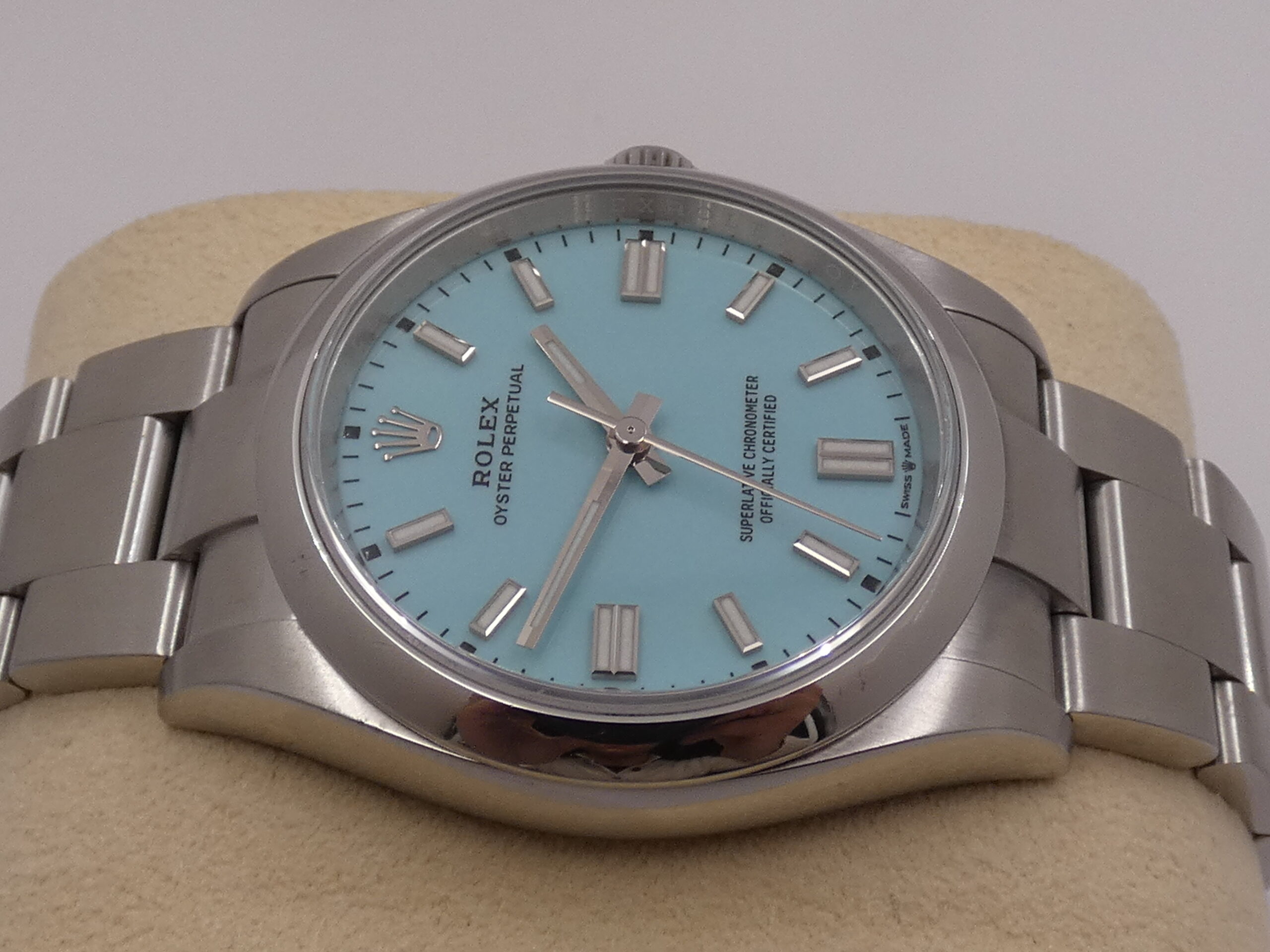 Model: Oyster Perpetual 36 Reference: 126000 Year: May 2022 Movement: Rolex-manufactured self-winding mechanical movement, caliber 3230, officially chronometer-certified by the C.O.S.C. Functions: Hours, minutes, seconds Case: Oyster, all-steel Bezel: Smooth Crown: Original Screw-Down Lugs: Curved Dimensions: 36 mm excluding crown, 43 mm at the lugs Crystal: Sapphire, with Rolex hologram at 6 o’clock, visible when held up to the light Case Back: Screw-Down Dial: Tiffany, with raised steel bar indexes and luminescent coating, steel baton hands, center seconds, 60-minute scale, Rolex logo at 12 o’clock Bracelet: Oyster, SEL, steel, original Rolex Clasp: Steel folding clasp, original RolexThe watch you see for sale is in EXCELLENT condition, in perfect working order, accurate and reliable, and waterproof: its water resistance has been tested and is visible in the photos. It is completely original. It will be delivered to you with its original Rolex box, outer box, manuals, leather document holder, C.O.S.C. seal, and Italian warranty dated May 2022!!! It’s in the photo. SPECTACULAR!!! WE WILL EXAMINE YOUR PRE-OWNED ITEM. WE SHIPPED FREE WORLDWIDE. INTERNAL CODE: UUCZZ DO YOU HAVE THE SAME WATCH AND WANT TO SELL IT???? …..WE WILL TRY TO GIVE YOU THE BEST QUOTE