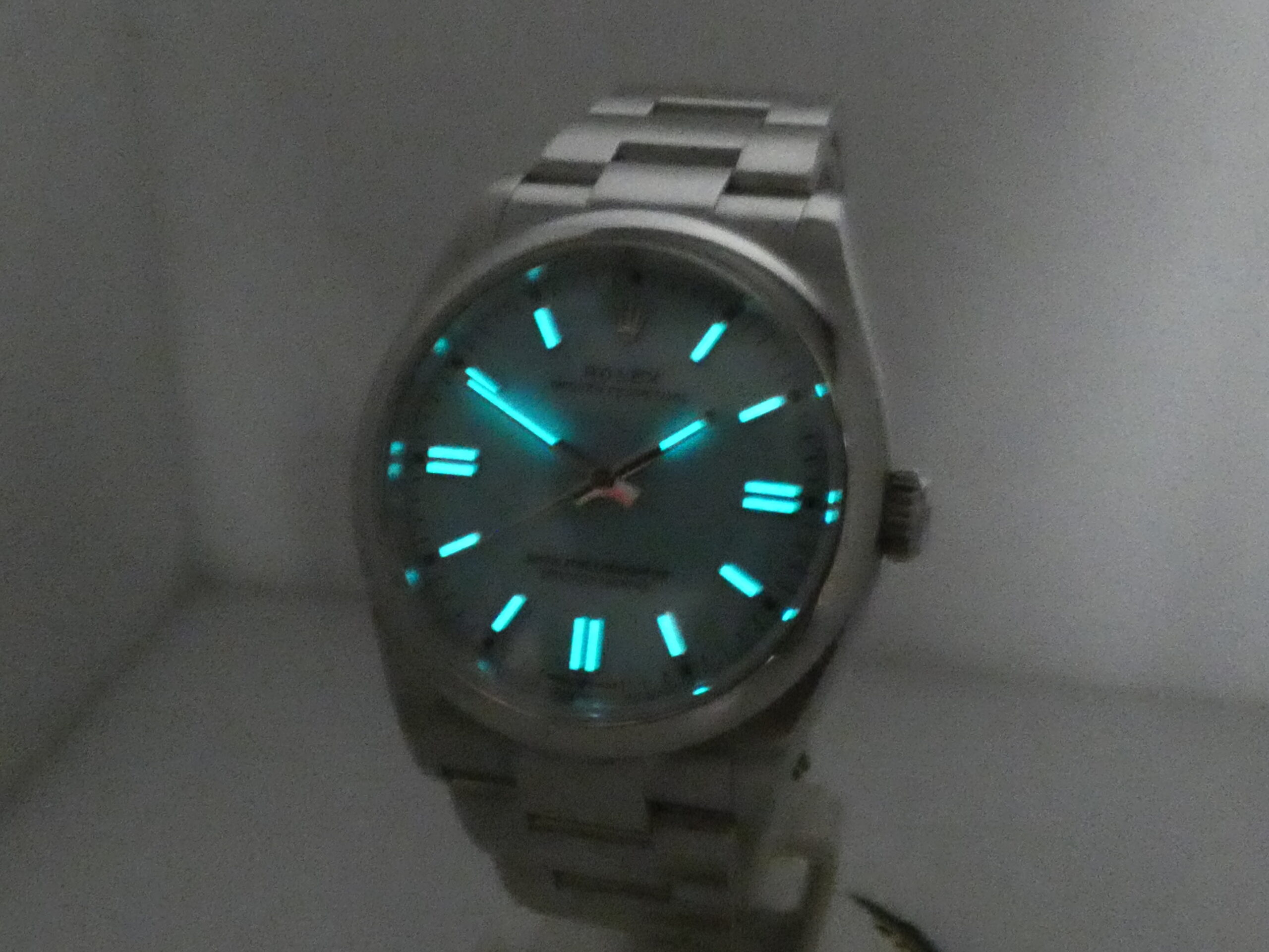 Quadrante: Tiffany, con indici a barretta in acciaio, in rilievo e trattati con materiale luminescente, lancette a bastone, anch’esse in acciaio e luminescenti, secondi al centro, scala sessantesimale, logo Rolex al 12