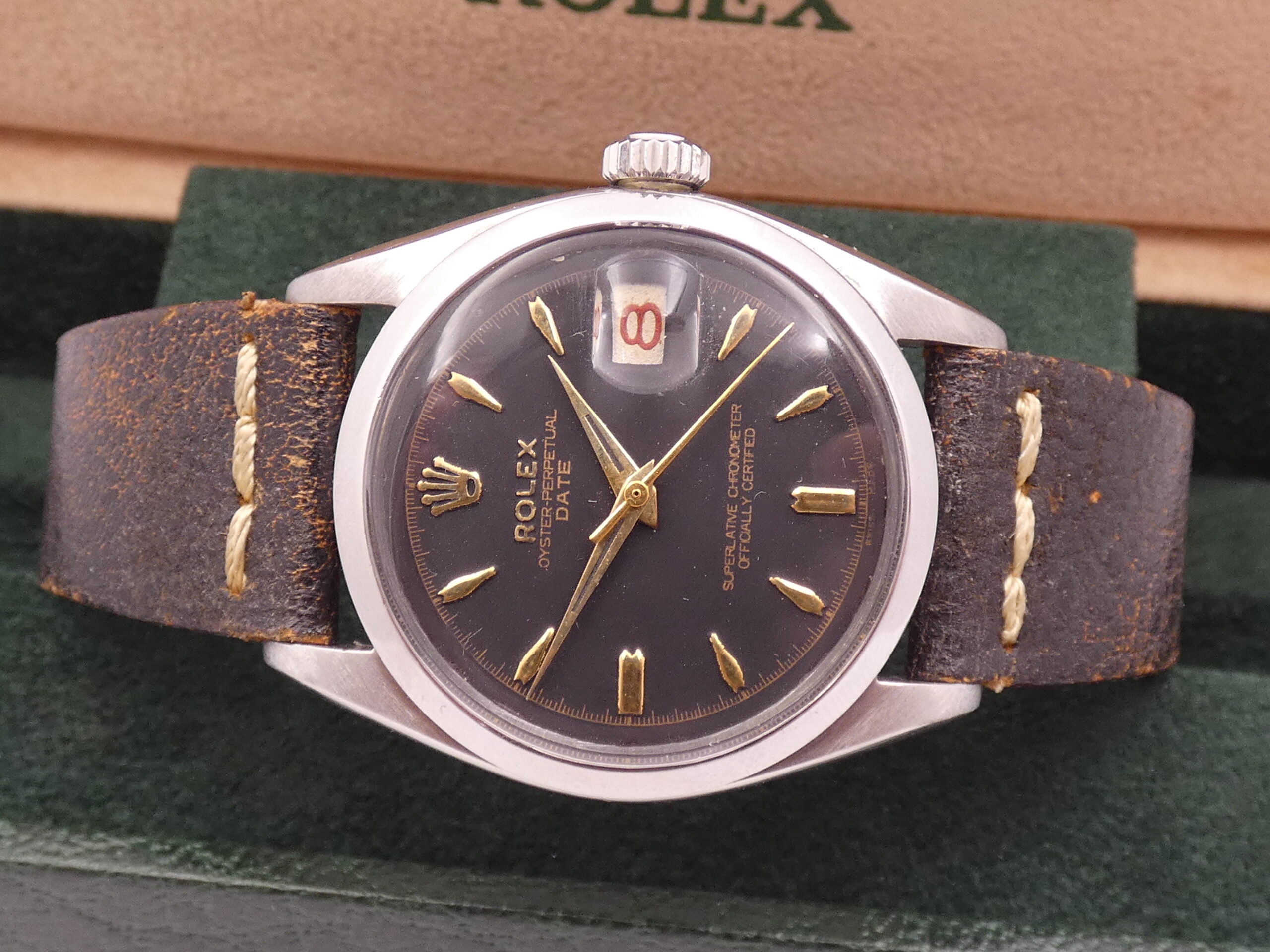 Dial: Gilt, black, with gold and raised geometric indexes, gold Dauphine hands, center seconds, roulette date display at 3 o’clock with magnifying glass (even red numerals and odd black numerals), 60-minute scale with closed minute track and 1/5th of a second division, Rolex logo at 12 o’clock