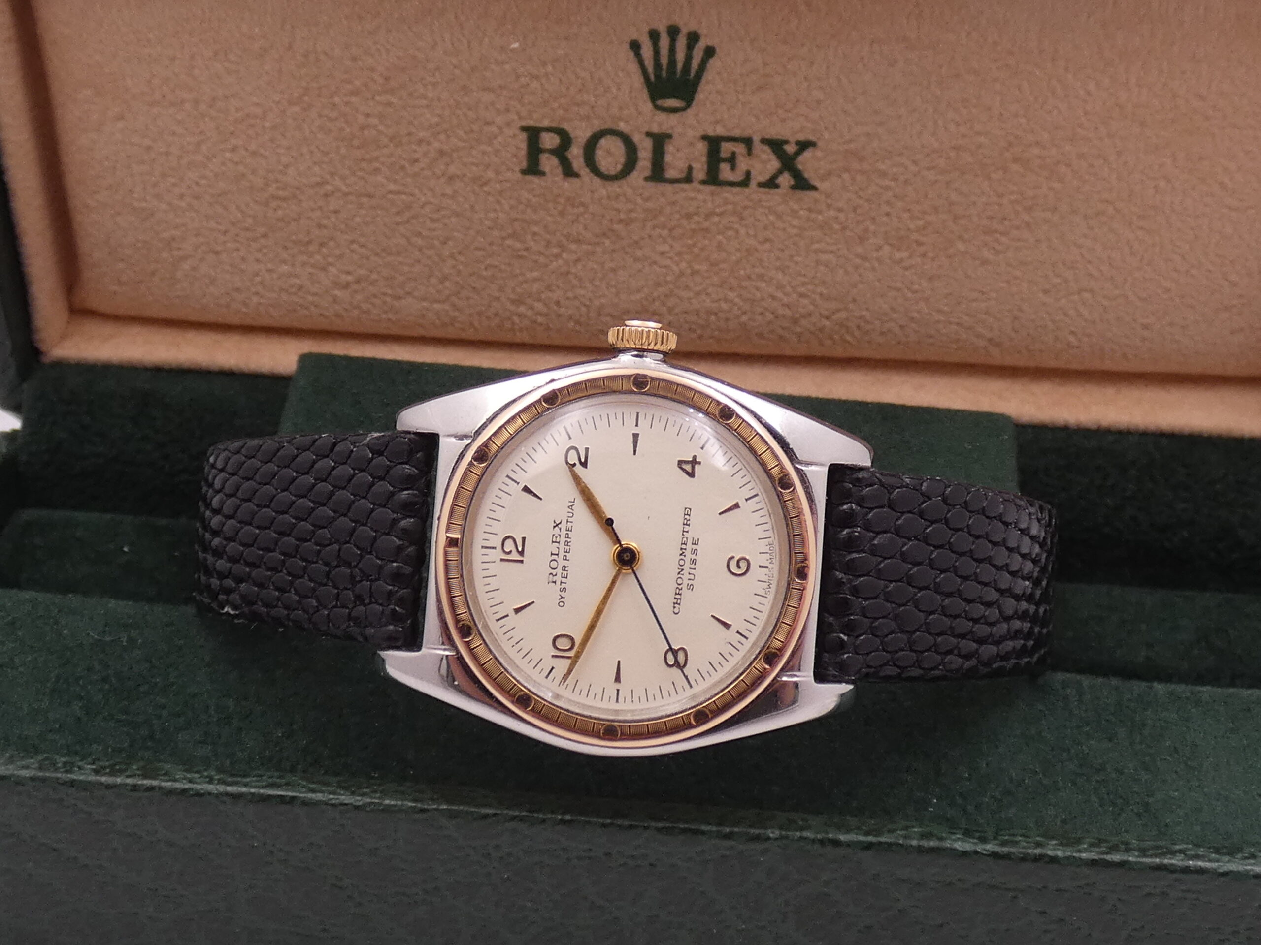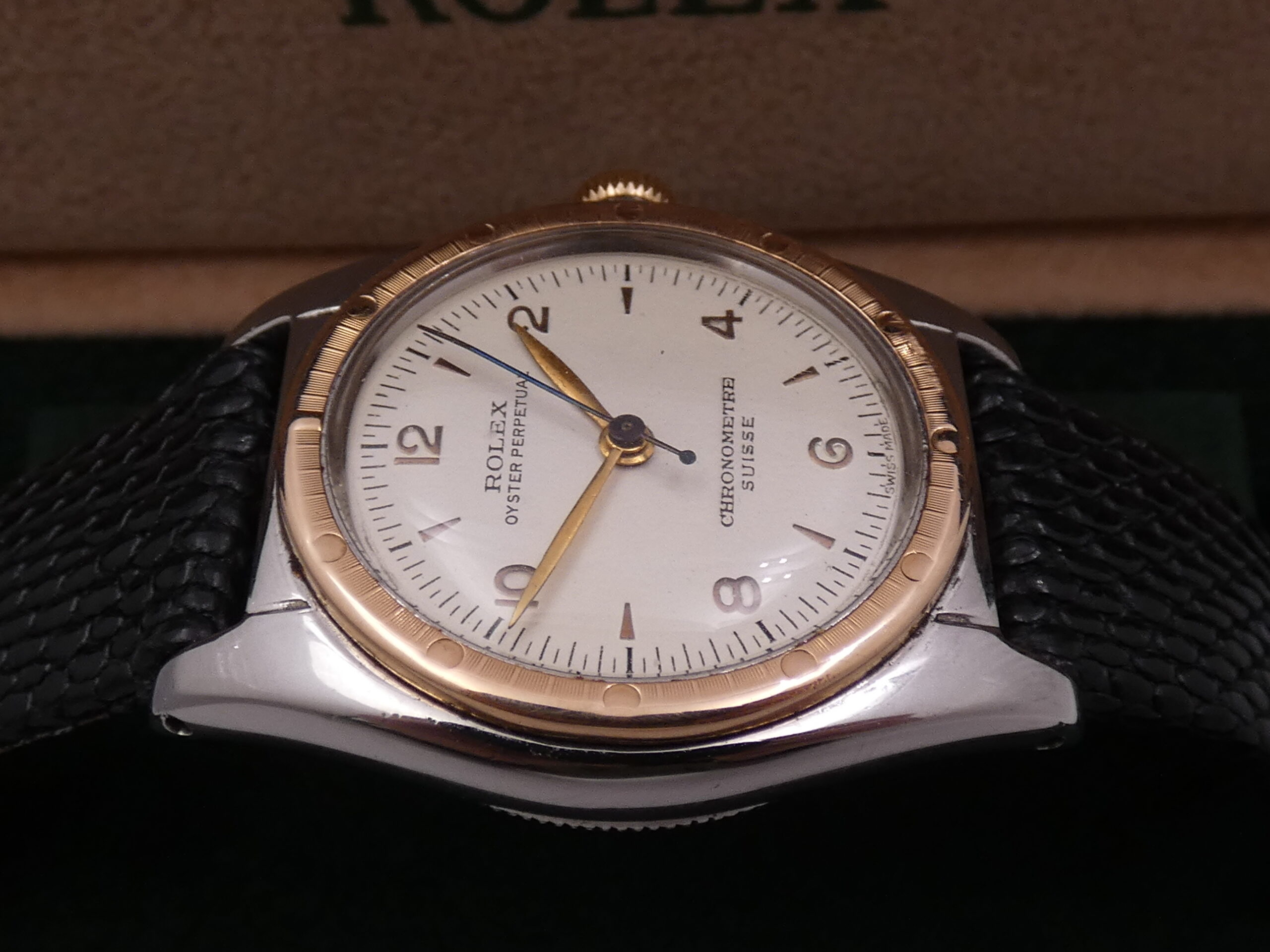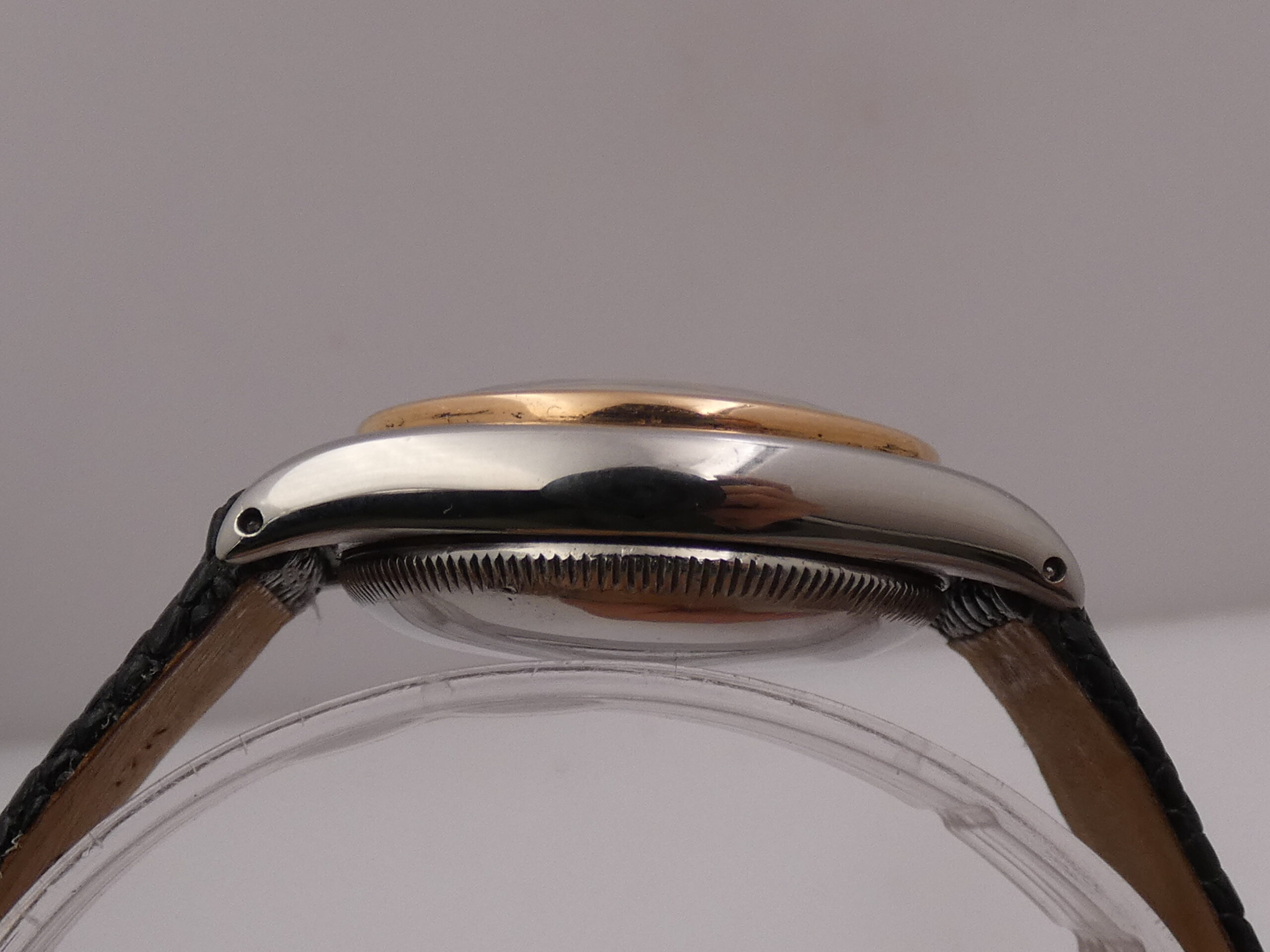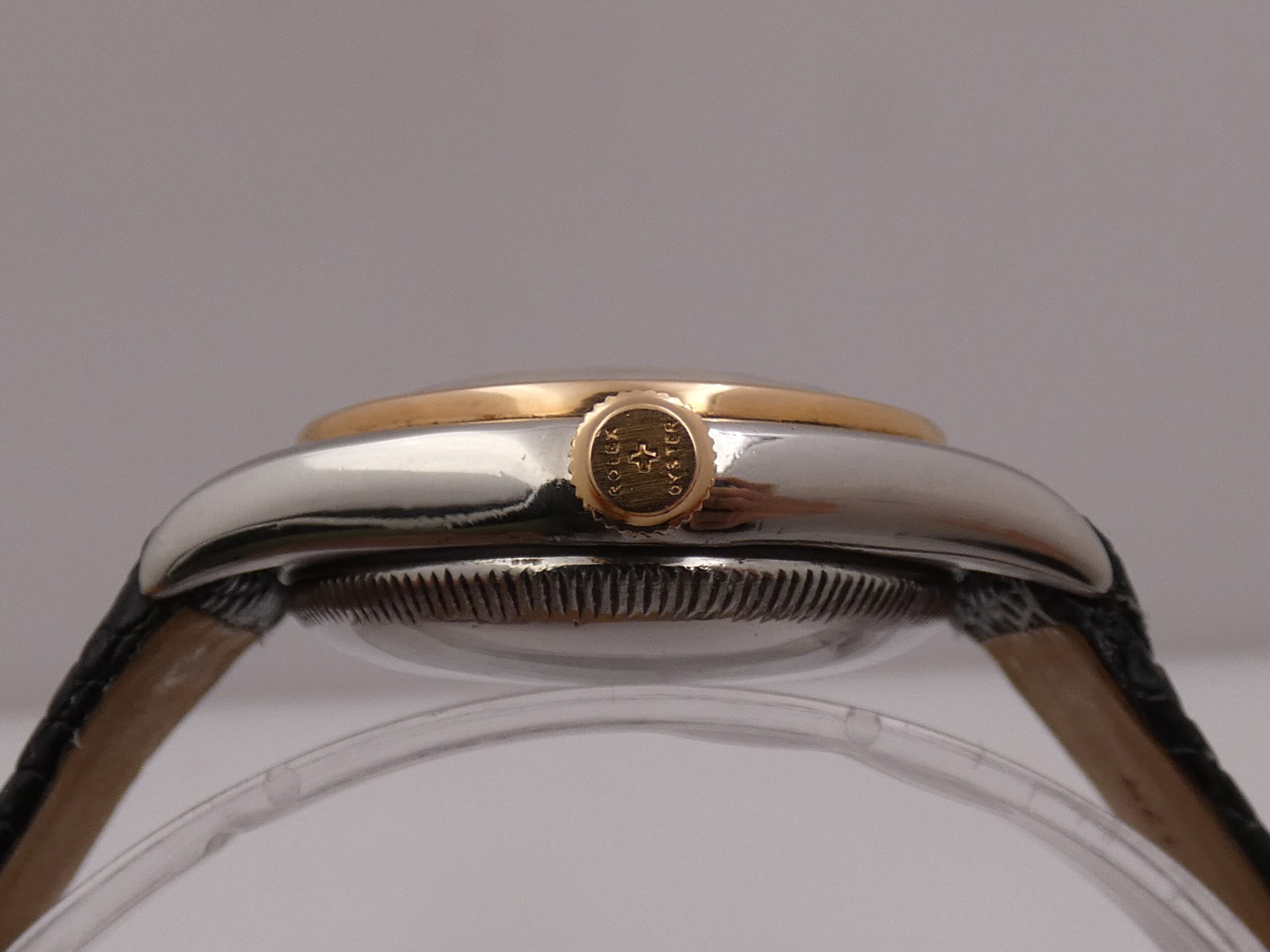 The “+” or “Brevet” marking on the winding crowns was used before Rolex standardized the use of the five-pointed ‘Coronet’ crown (or oyster) emblem. Subsequently, crowns were marked with dots or lines to indicate the waterproofing system (Twinlock or Triplock) and the material.
