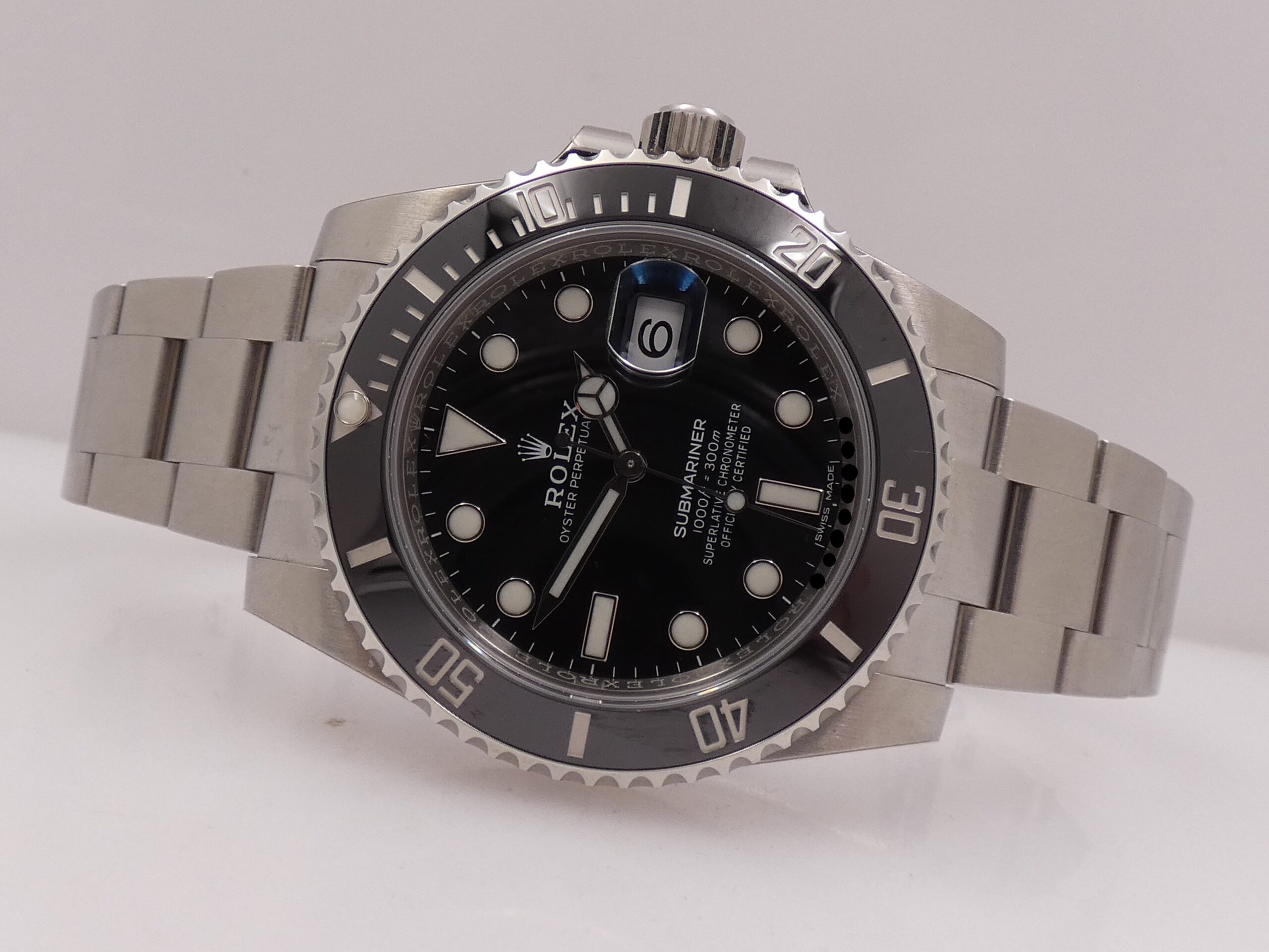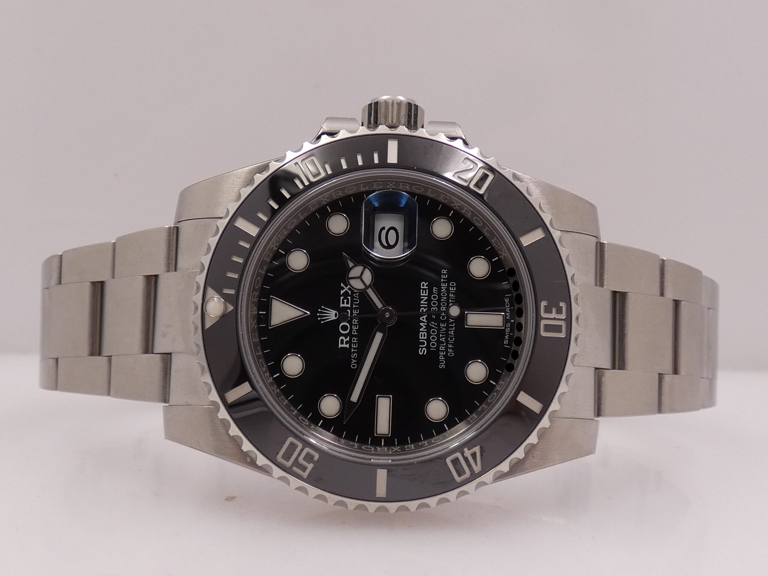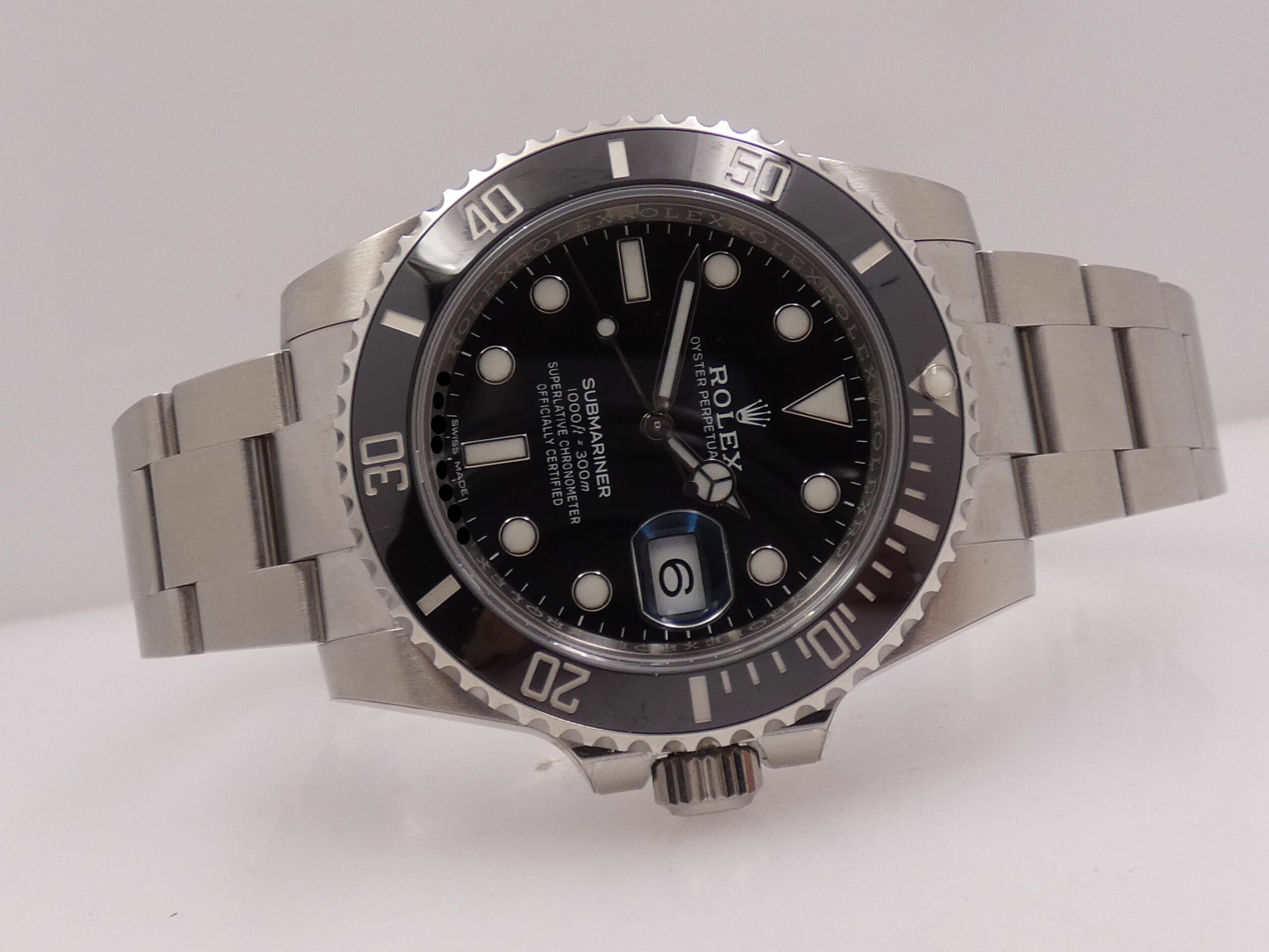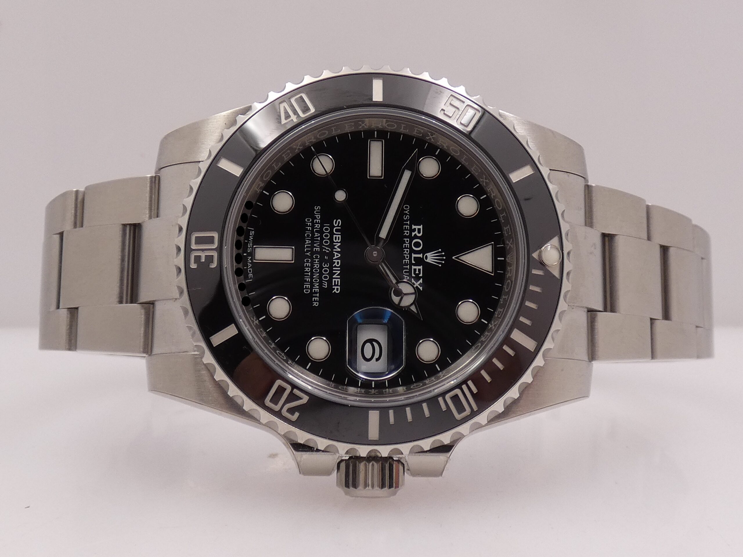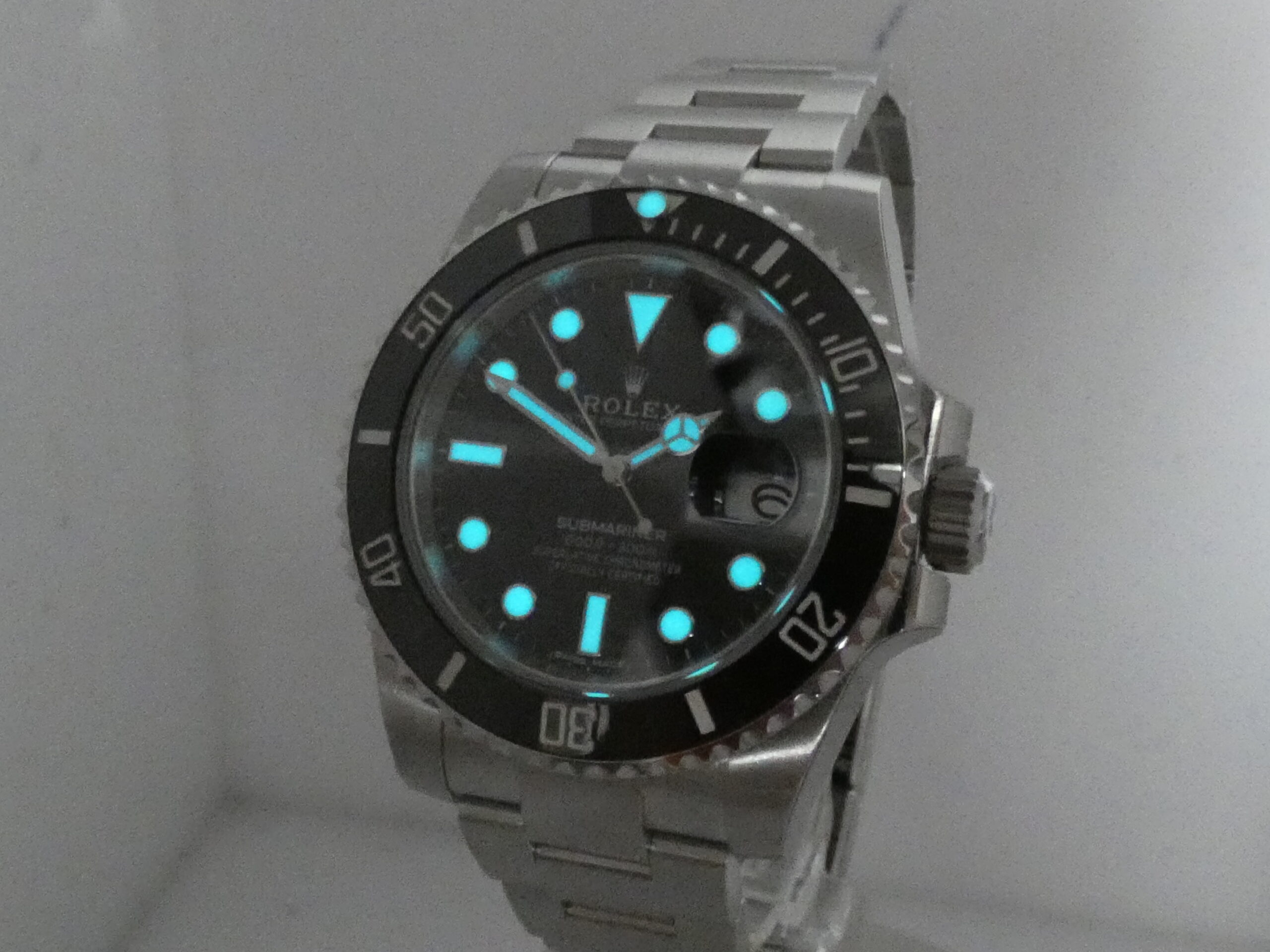 Quadrante: nero, con indici a bicchierini in acciaio, in rilievo e trattati con materiale luminecente Chromalight, lancette Mercedes anch’esse in acciaio e Chromalight, secondi al centro, datario al 3 con rimessa rapida in corona e lente magnificatrice, scala sessantesimale, logo Rolex al 12