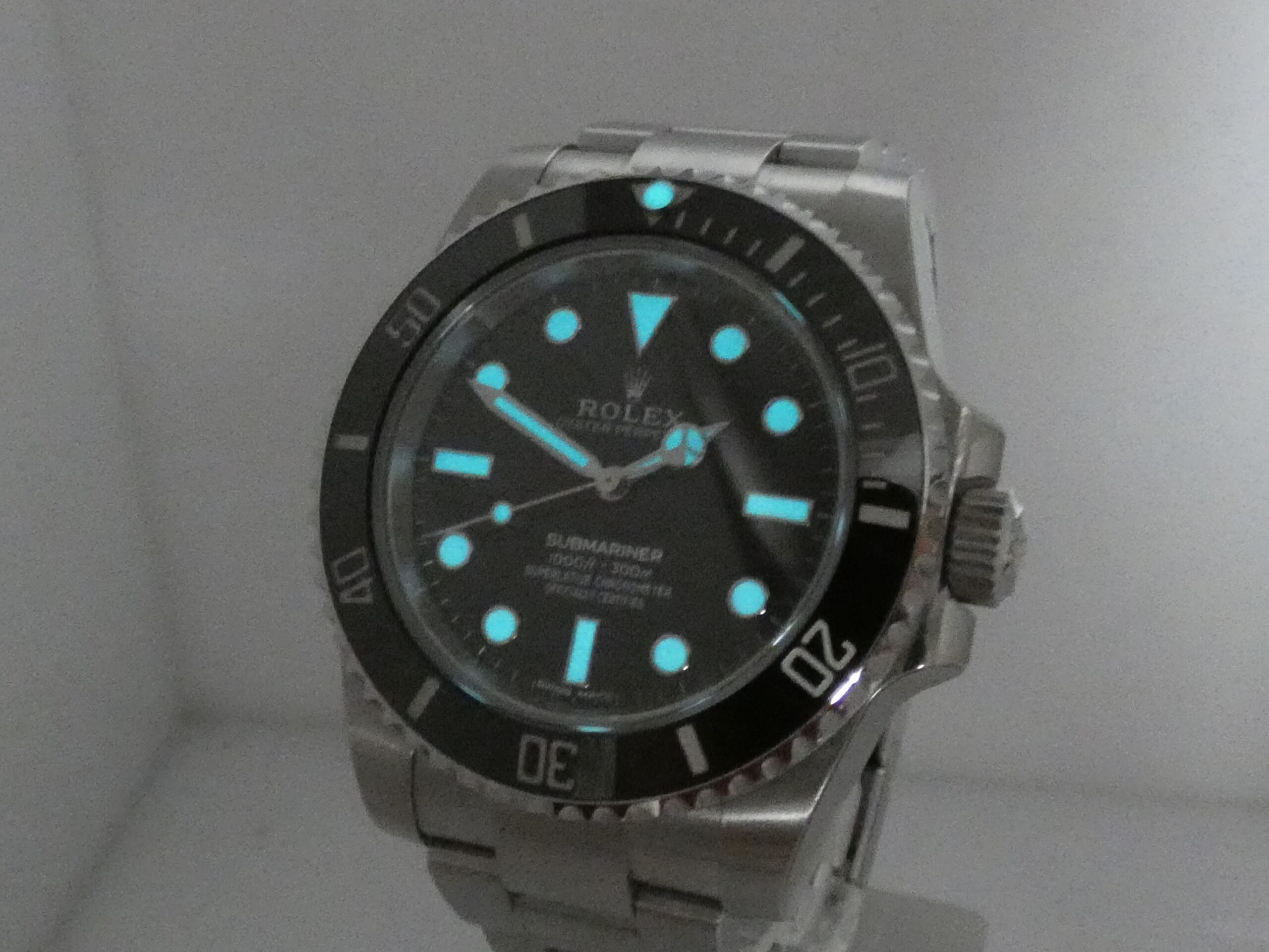 Quadrante: nero, con indici a bicchierini in acciaio, in rilievo e trattati con materiale luminecente Chromalight, lancette Mercedes anch’esse in acciaio e Chromalight, secondi al centro, scala sessantesimale, logo Rolex al 12