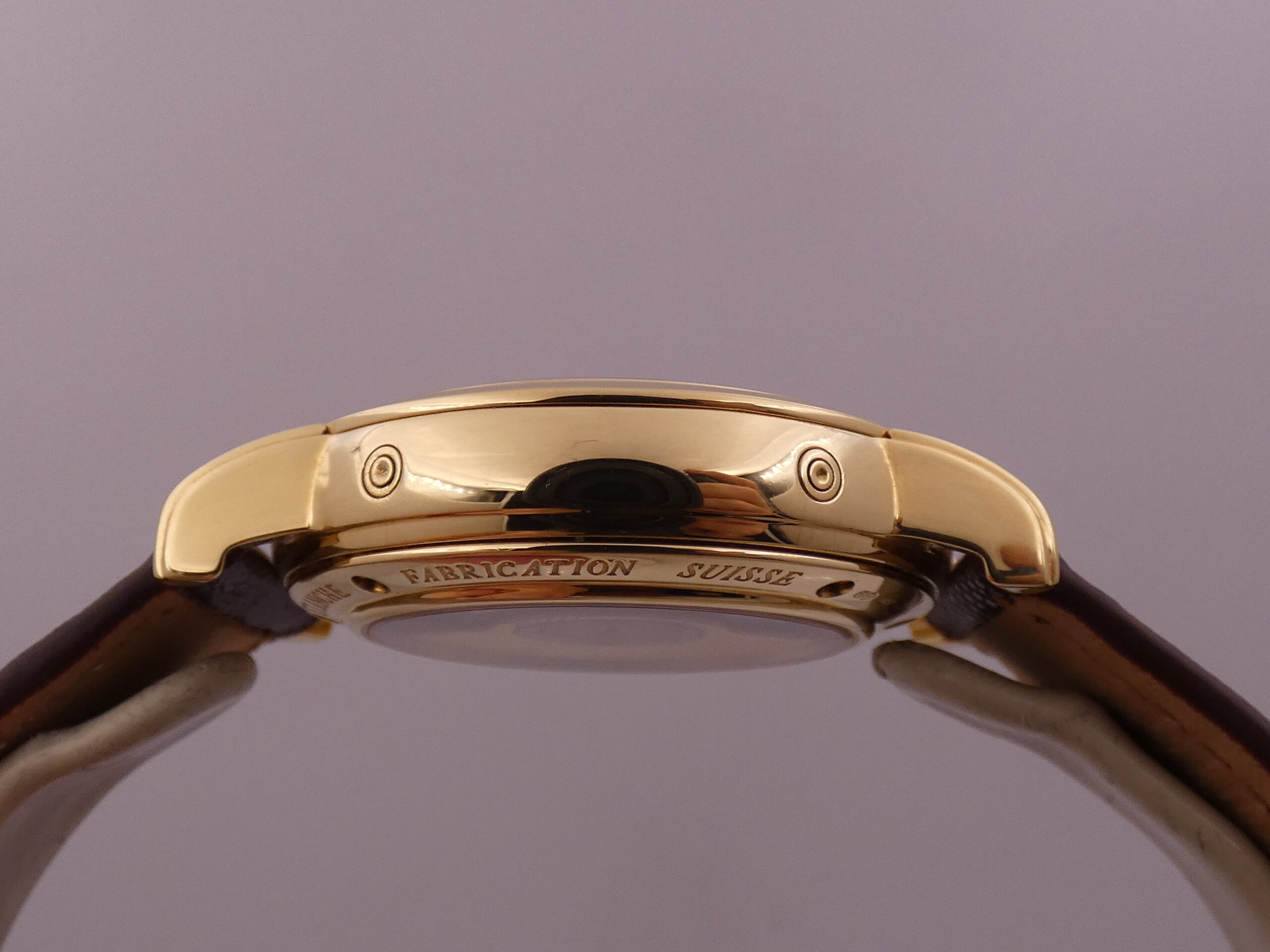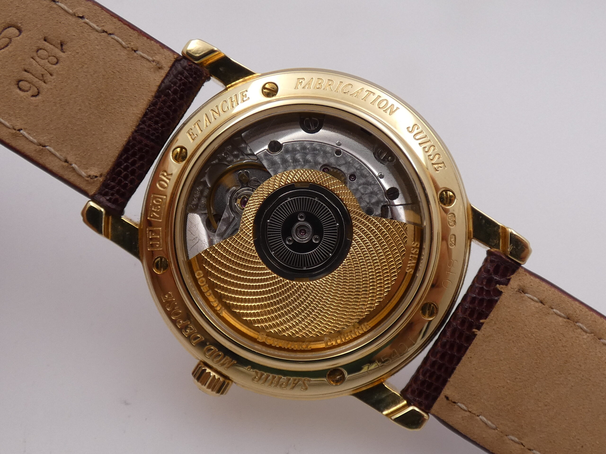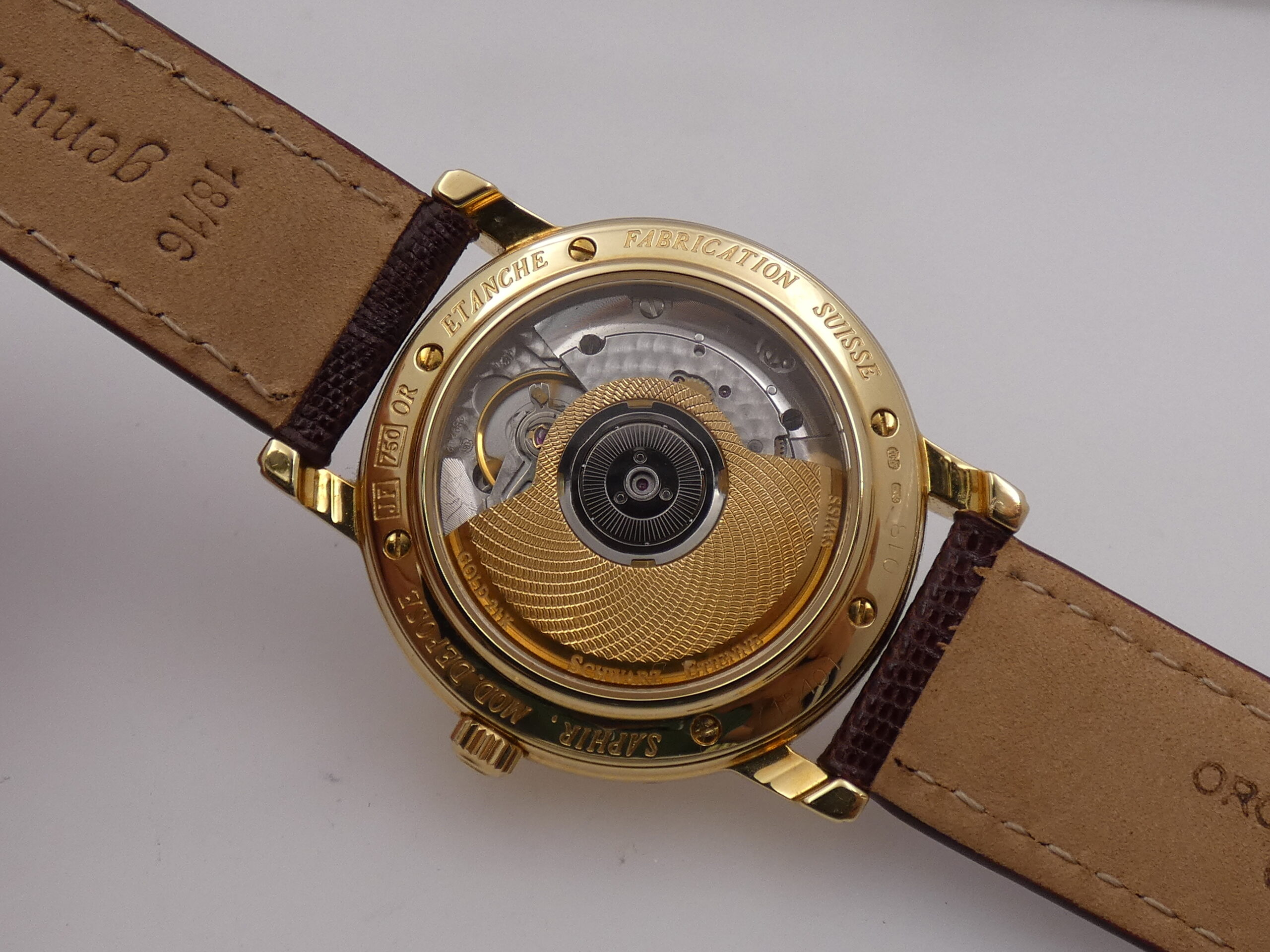 Fondello: serrato da 6 viti, riportante il logo della casa, il punzone dell’oro e la sua purezza, con movimento a vista