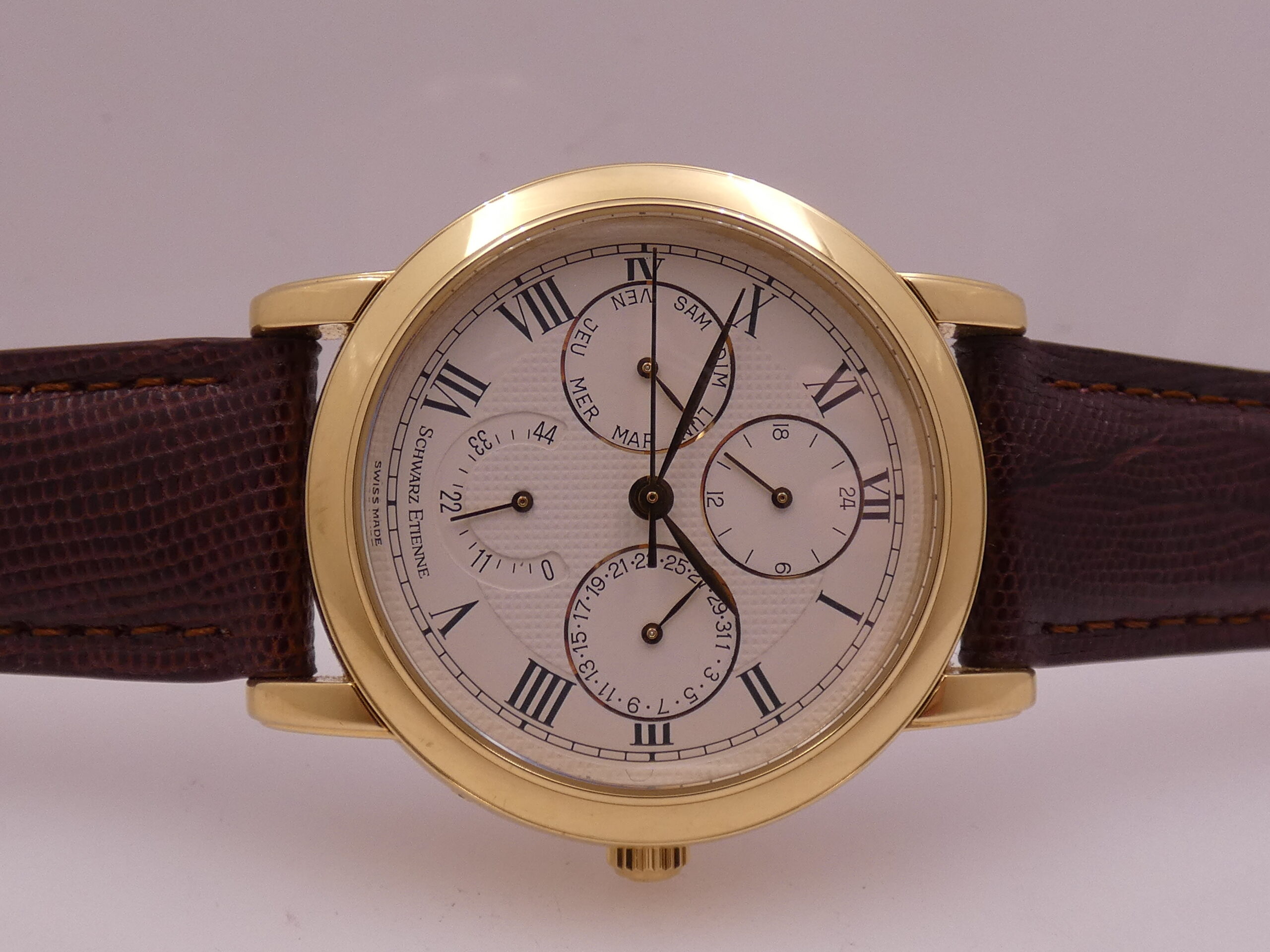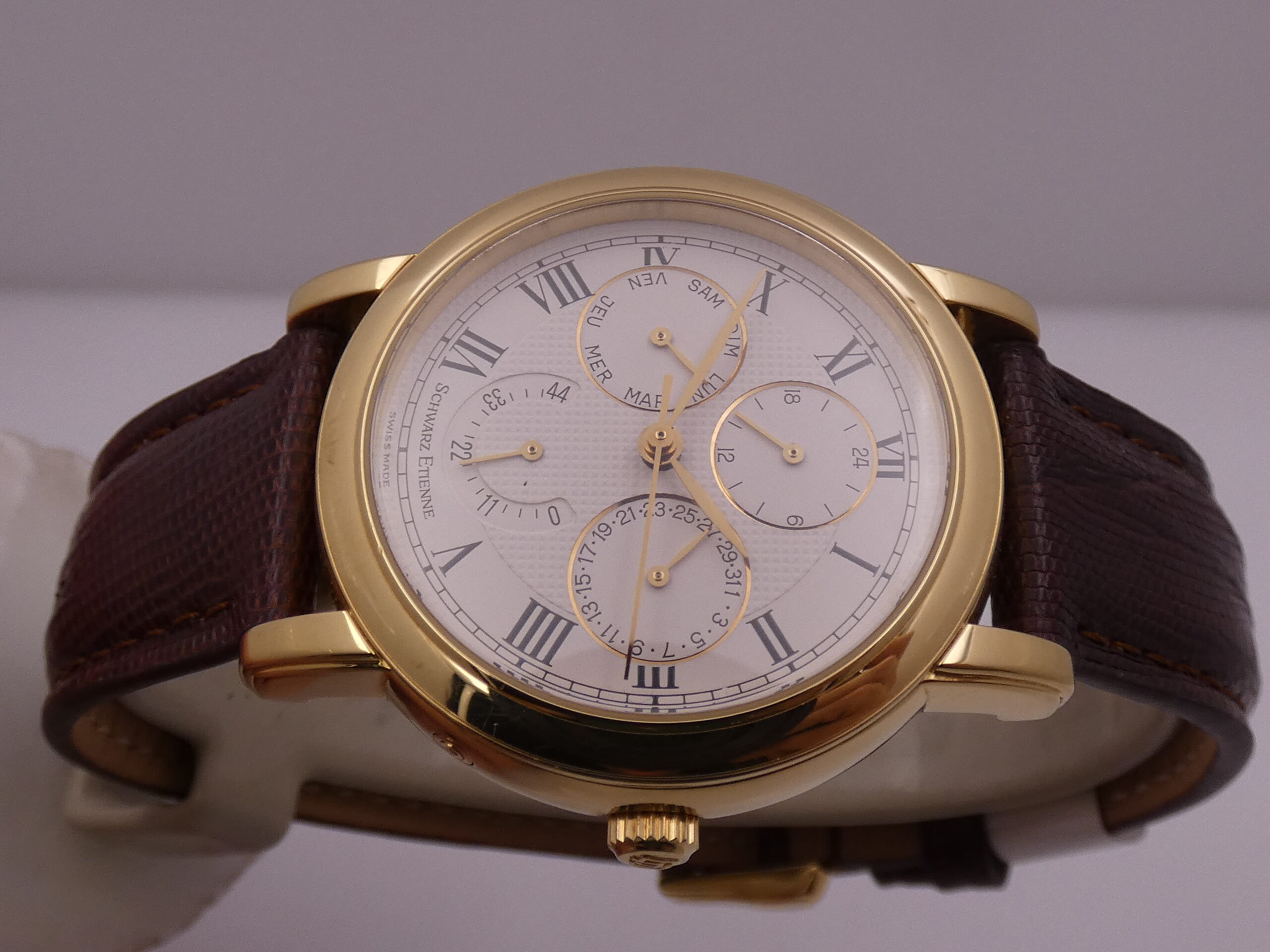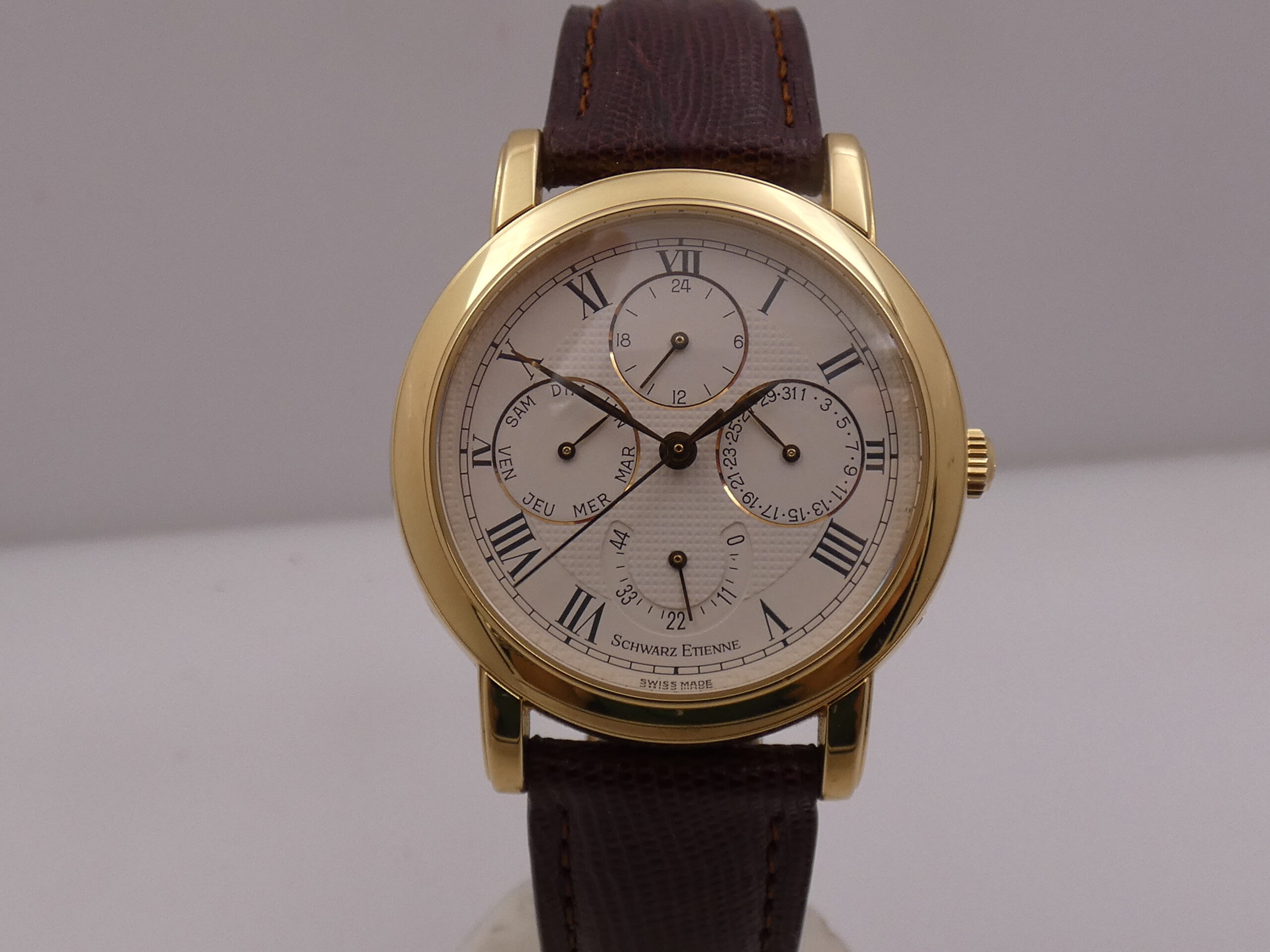 Quadrante: bianco, con lavorazione centrale a nido d’ape, indici romani, lancette a foglia, in oro, secondi al centro, indicazione del datario al 3, indicazione dei giorni settimanali al 9, scala delle 24 ore per l’indicazione del GMT a regolazione indipendente al 12, indicazione della riserva di carica al 6, rimesse rapide tramite pulsantini al 4 all’8 ed al 10, scala sessantesimale Chemin De Fer, logo Schwarz Etienne al 12