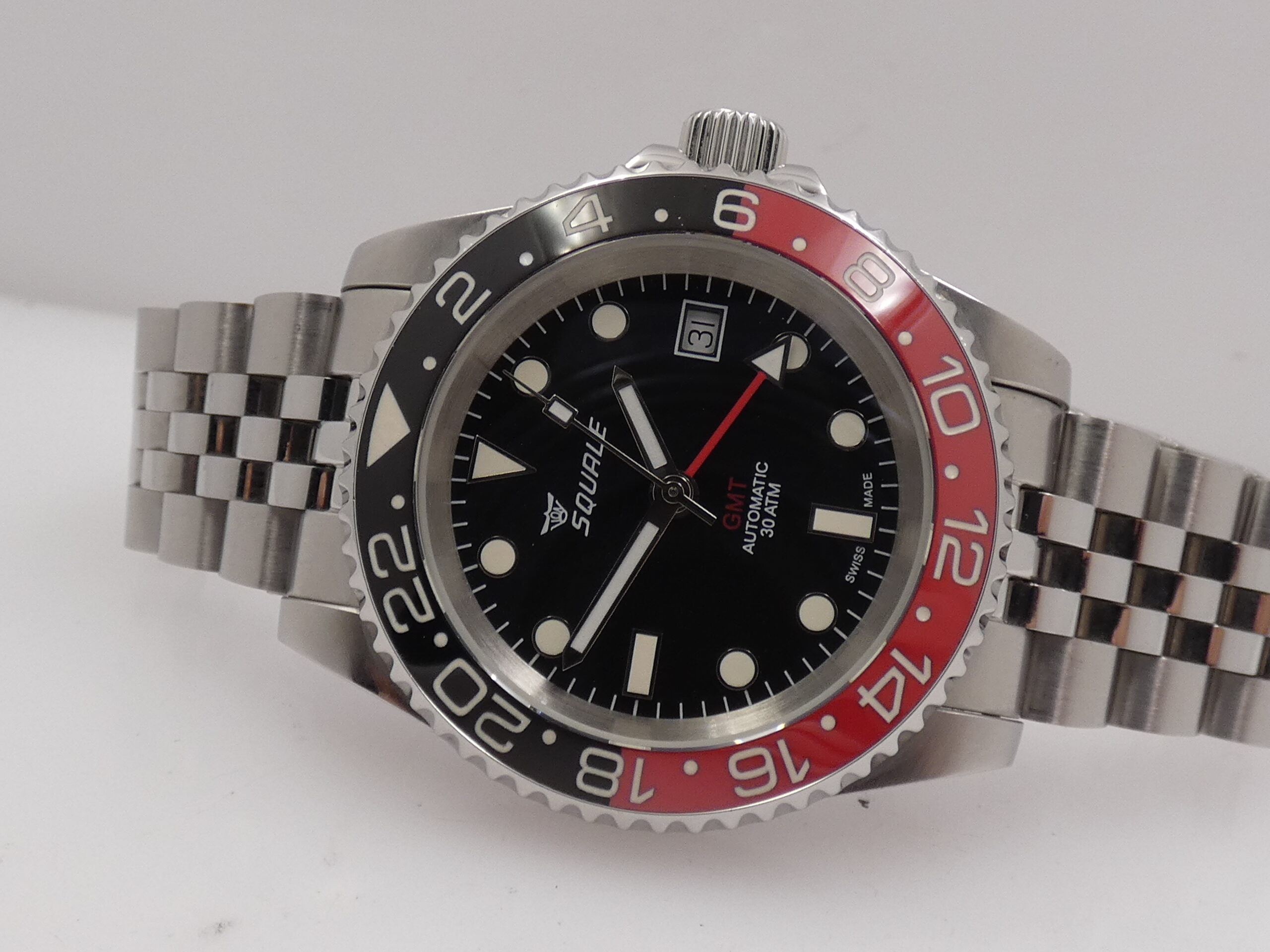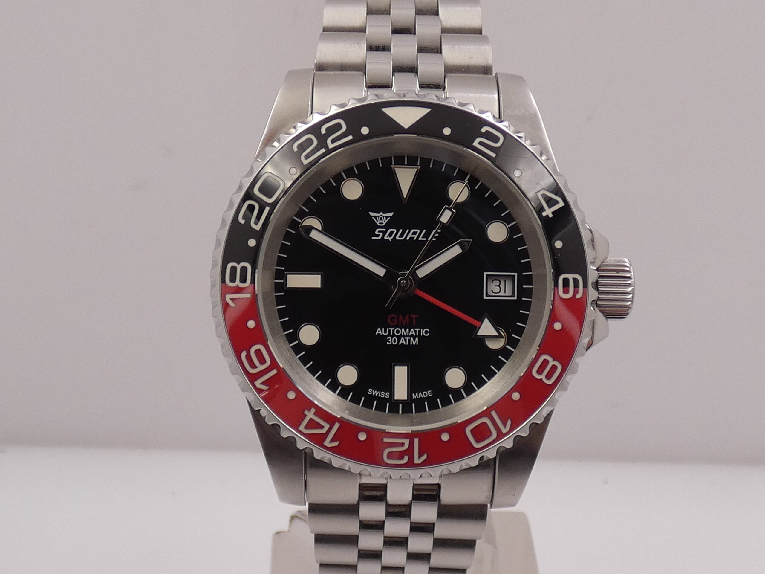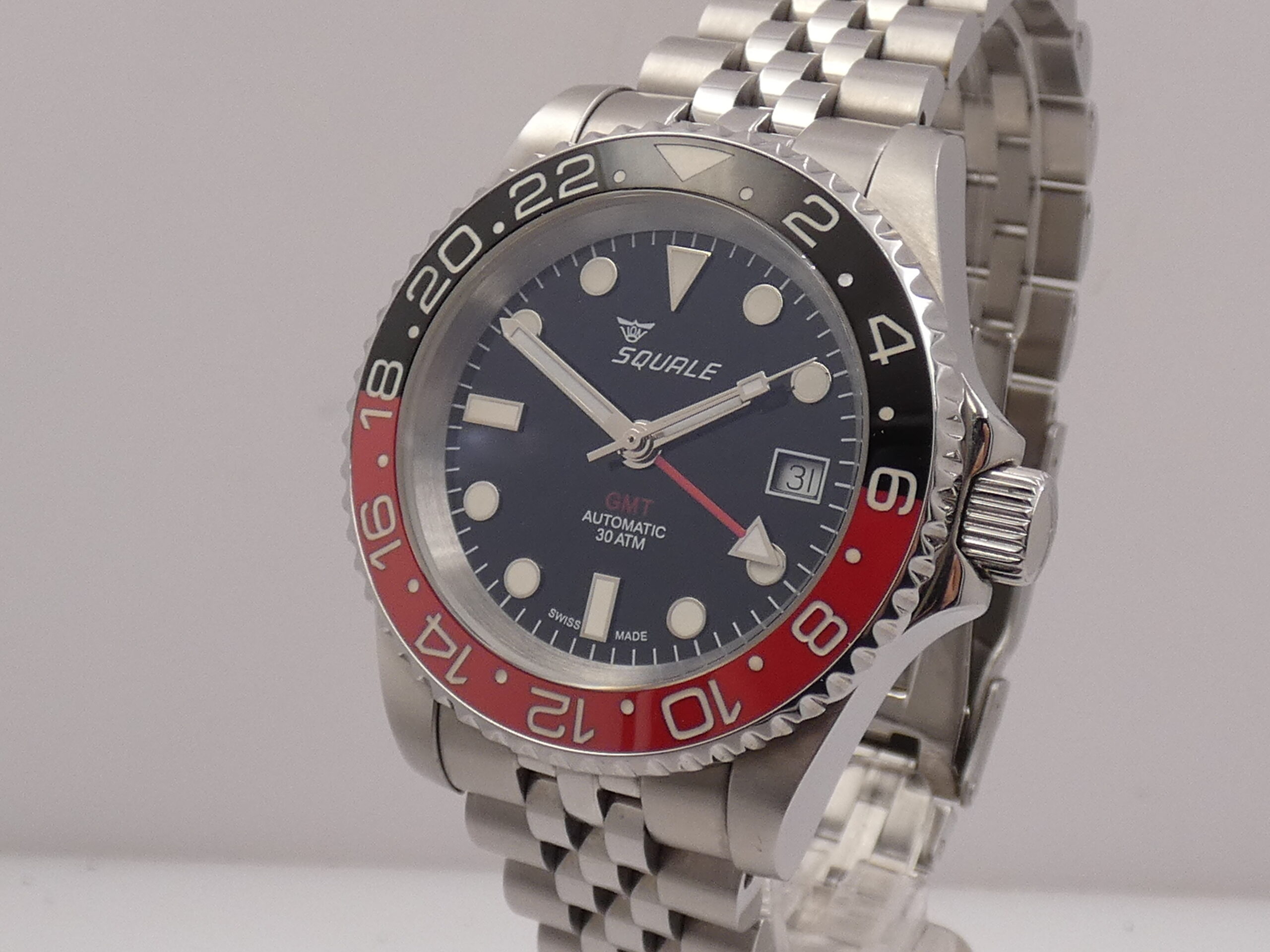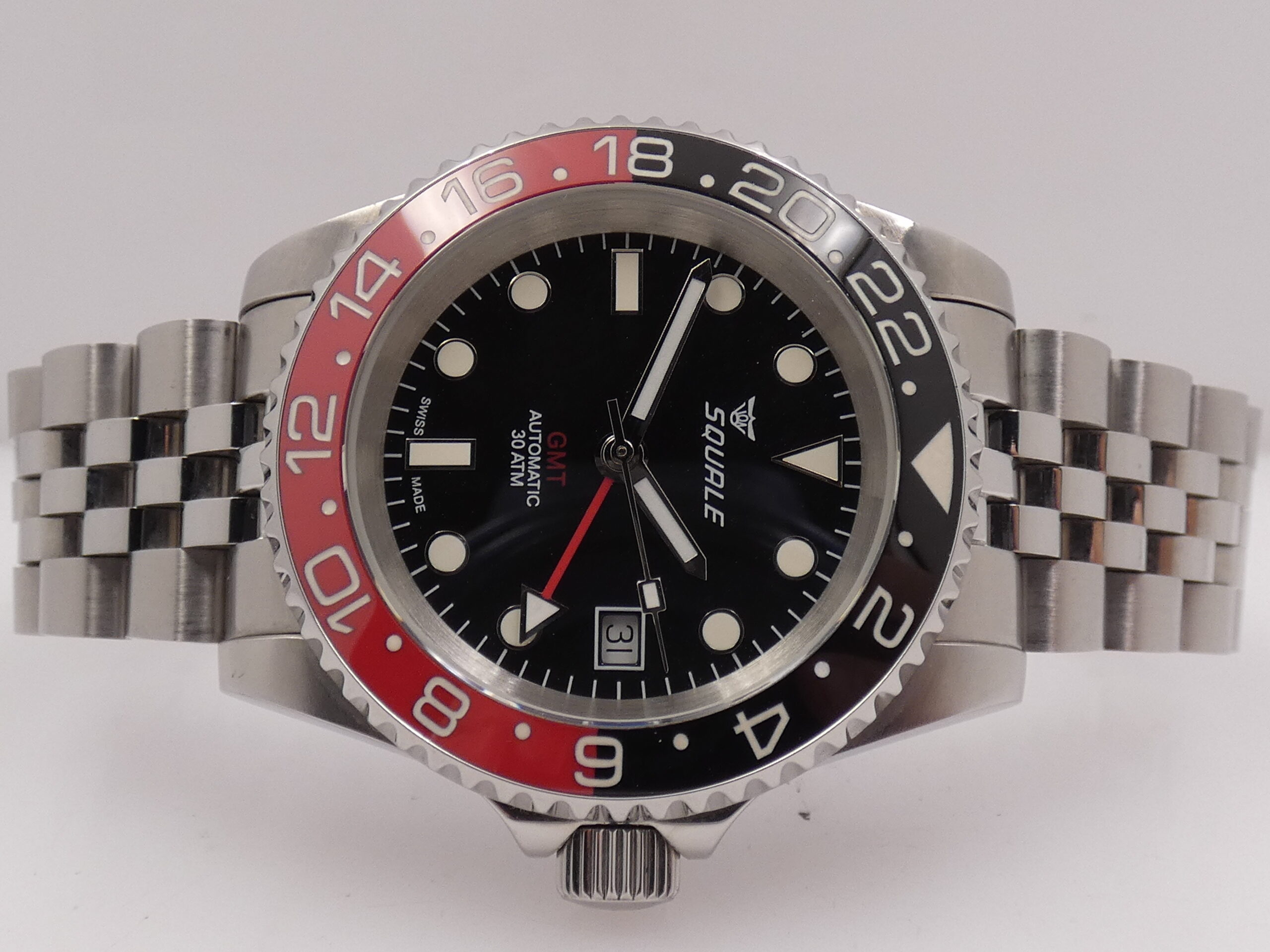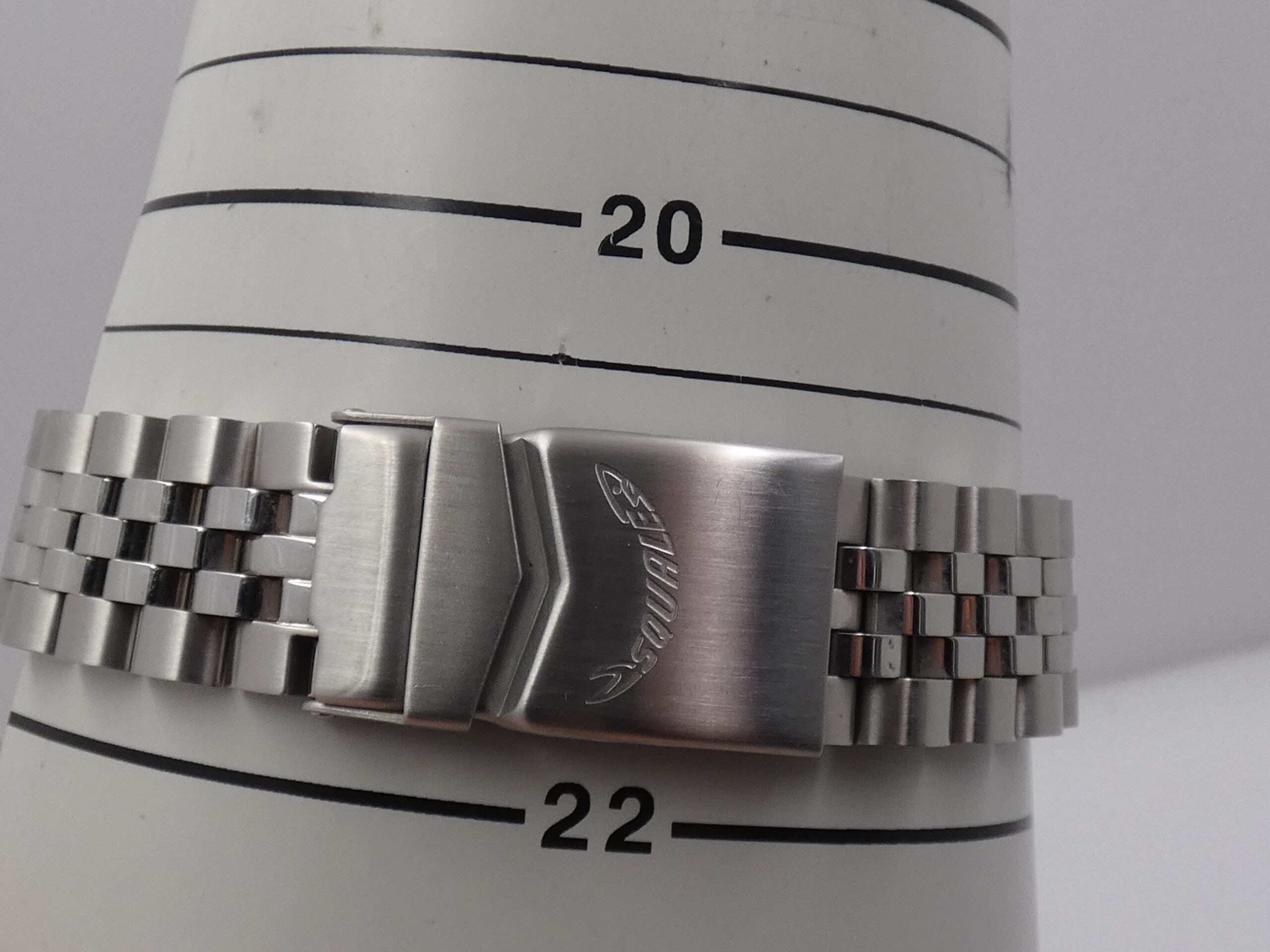Dial: Black, with raised steel indexes treated with luminescent material, steel pencil-shaped hands with luminescent material, center seconds, date display at 3 o’clock with quick-set crown, 60-minute scale, Squale logo at 12 o’clock