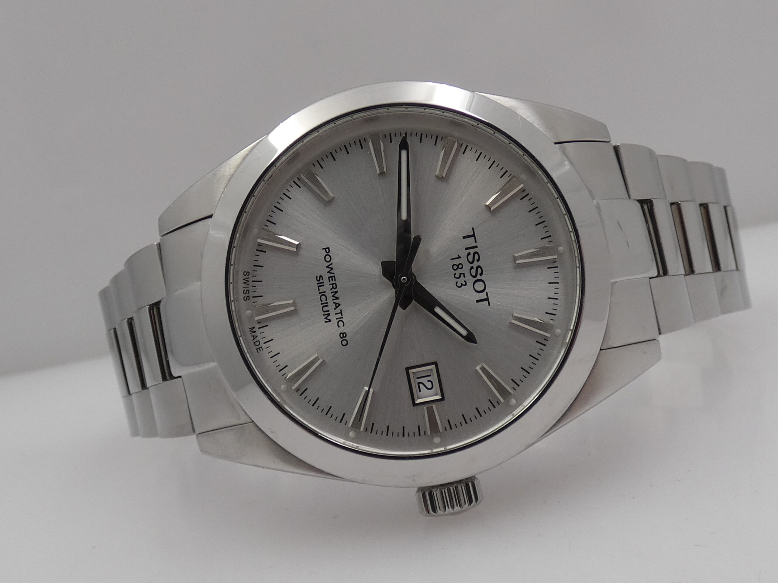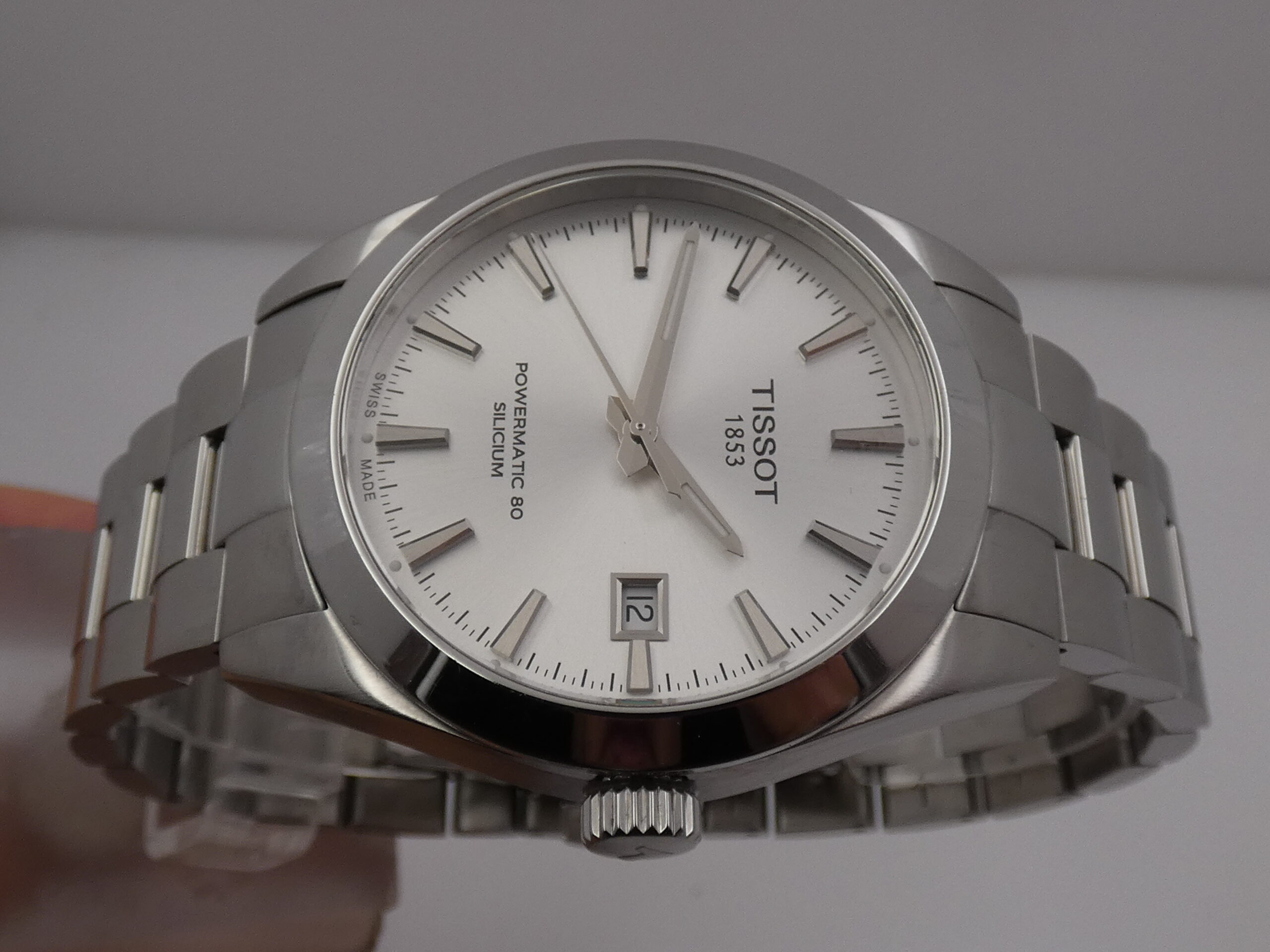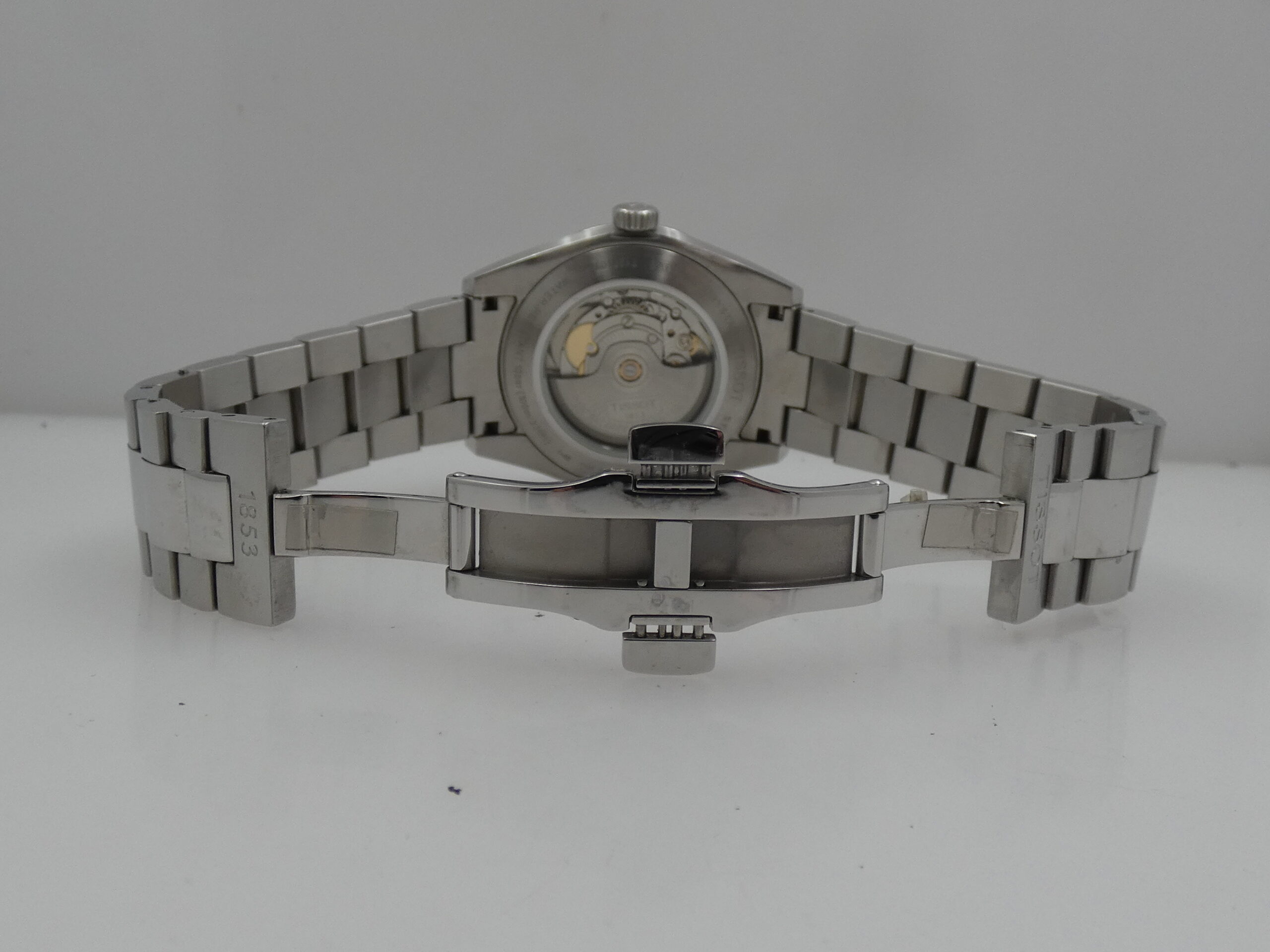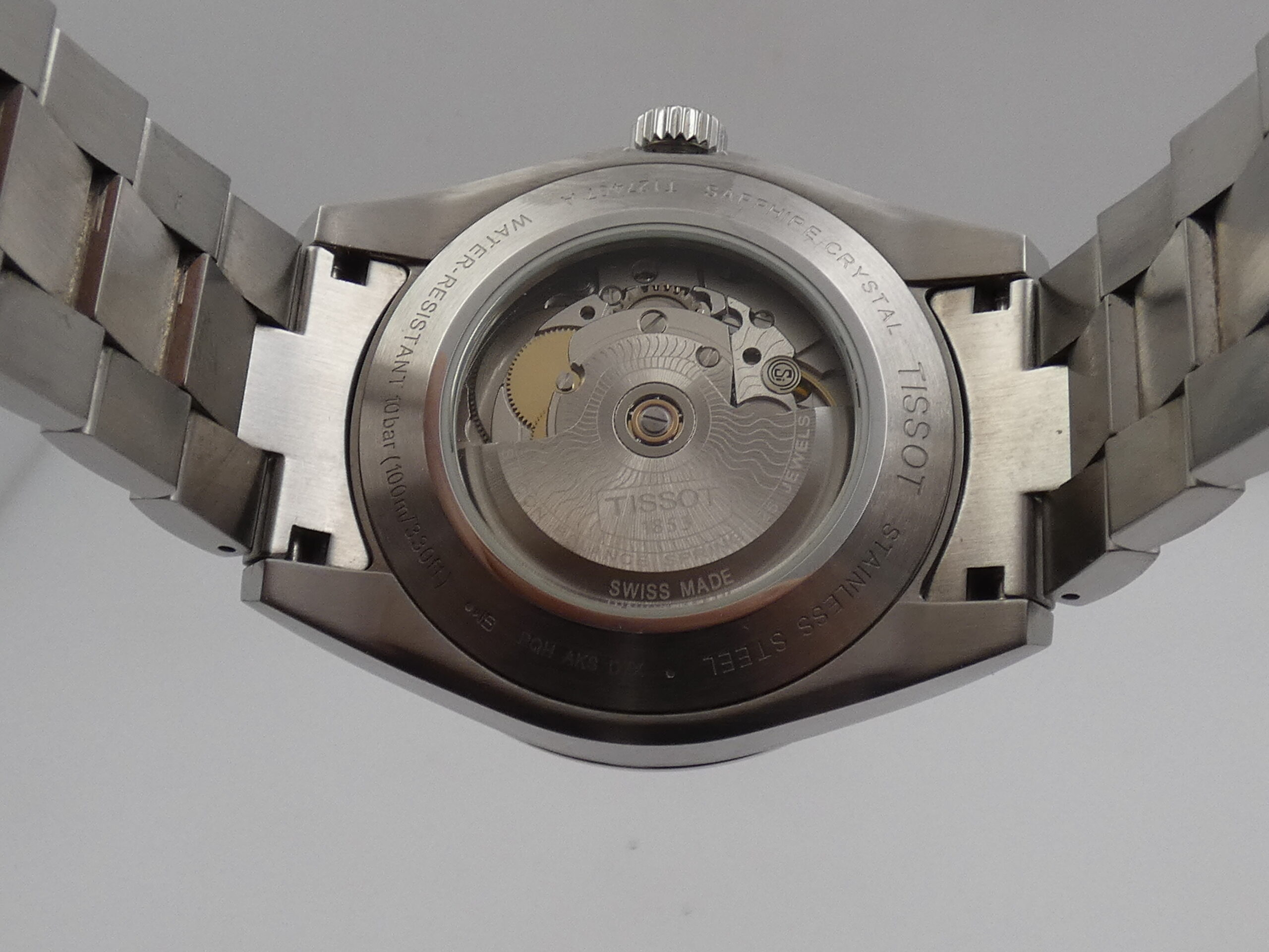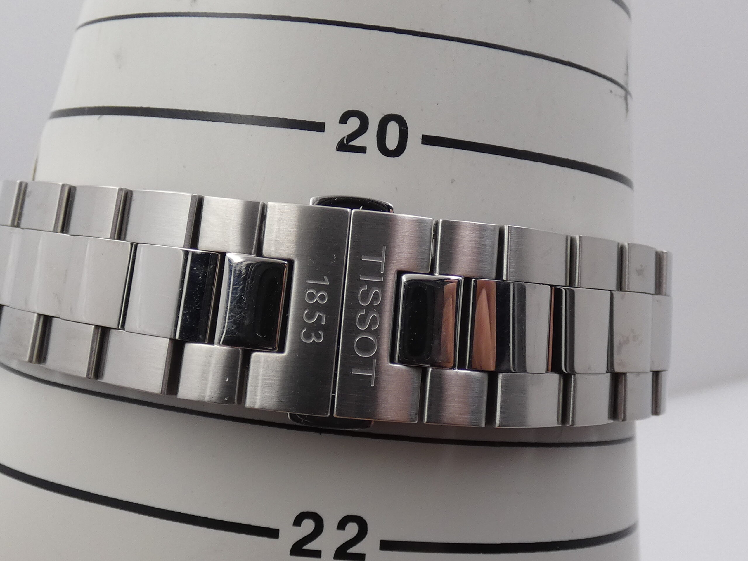 Quadrante: argentè soleil, con indici a barretta in acciaio, in rilievo e con punti luminescenti in corrispondenza, lancette a matita, anch’esse in acciaio e luminescenti secondi al centro, datario al 3, scala sessantesimale con suddivisione ad 1/5 di secondo, logo Tissot al 12