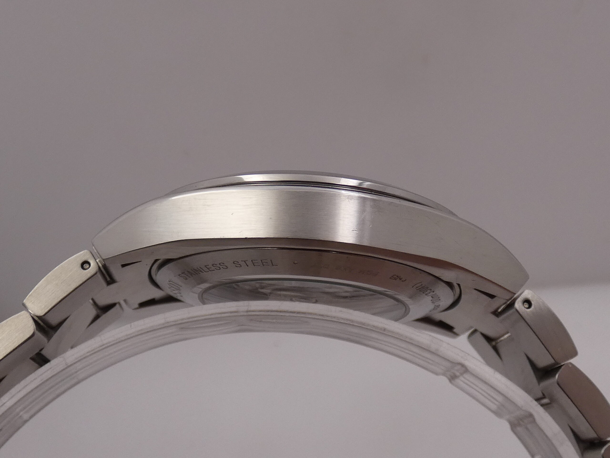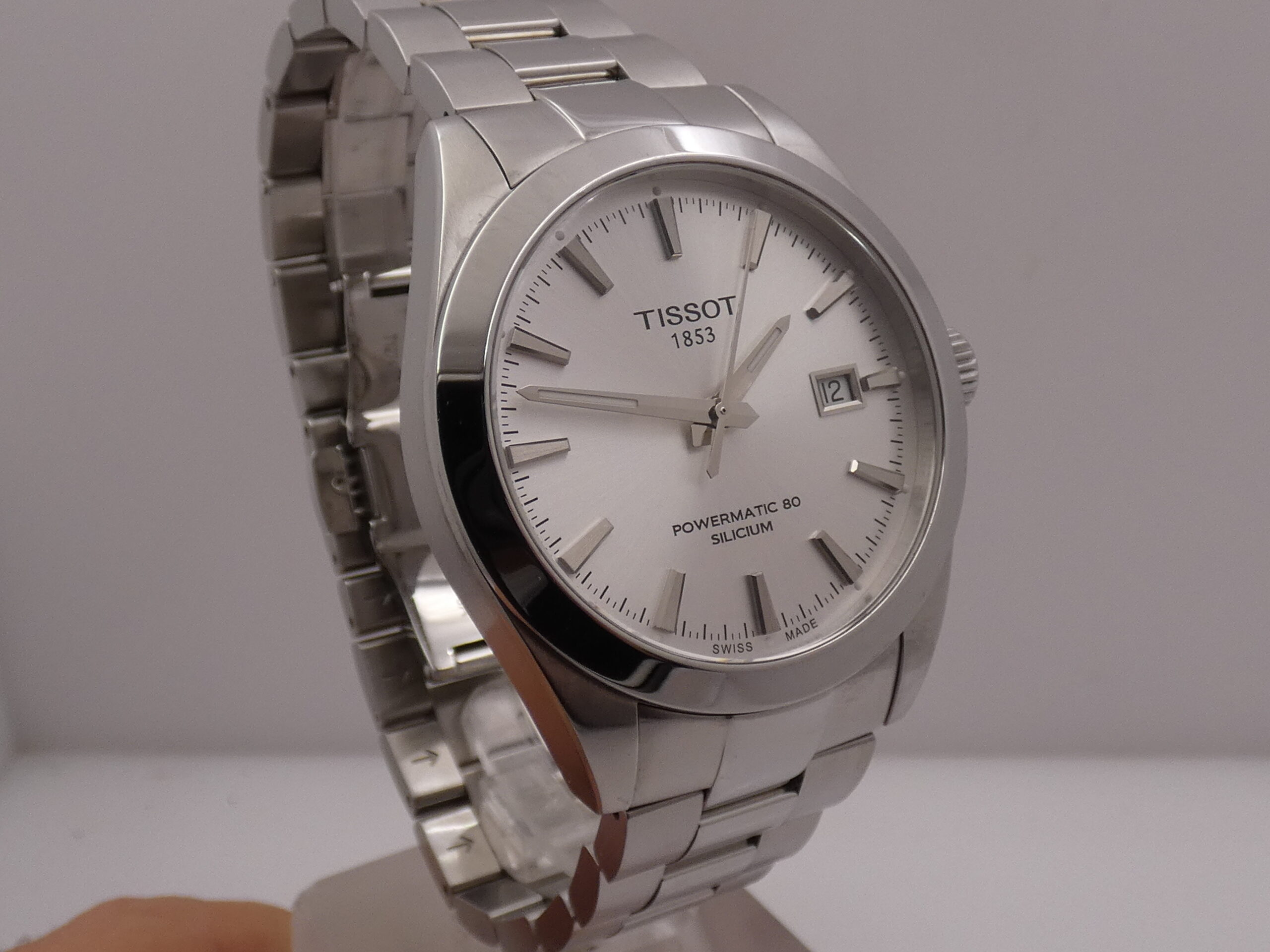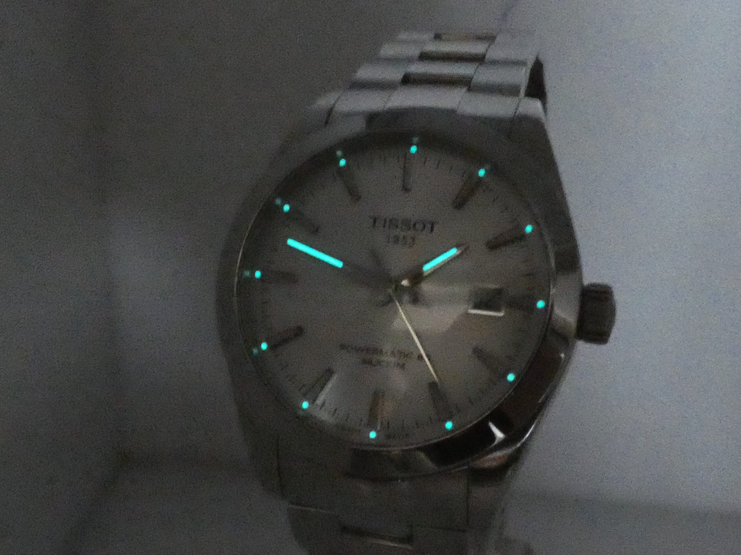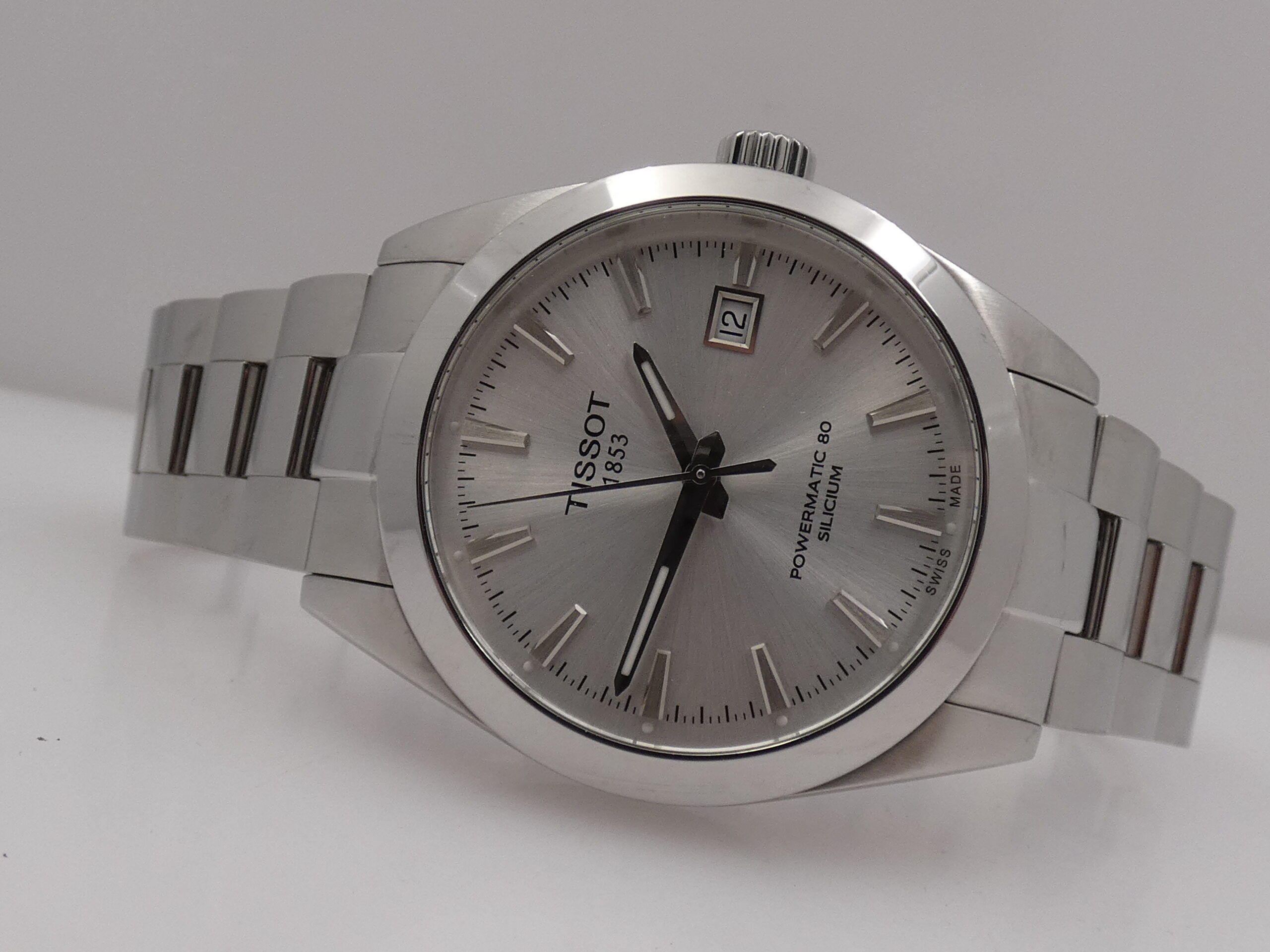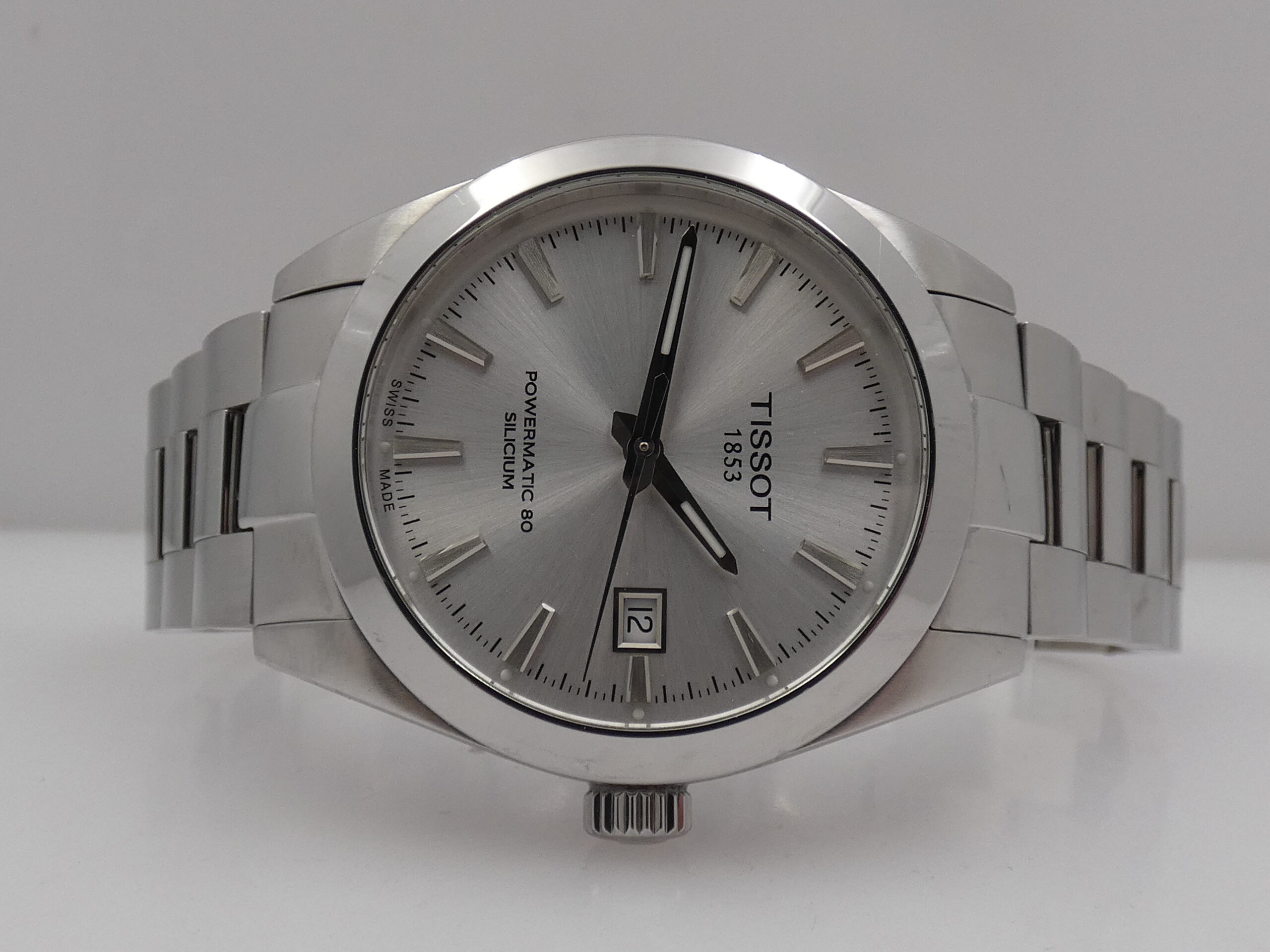 Quadrante: argentè soleil, con indici a barretta in acciaio, in rilievo e con punti luminescenti in corrispondenza, lancette a matita, anch’esse in acciaio e luminescenti secondi al centro, datario al 3, scala sessantesimale con suddivisione ad 1/5 di secondo, logo Tissot al 12