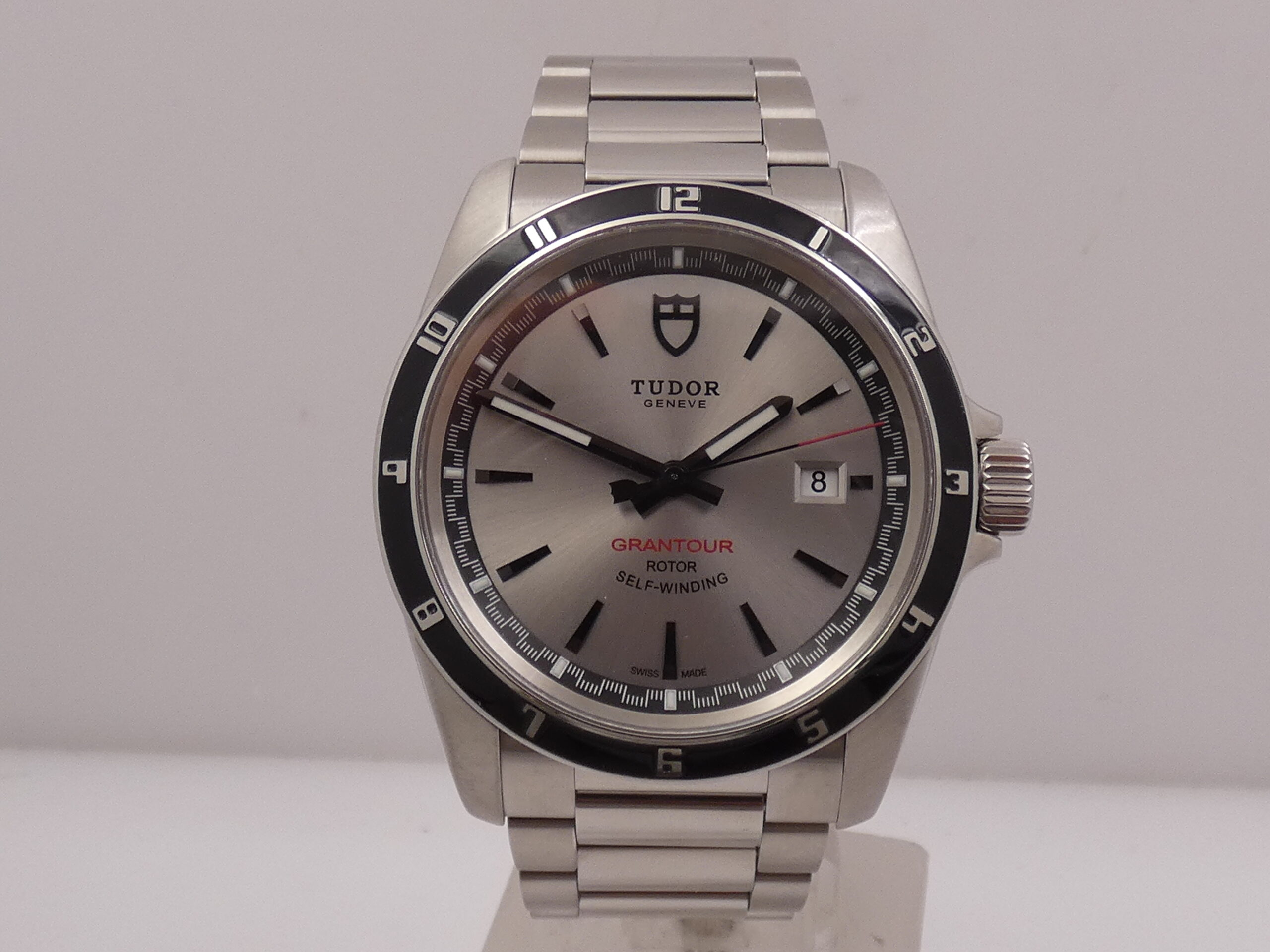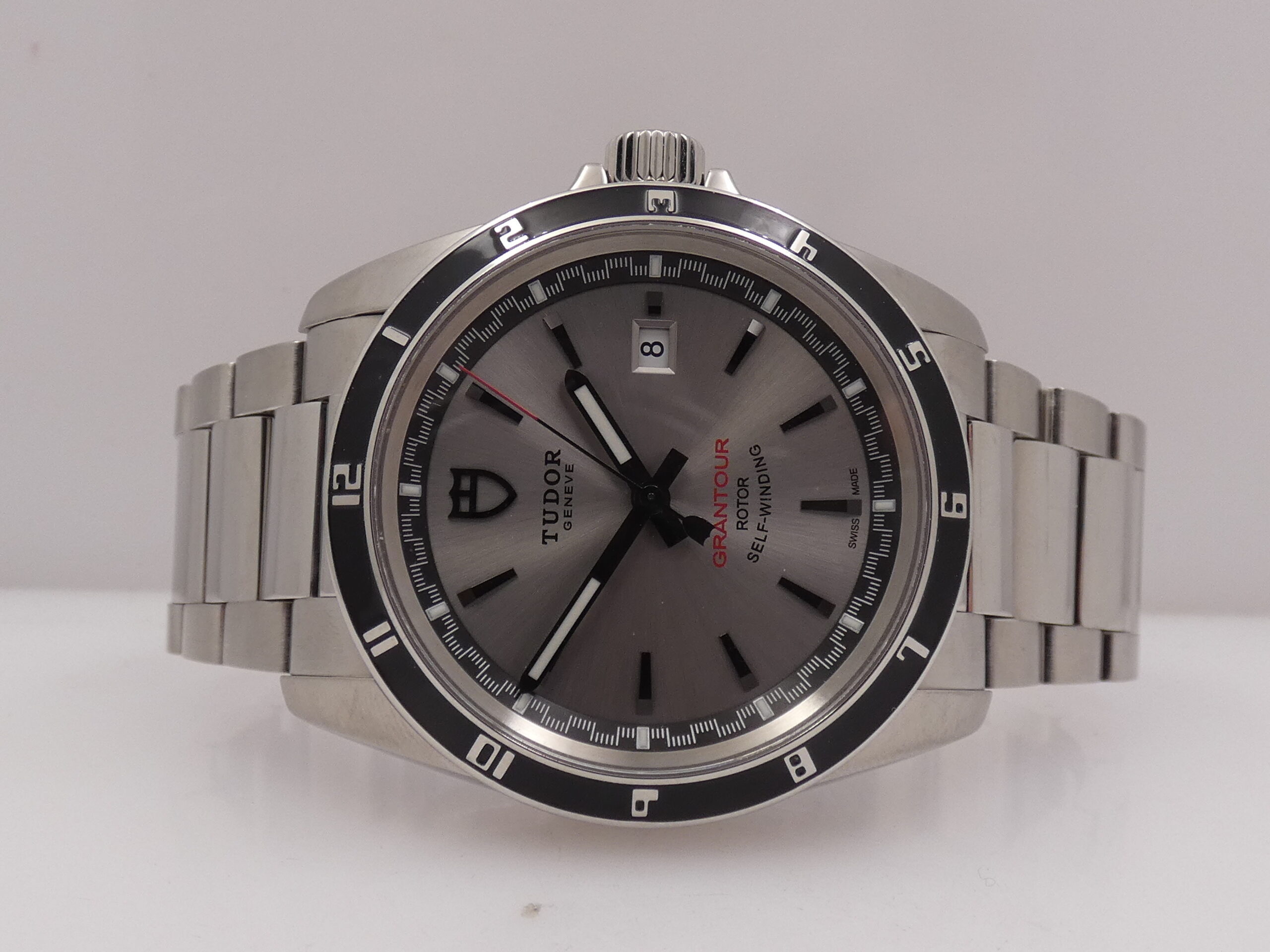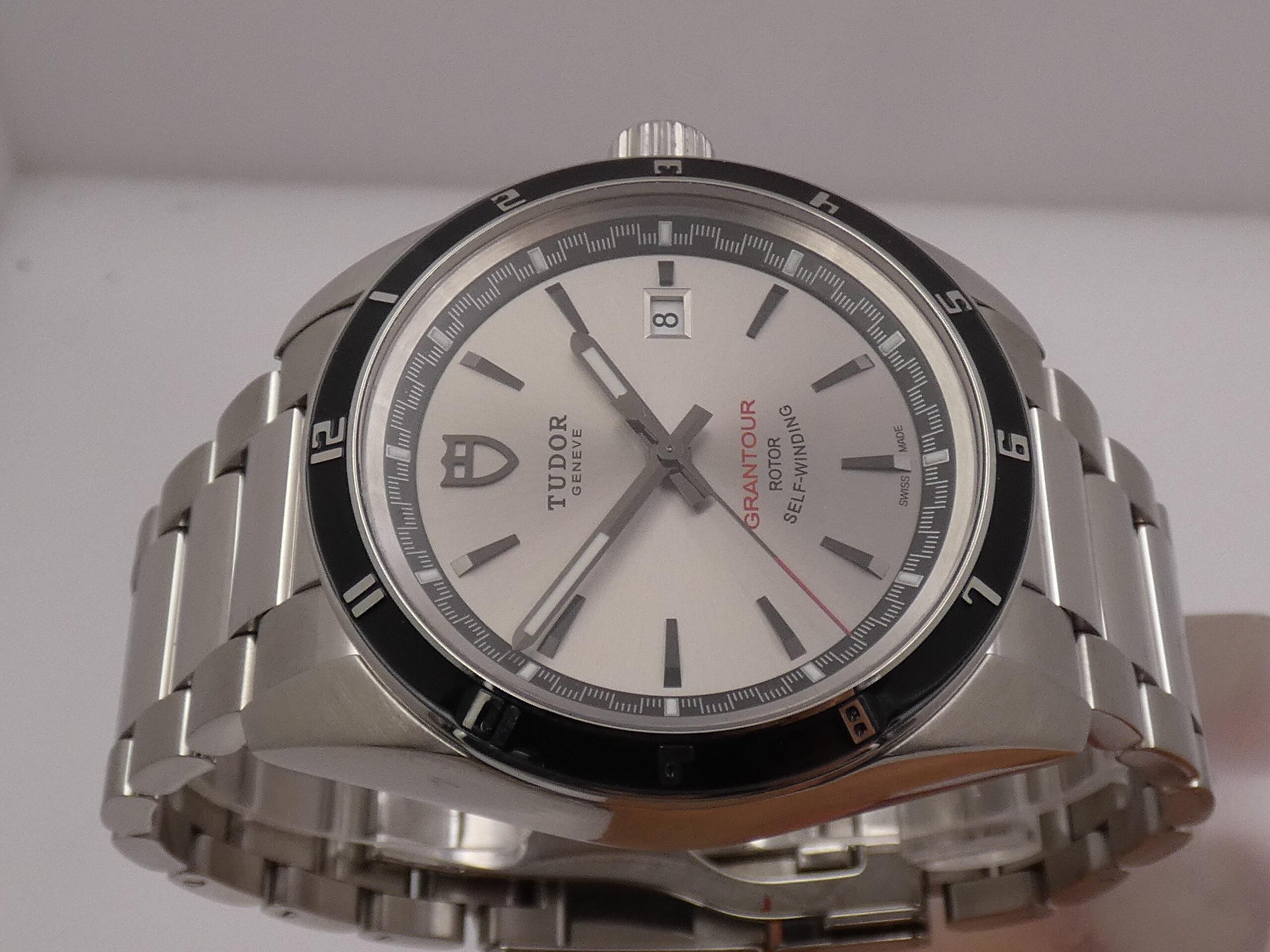 Dial: Silver sunburst, with raised steel bar indexes and corresponding luminescent dots, steel pencil-shaped hands with luminescent coating, center seconds, date display at 3 o’clock with quick-set crown, 60-minute scale on the flange with 1/5th of a second divisions, Tudor logo at 12 o’clock