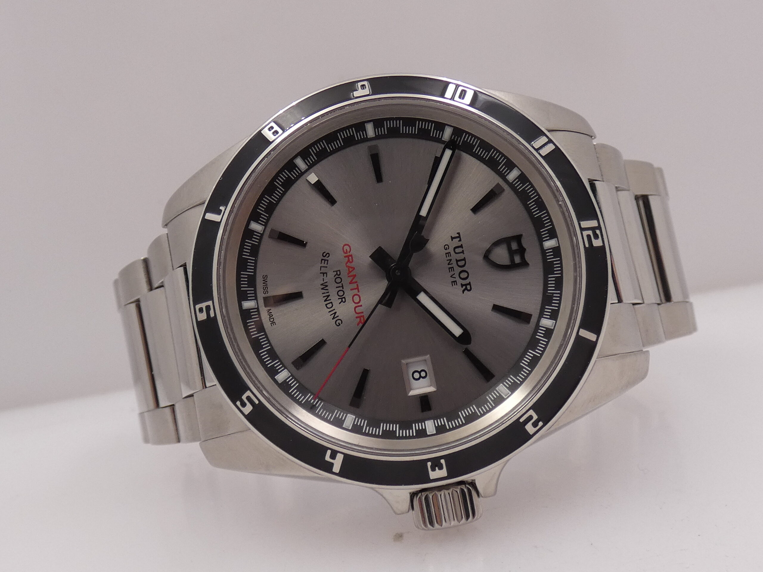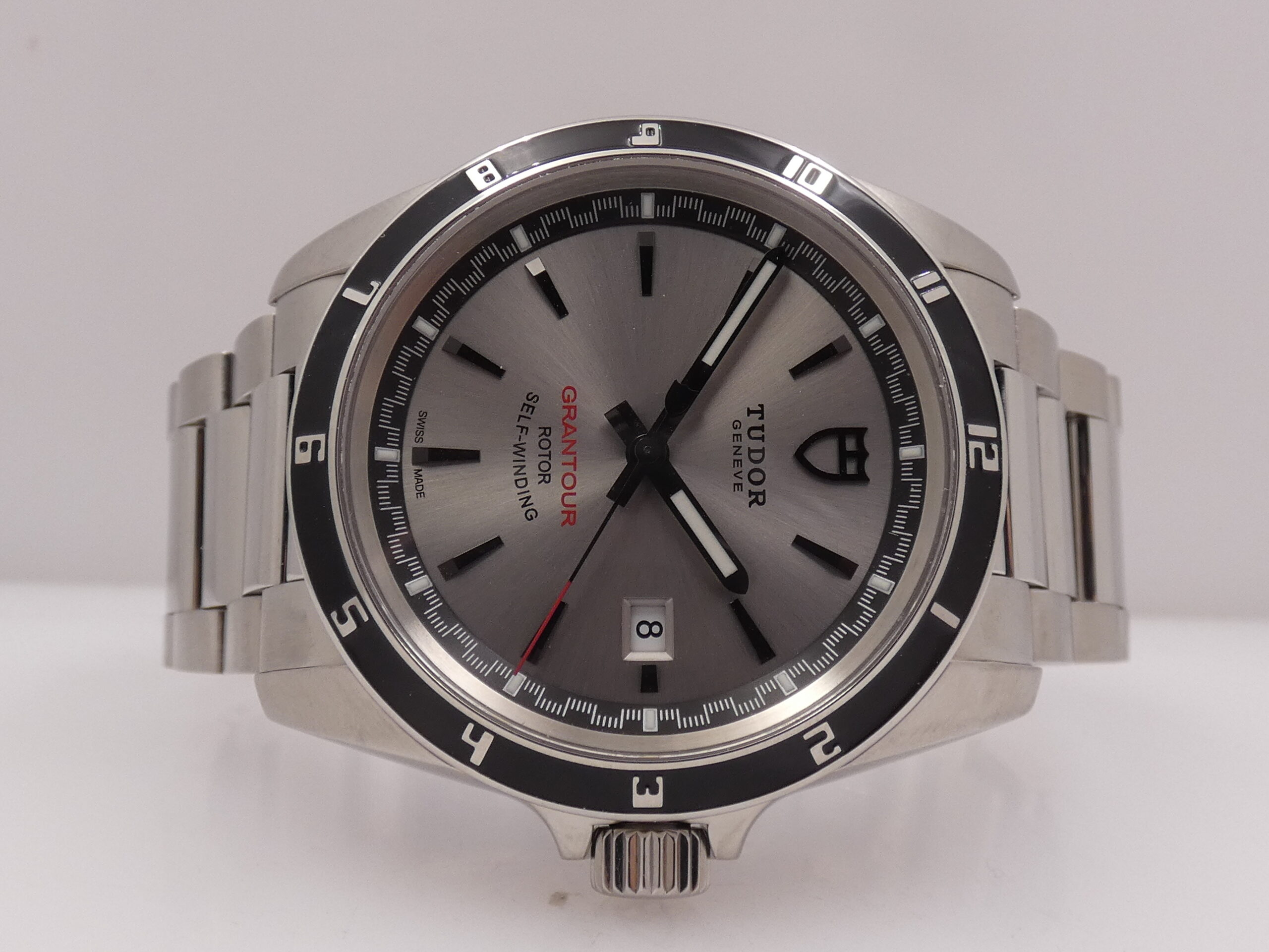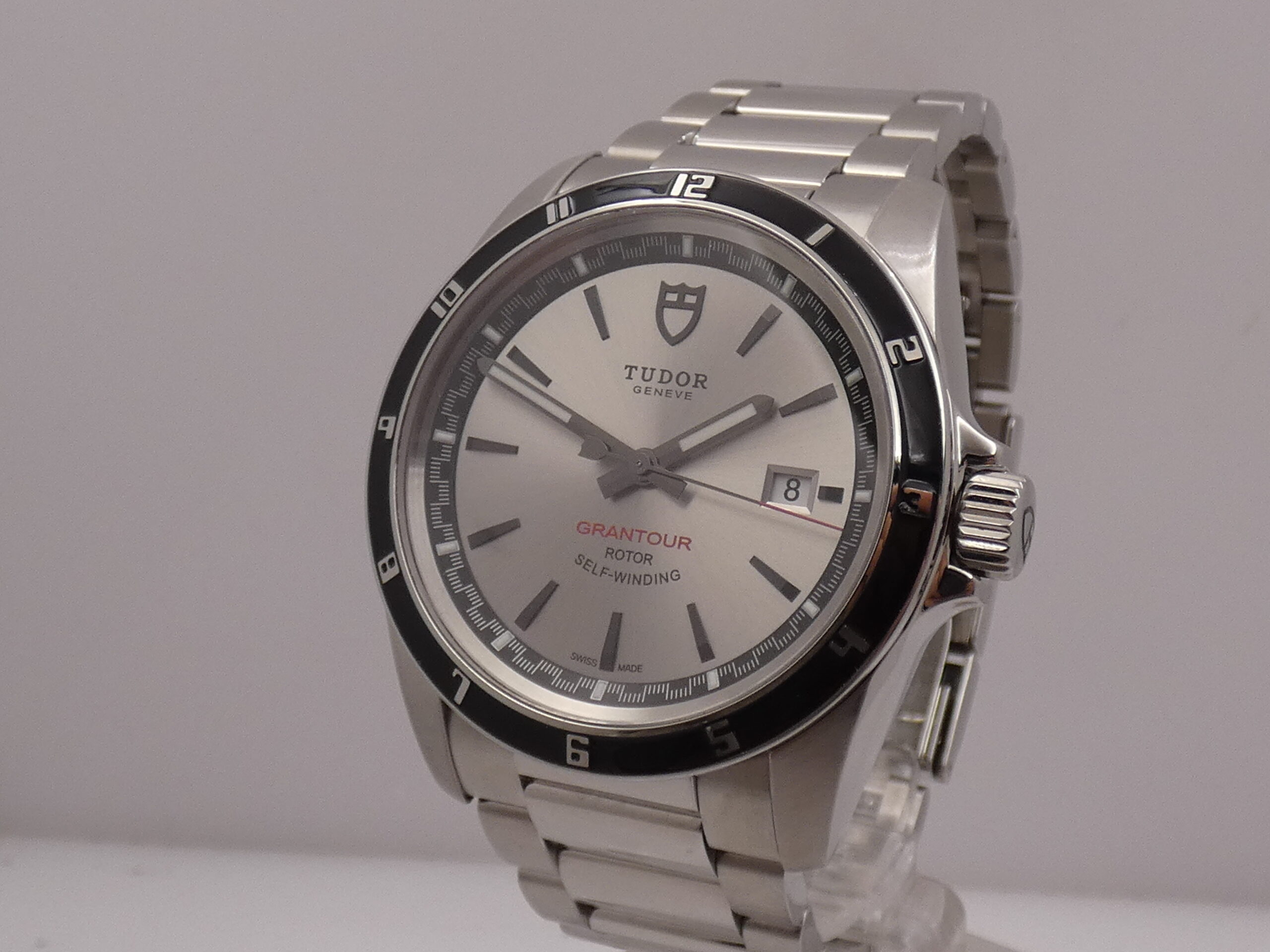 Dial: Silver sunburst, with raised steel bar indexes and corresponding luminescent dots, steel pencil-shaped hands with luminescent coating, center seconds, date display at 3 o’clock with quick-set crown, 60-minute scale on the flange with 1/5th of a second divisions, Tudor logo at 12 o’clock