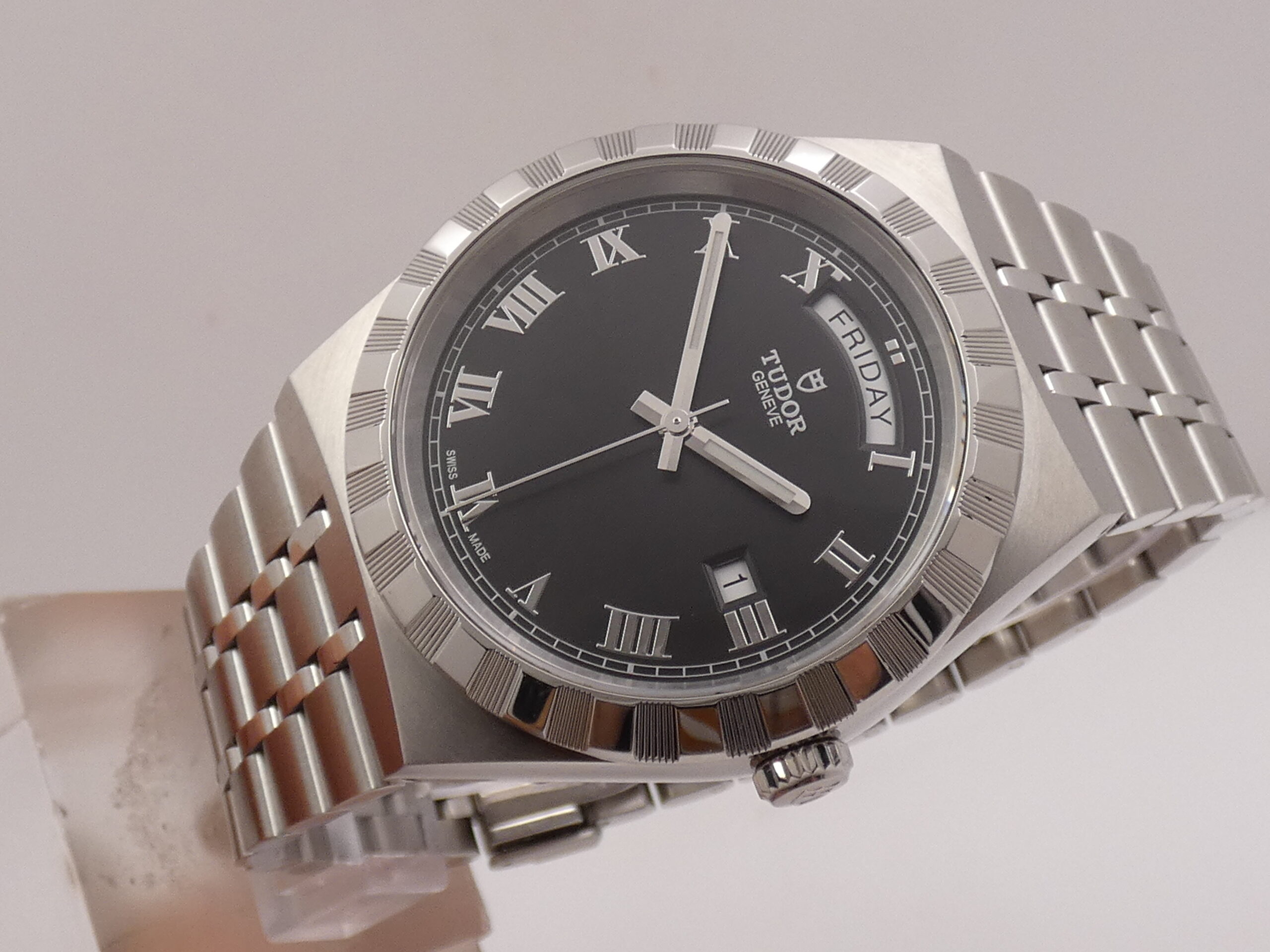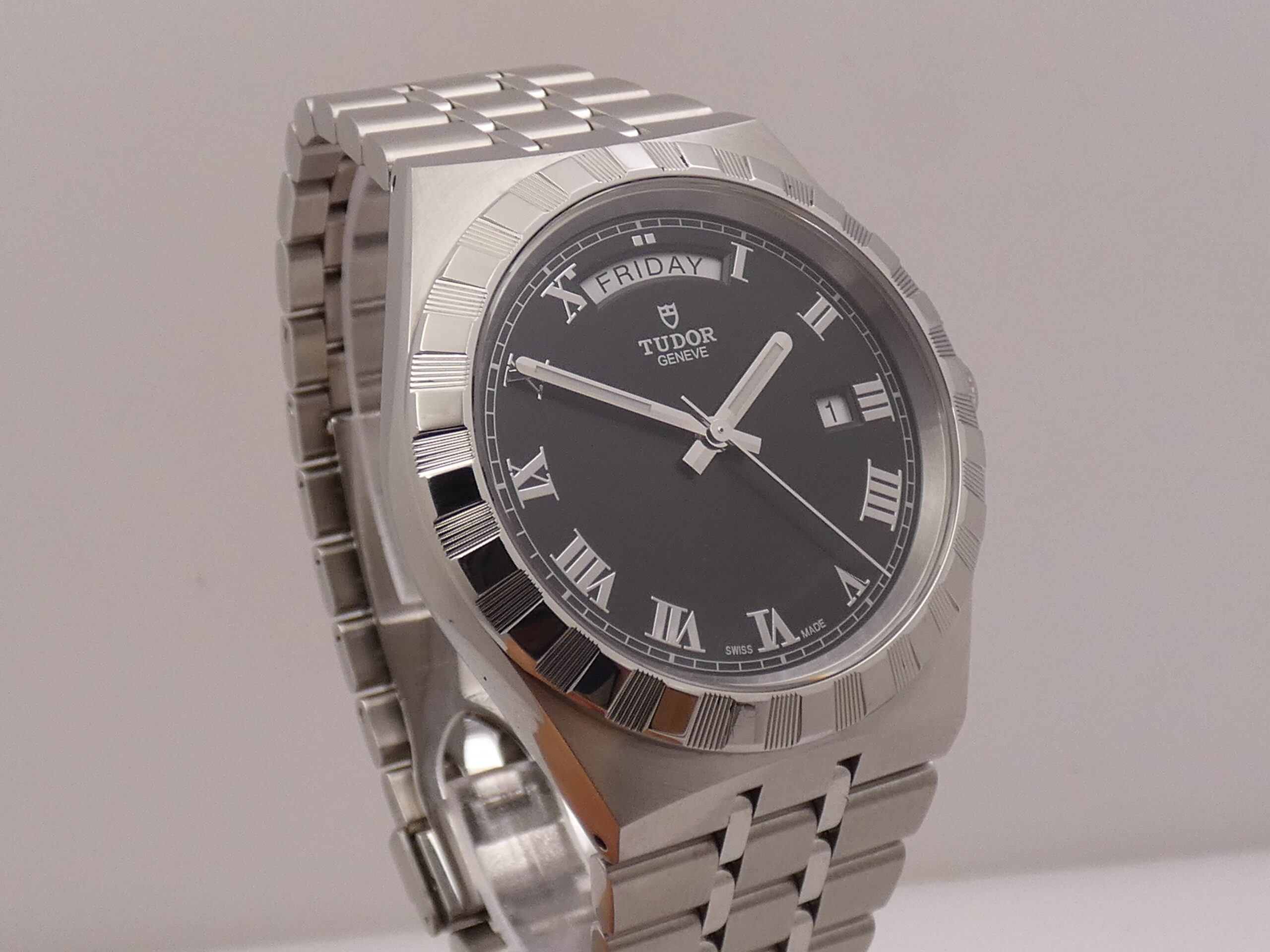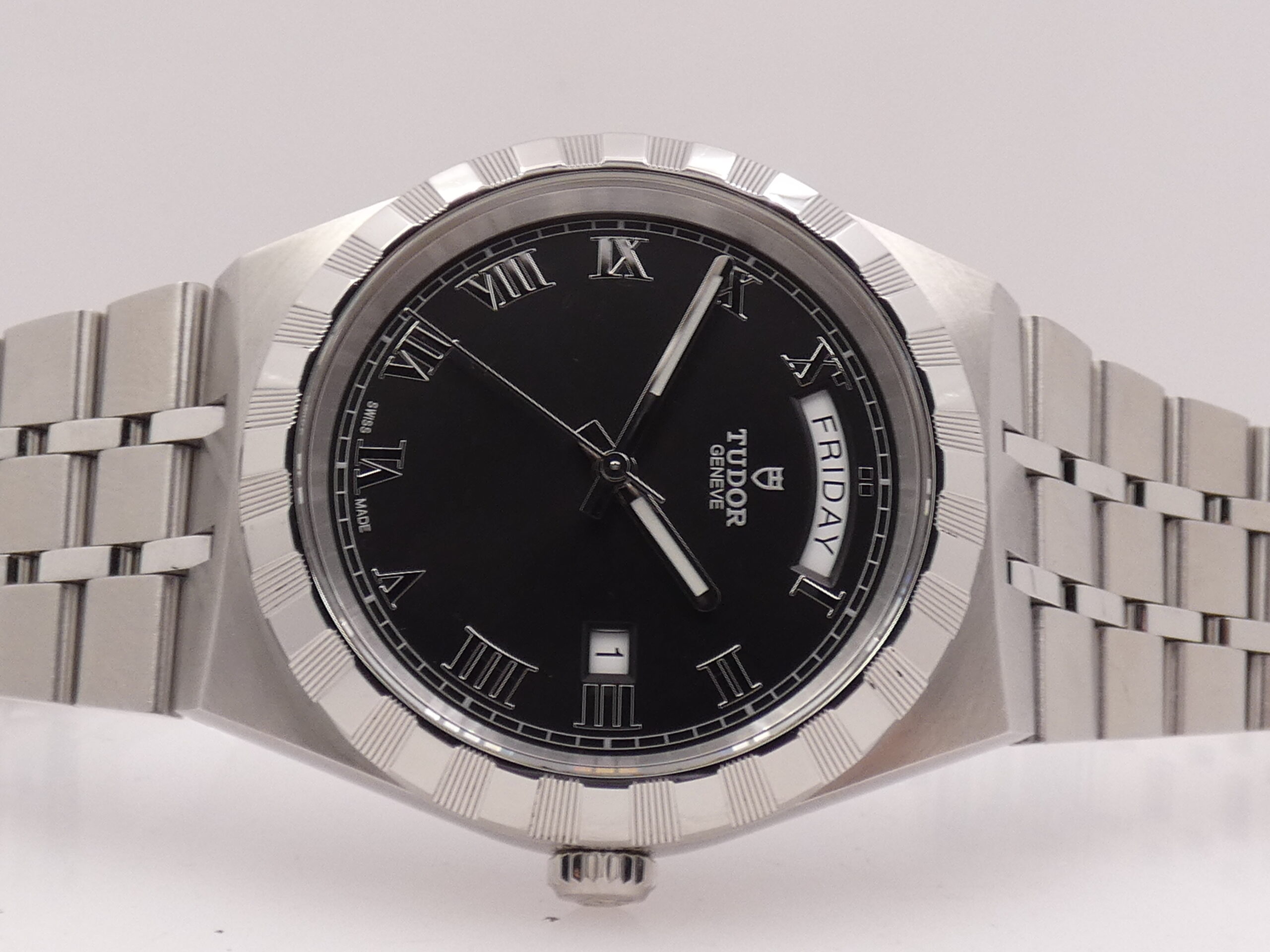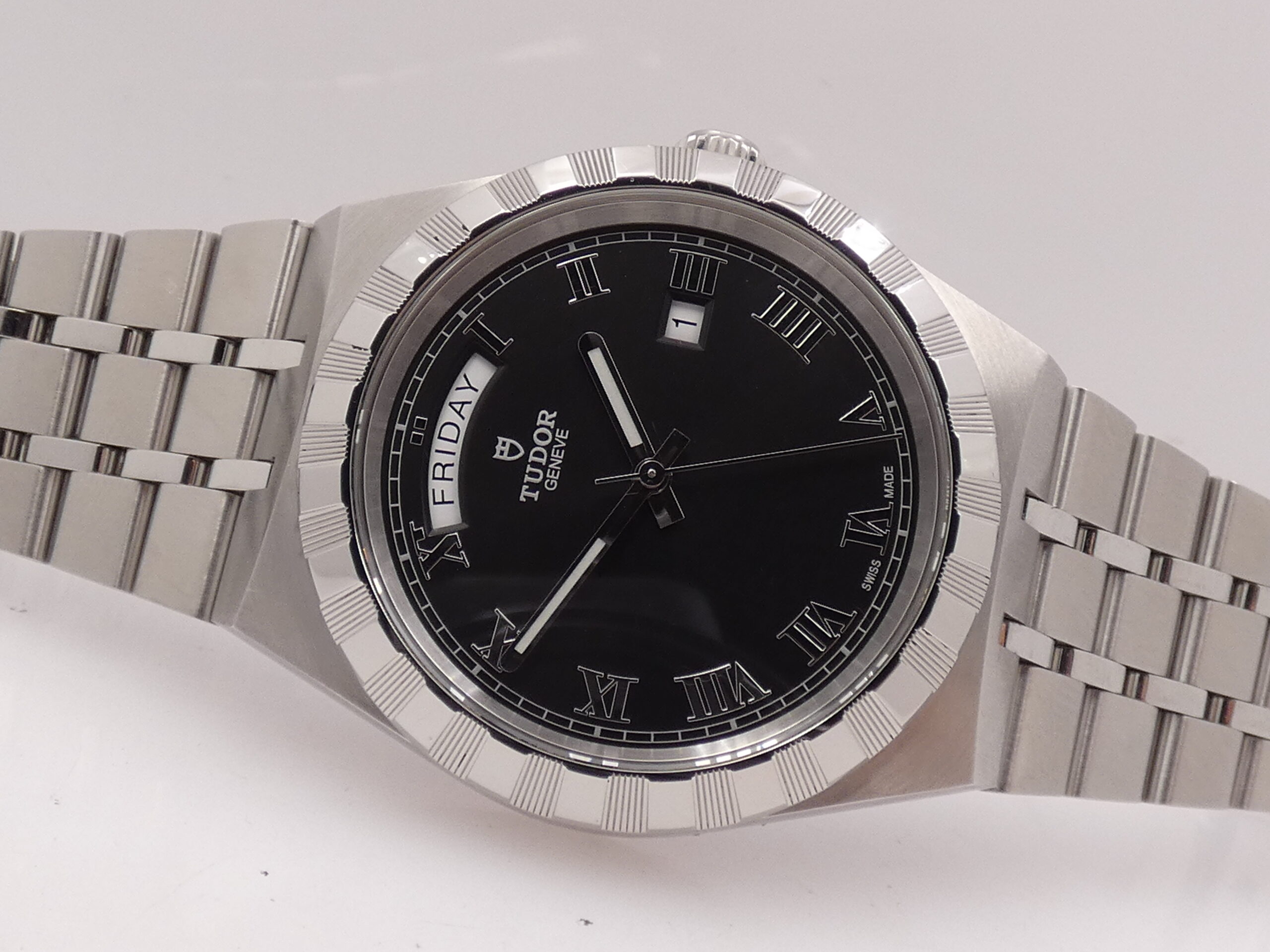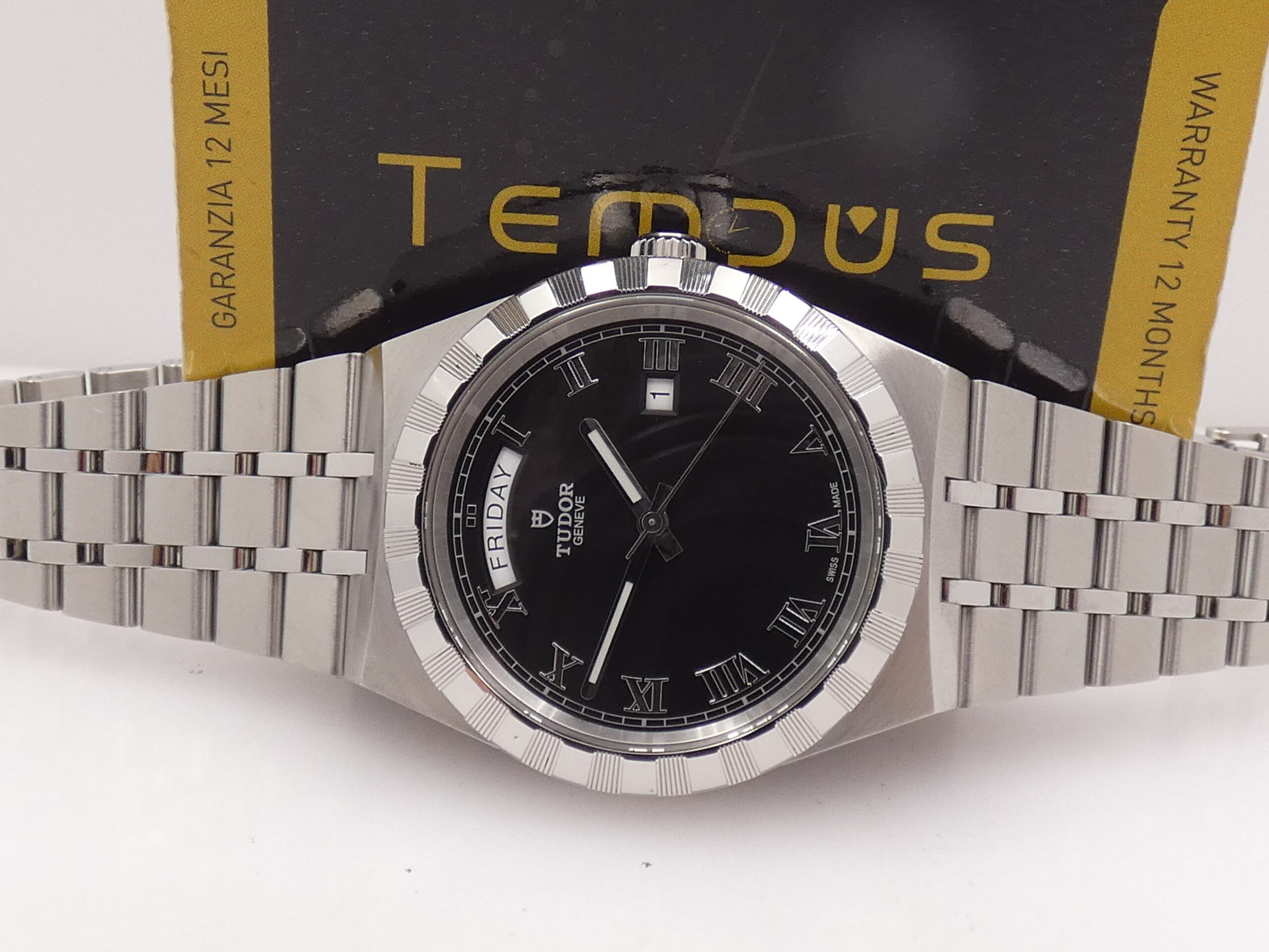 Quadrante: nero soleil, con indici romani in acciaio, lancette a bastone anch’esse in acciaio, trattate con materiale luminescente, secondi al centro, indicazione del datario al 3, finestrella al 12 per l’indicazione dei giorni della settimana, scala sessantesimale Chemin de Fer, logo Tudor al 12; rimesse rapide in corona