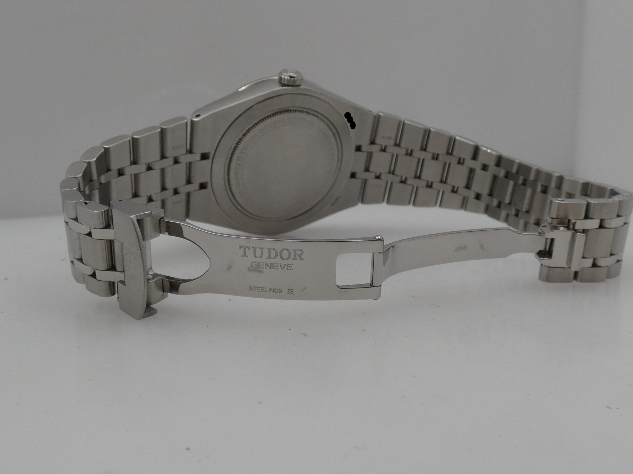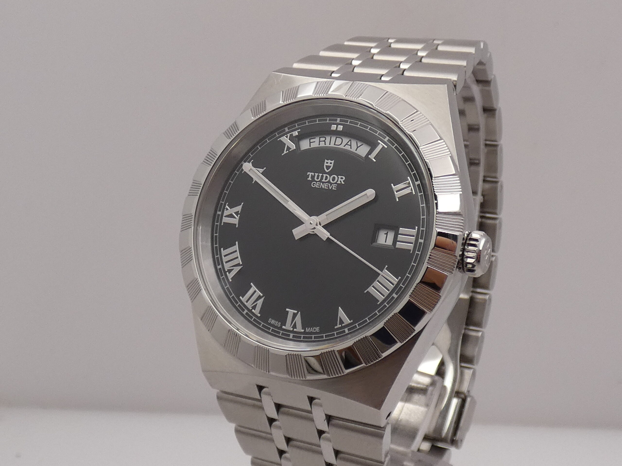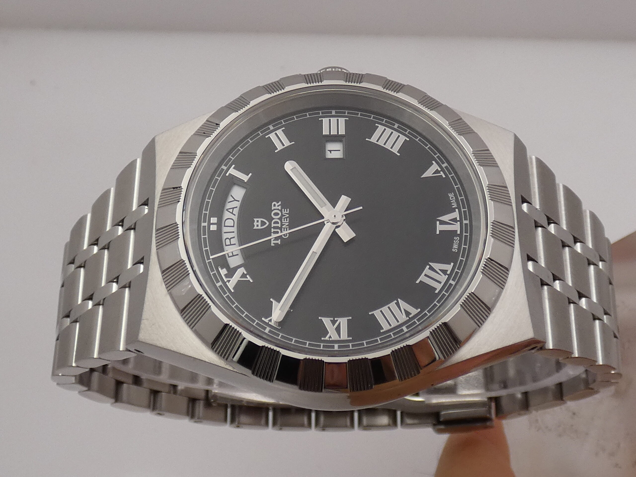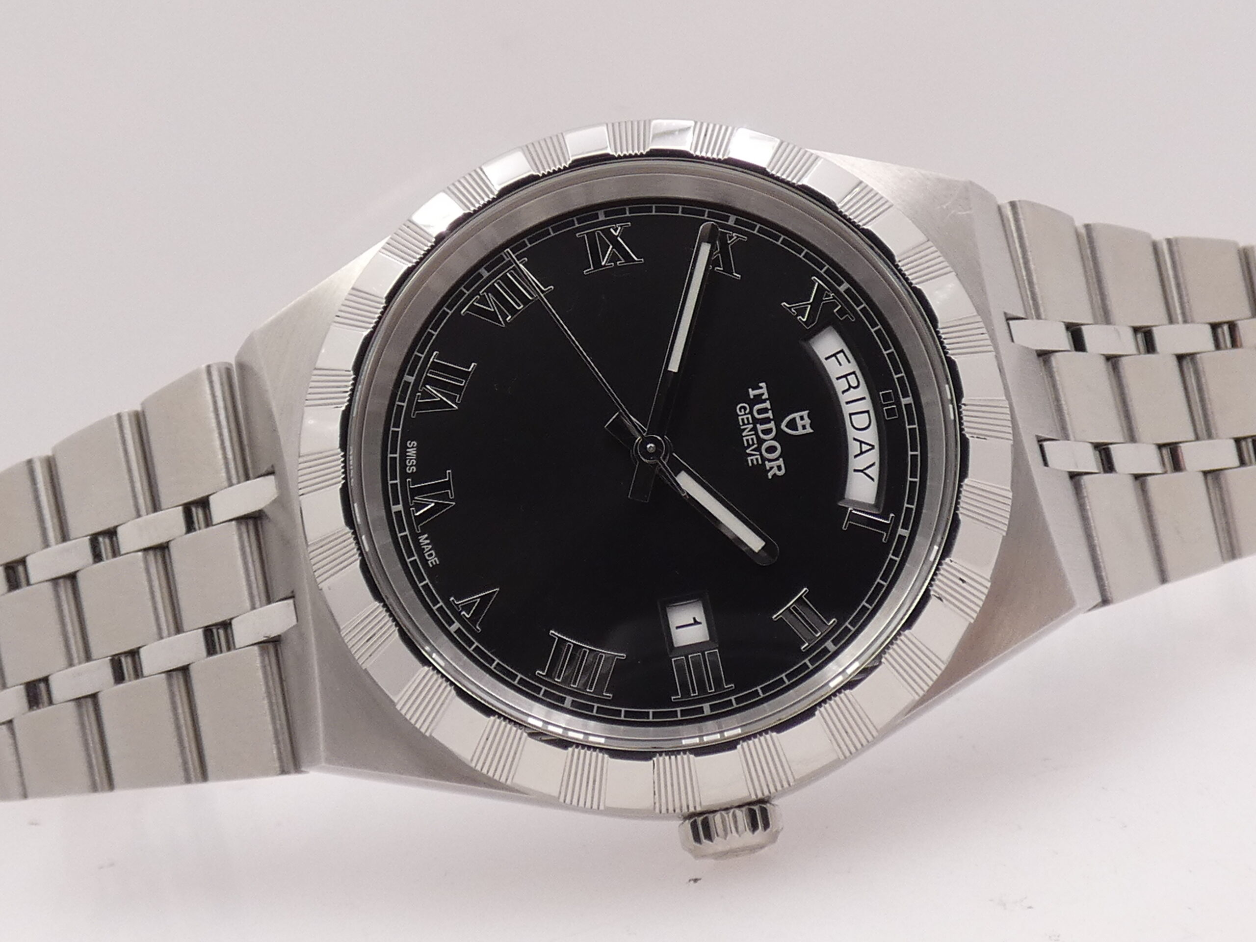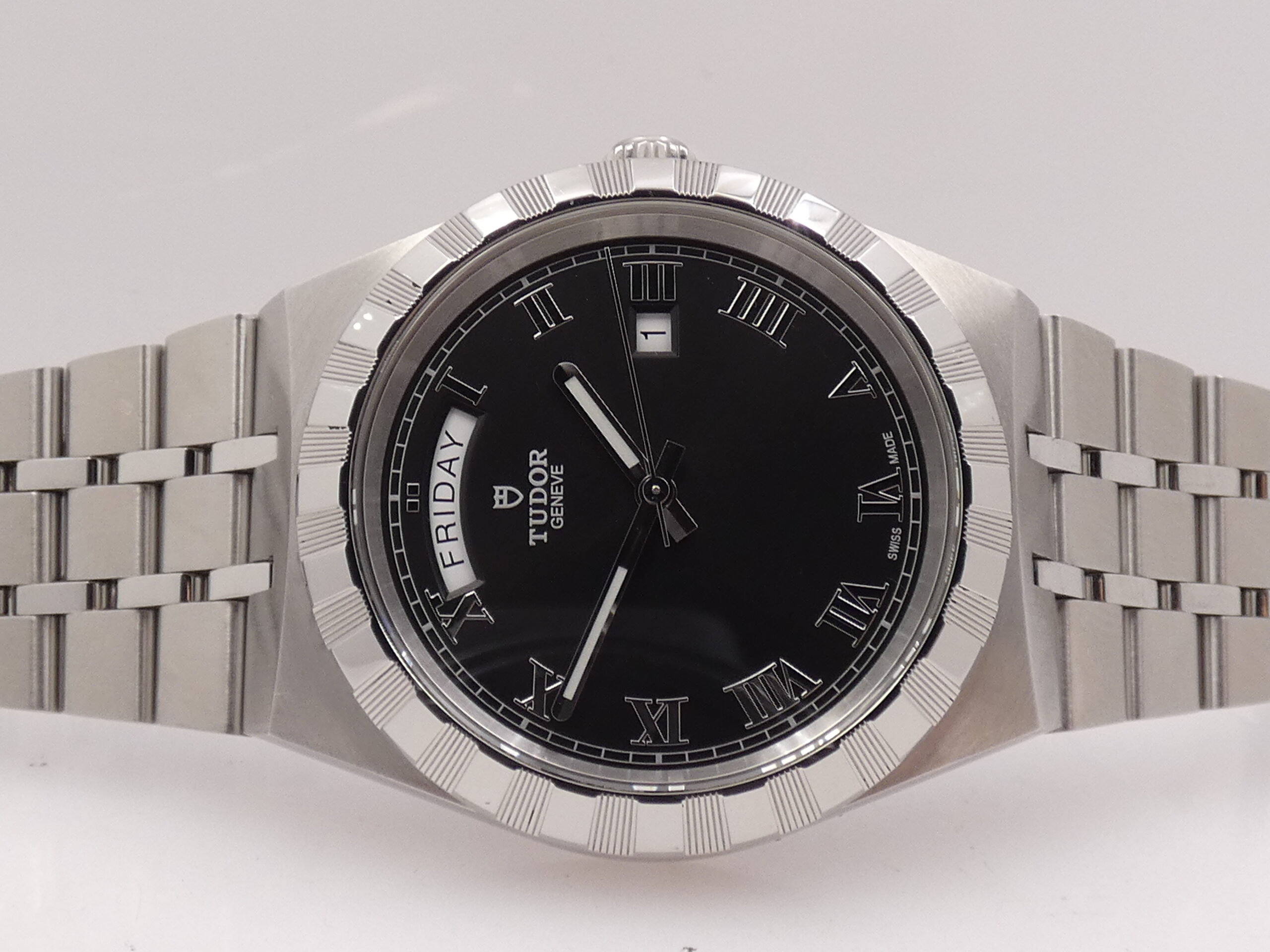 Quadrante: nero soleil, con indici romani in acciaio, lancette a bastone anch’esse in acciaio, trattate con materiale luminescente, secondi al centro, indicazione del datario al 3, finestrella al 12 per l’indicazione dei giorni della settimana, scala sessantesimale Chemin de Fer, logo Tudor al 12; rimesse rapide in corona