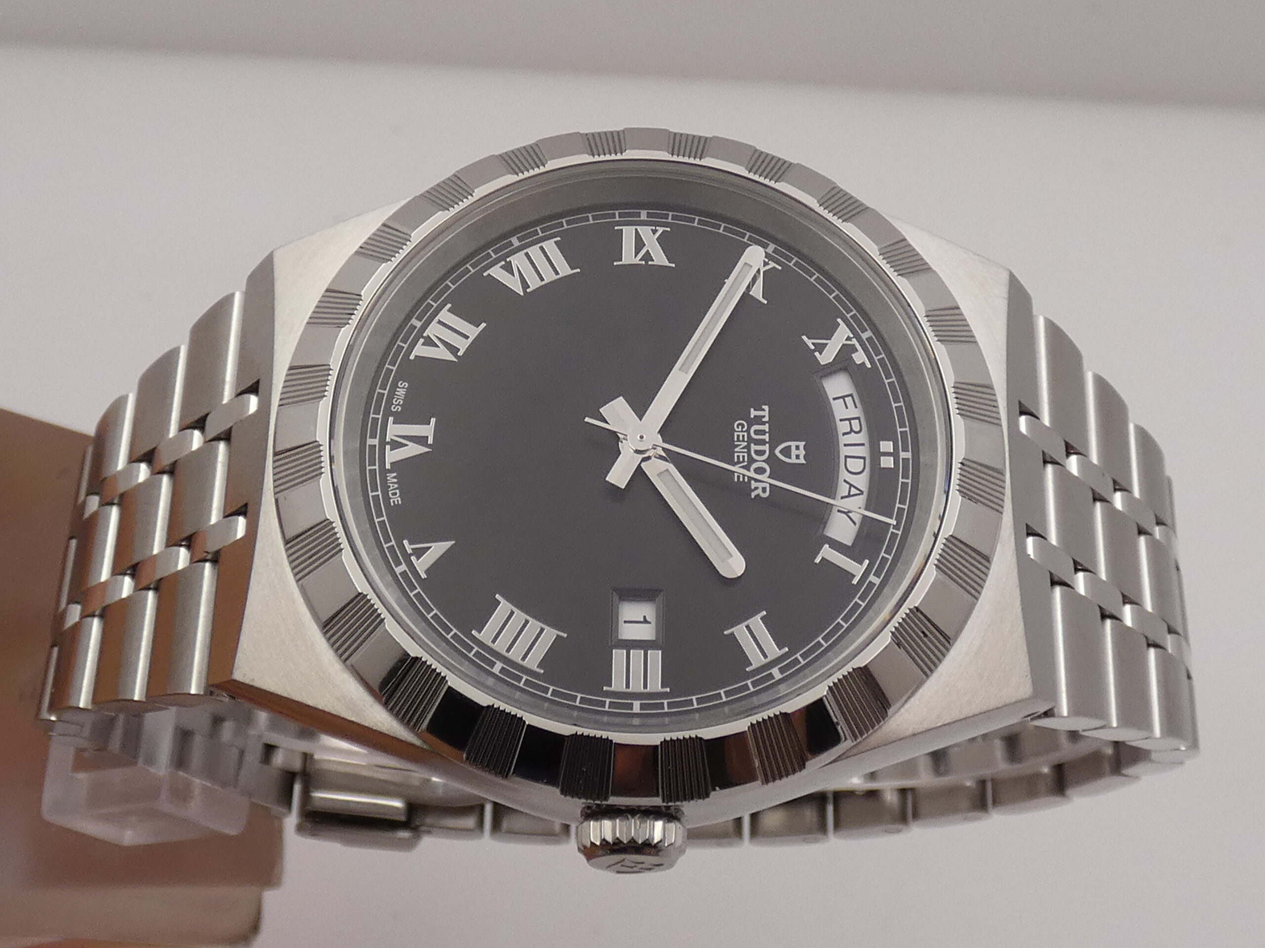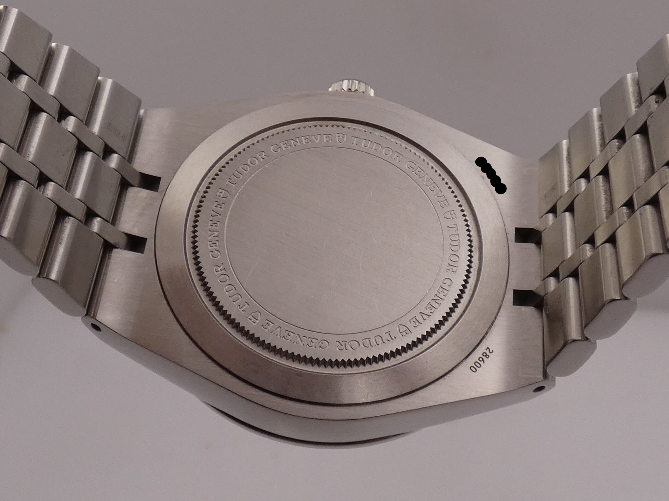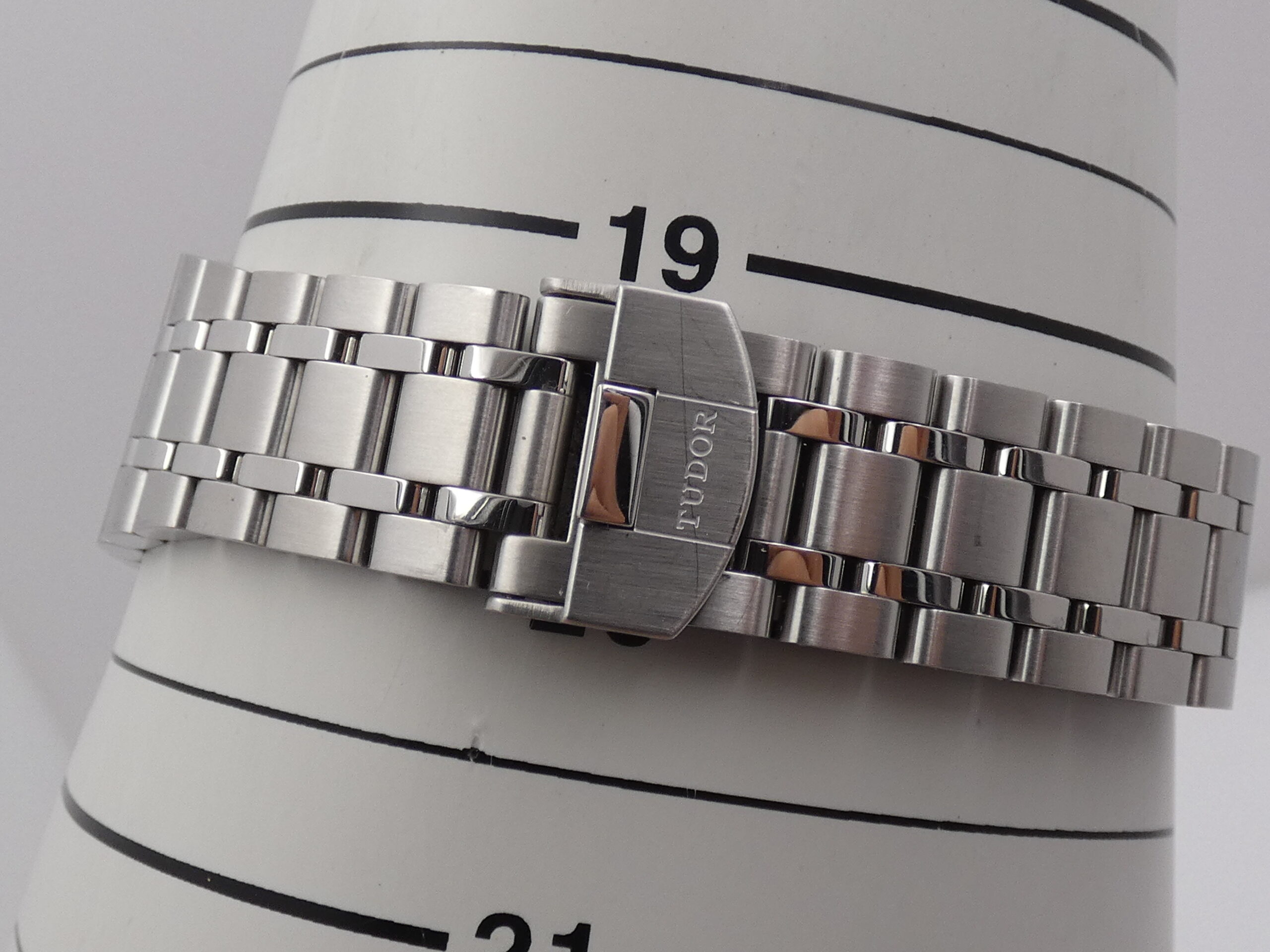Dial: Black sunburst, with steel Roman numerals, steel baton hands with luminescent material, center seconds, date display at 3 o’clock, window at 12 o’clock for the day of the week, Chemin de Fer (railroad track) scale, Tudor logo at 12 o’clock; Quick crown adjustments