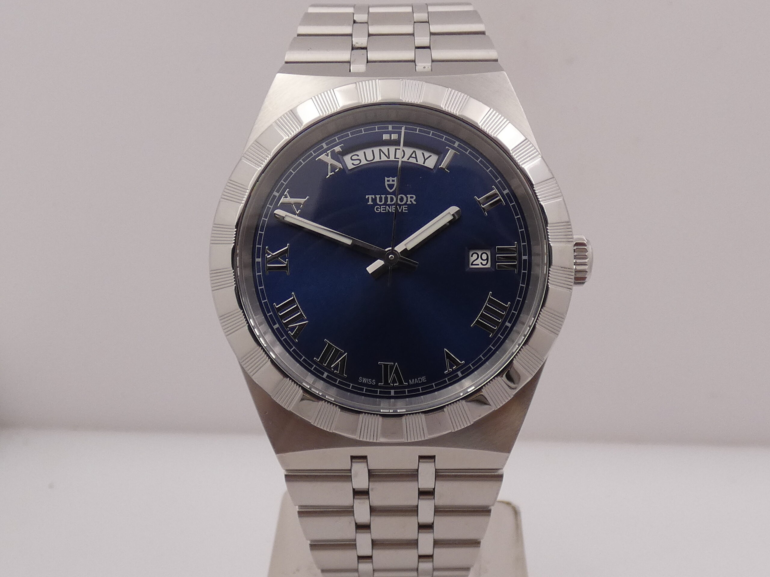 Quadrante: blue soleil, con indici romani in acciaio, lancette a bastone anch’esse in acciaio, trattate con materiale luminescente, secondi al centro, indicazione del datario al 3, finestrella al 12 per l’indicazione dei giorni della settimana, scala sessantesimale Chemin de Fer, logo Tudor al 12; rimesse rapide in corona