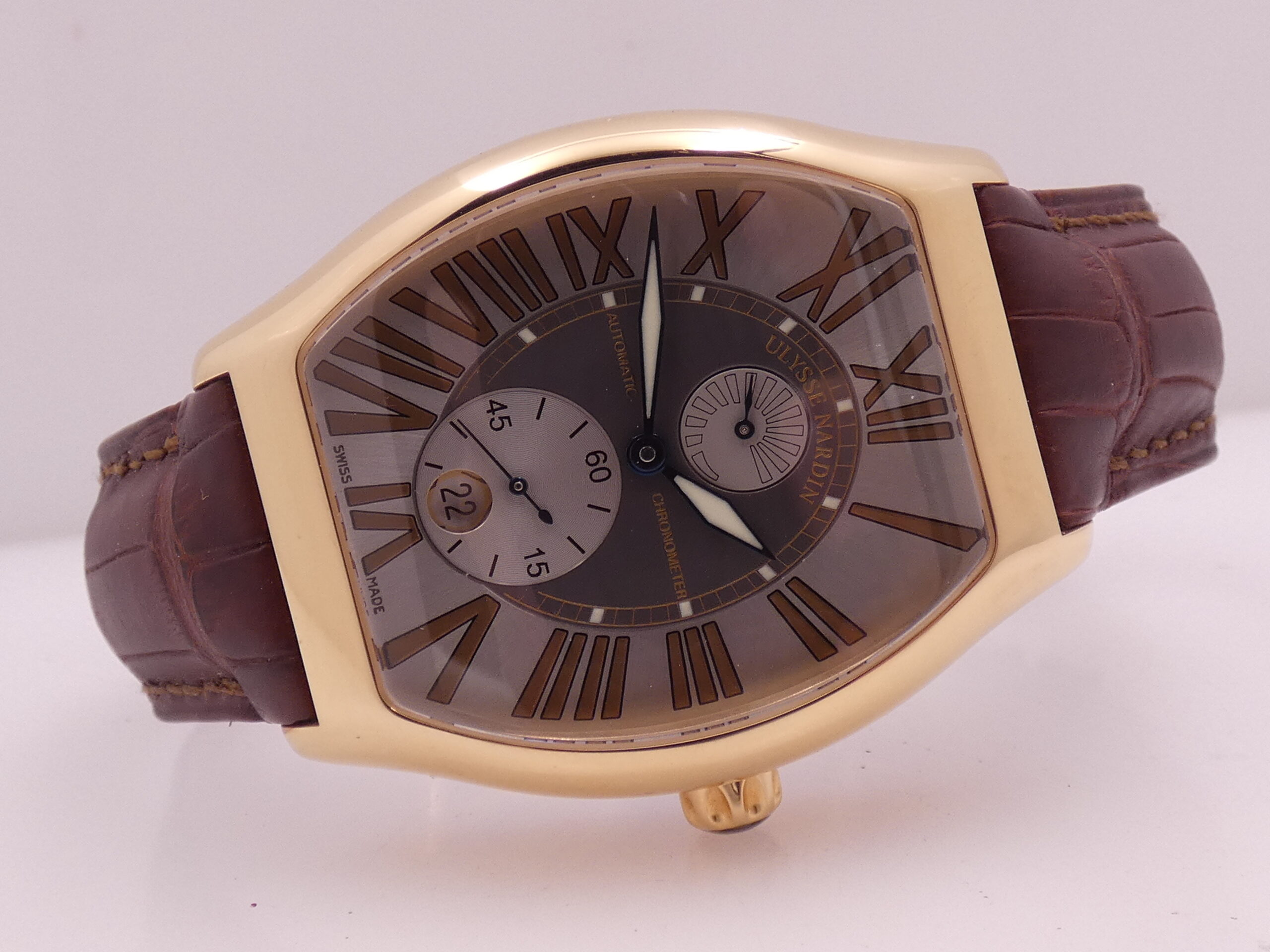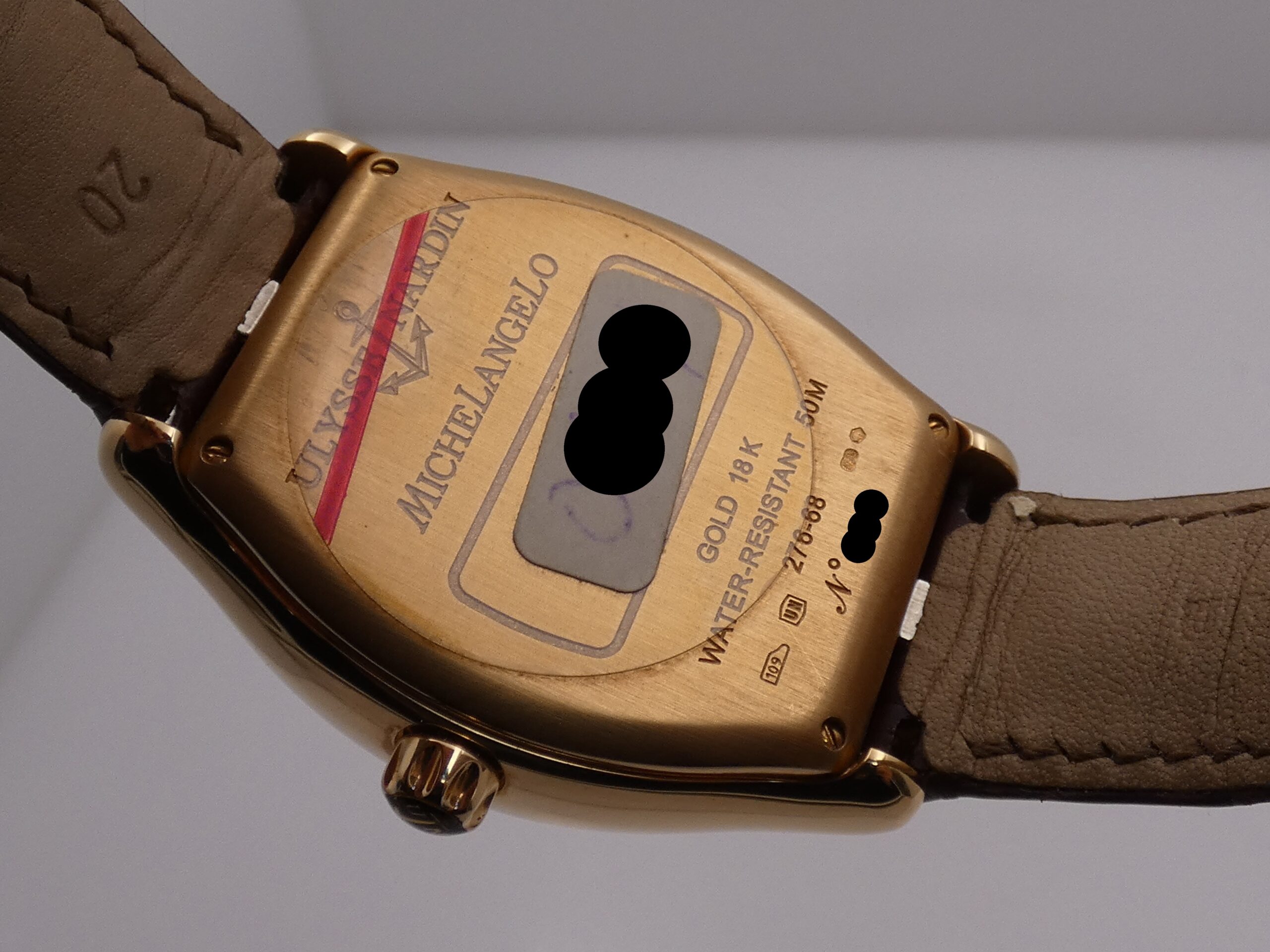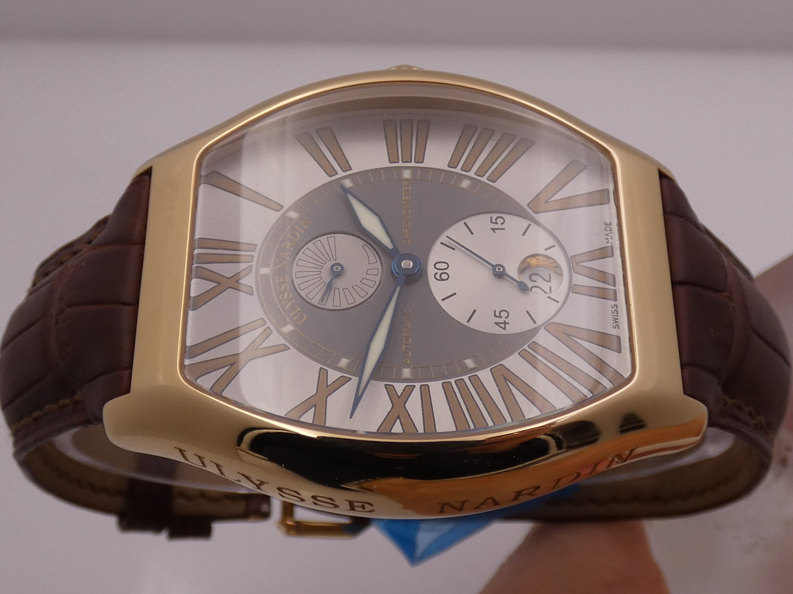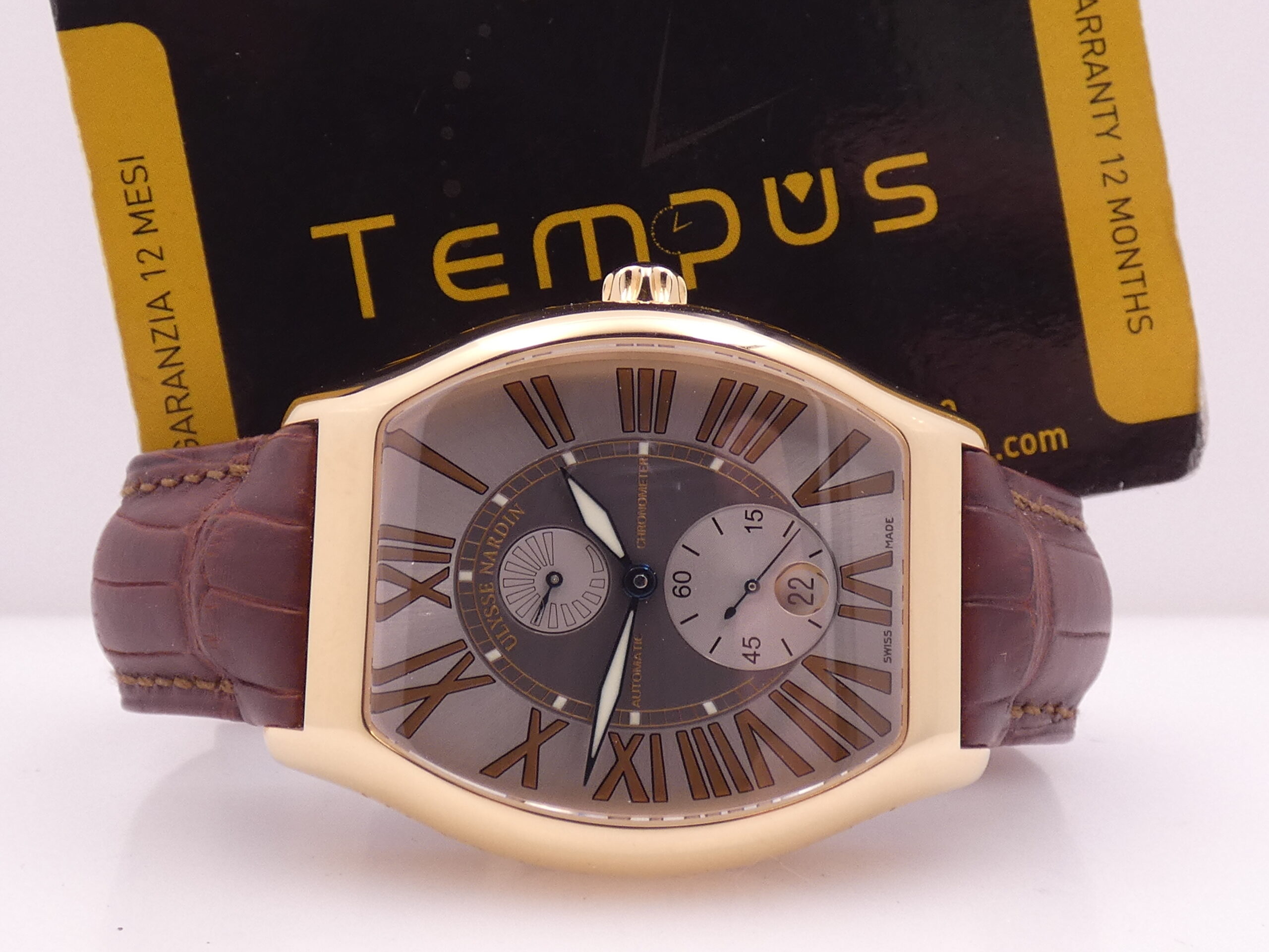 Model: Michelangelo Gigante Power Reserve Reference: 276-68 Year: 2000s Movement: Self-winding mechanical movement, caliber UN 27-0604, officially certified by the C.O.S.C. Functions: Hours, minutes, seconds, date, power reserve Case: Oversized, shaped, entirely in solid 18K rose gold Bezel: Smooth Crown: Original screw-down crown with blue cabochon and UN logo Lugs: Curved; 20 mm lug width Dimensions: 38 x 43 mm excluding crown, 49 mm at the lugs Crystal: Sapphire Case back: Secured by 4 screws, featuring the brand logo, with the original protective film still attached Dial: Silver, matte gray in the center, Roman numerals, blued leaf hands, seconds at 6 o’clock, date display at 6 o’clock with quick-set crown, power reserve indicator at 12 o’clock, central 60-minute scale, Ulysse Nardin logo at 12 o’clock Strap: Original Ulysse Nardin leather Clasp: Deployment clasp, 18K rose gold, original Ulysse Nardin The watch you see for sale is in NOS (New Old Stock) condition, never worn, in perfect working order, accurate, and reliable. It is completely original.It will be delivered to you in its beautiful wooden box, unfortunately peeling on the inside, its outer box, its warranty, its COSC certificate, its manual and the world service booklet, plus our 12-month warranty on proper functioning!!! It’s in the photo. Wonderful!!! WE WILL EXAMINE YOUR USED ITEM. WE SHIPPING FREE WORLDWIDE. INTERNAL CODE: NZZZ DO YOU HAVE THE SAME WATCH AND WANT TO SELL IT???? …..WE WILL TRY TO GIVE YOU THE BEST QUOTE CONTACT US AND WE WILL TRY TO GIVE YOU THE BEST QUOTEOUR WATCHMAKER IS SPECIALIZED IN THE PURCHASE AND SALE OF WATCHES OF BIG BRANDS, CONTEMPORARY AND VINTAGE. WE BUY SINGLE PIECES OR ENTIRE COLLECTIONS. THE EVALUATION IS FREE.