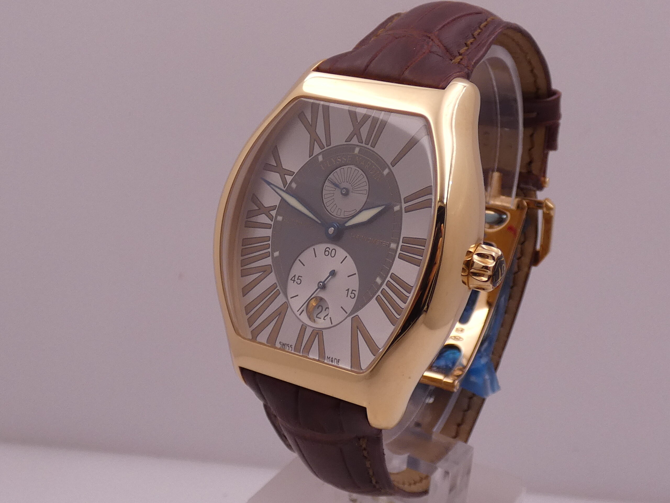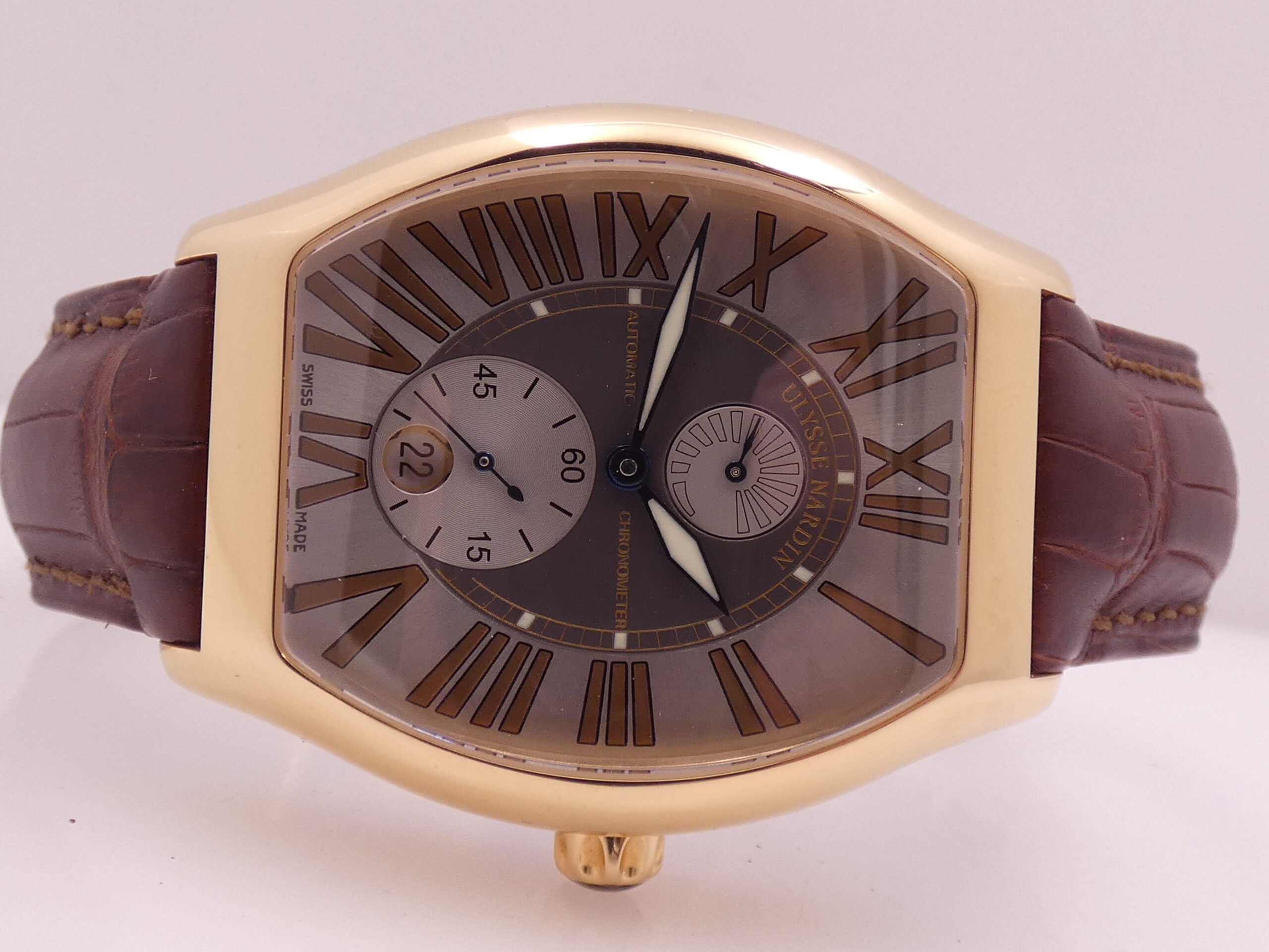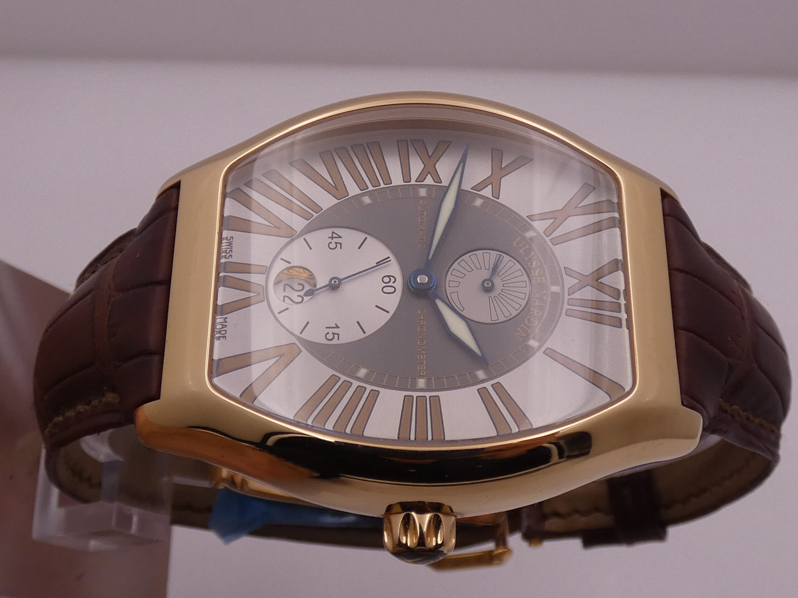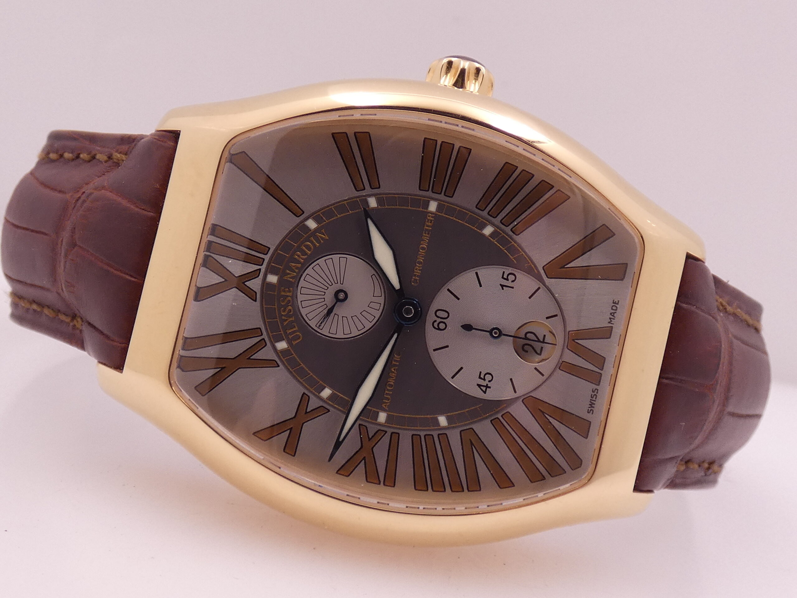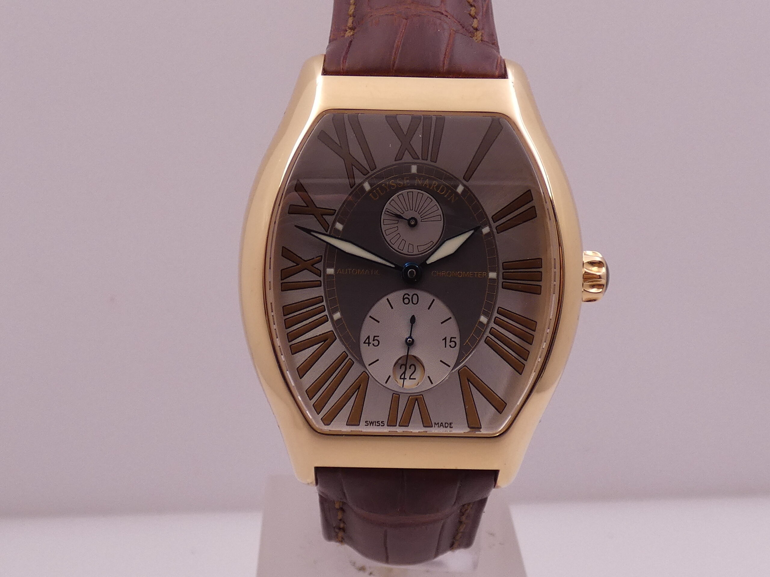 Model: Michelangelo Gigante Power Reserve Reference: 276-68 Year: 2000s Movement: Self-winding mechanical movement, caliber UN 27-0604, officially certified by the C.O.S.C. Functions: Hours, minutes, seconds, date, power reserve Case: Oversized, shaped, entirely in solid 18K rose gold Bezel: Smooth Crown: Original screw-down crown with blue cabochon and UN logo Lugs: Curved; 20 mm lug width Dimensions: 38 x 43 mm excluding crown, 49 mm at the lugs Crystal: Sapphire Case back: Secured by 4 screws, featuring the brand logo, with the original protective film still attached Dial: Silver, matte gray in the center, Roman numerals, blued leaf hands, seconds at 6 o’clock, date display at 6 o’clock with quick-set crown, power reserve indicator at 12 o’clock, central 60-minute scale, Ulysse Nardin logo at 12 o’clock Strap: Original Ulysse Nardin leather Clasp: Deployment clasp, 18K rose gold, original Ulysse Nardin The watch you see for sale is in NOS (New Old Stock) condition, never worn, in perfect working order, accurate, and reliable. It is completely original.It will be delivered to you in its beautiful wooden box, unfortunately peeling on the inside, its outer box, its warranty, its COSC certificate, its manual and the world service booklet, plus our 12-month warranty on proper functioning!!! It’s in the photo. Wonderful!!! WE WILL EXAMINE YOUR USED ITEM. WE SHIPPING FREE WORLDWIDE. INTERNAL CODE: NZZZ DO YOU HAVE THE SAME WATCH AND WANT TO SELL IT???? …..WE WILL TRY TO GIVE YOU THE BEST QUOTE CONTACT US AND WE WILL TRY TO GIVE YOU THE BEST QUOTEOUR WATCHMAKER IS SPECIALIZED IN THE PURCHASE AND SALE OF WATCHES OF BIG BRANDS, CONTEMPORARY AND VINTAGE. WE BUY SINGLE PIECES OR ENTIRE COLLECTIONS. THE EVALUATION IS FREE.