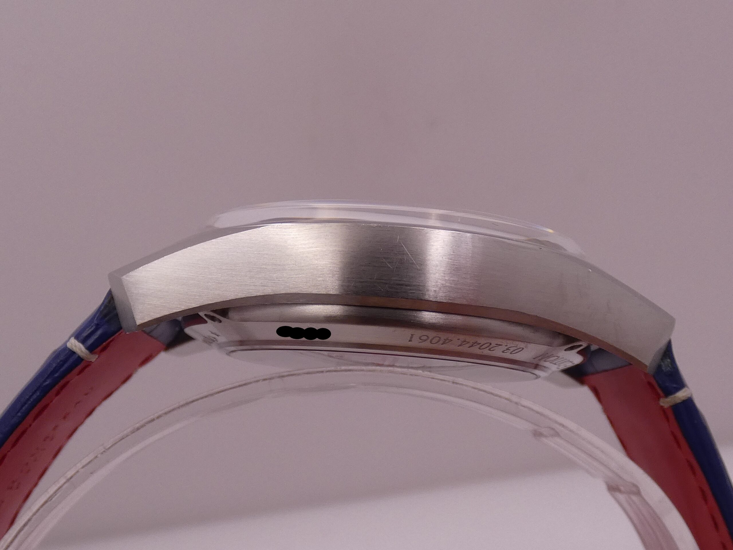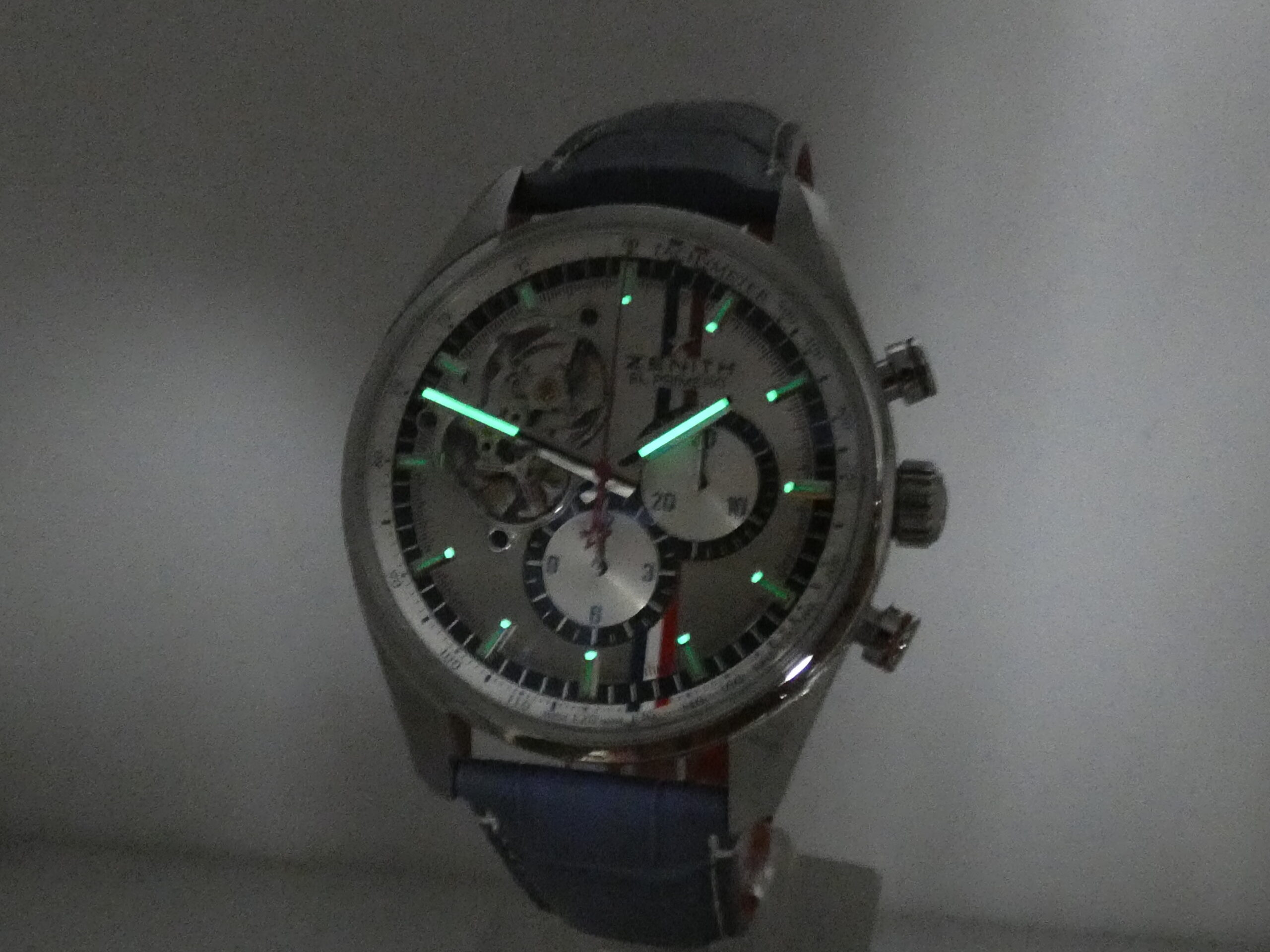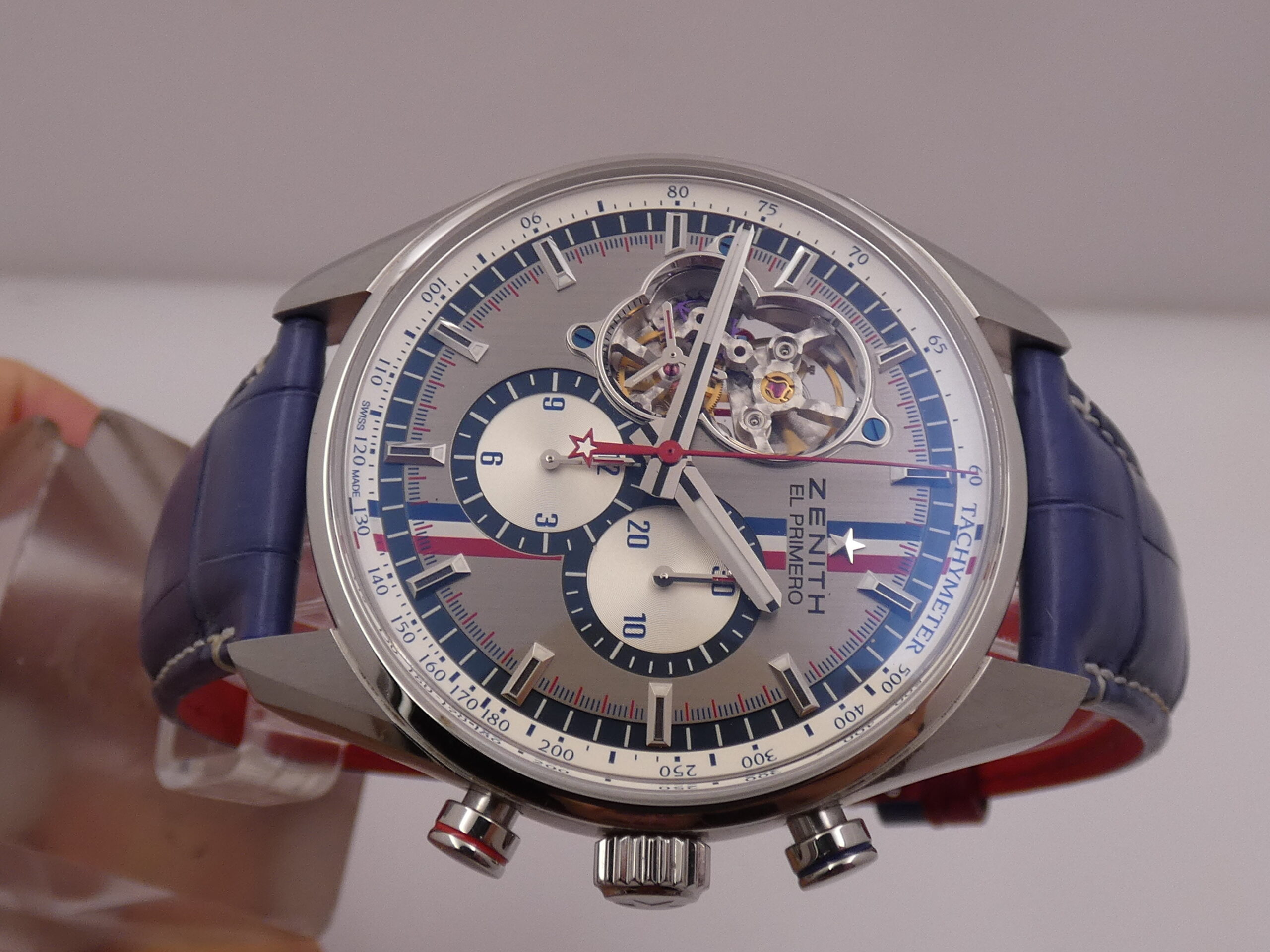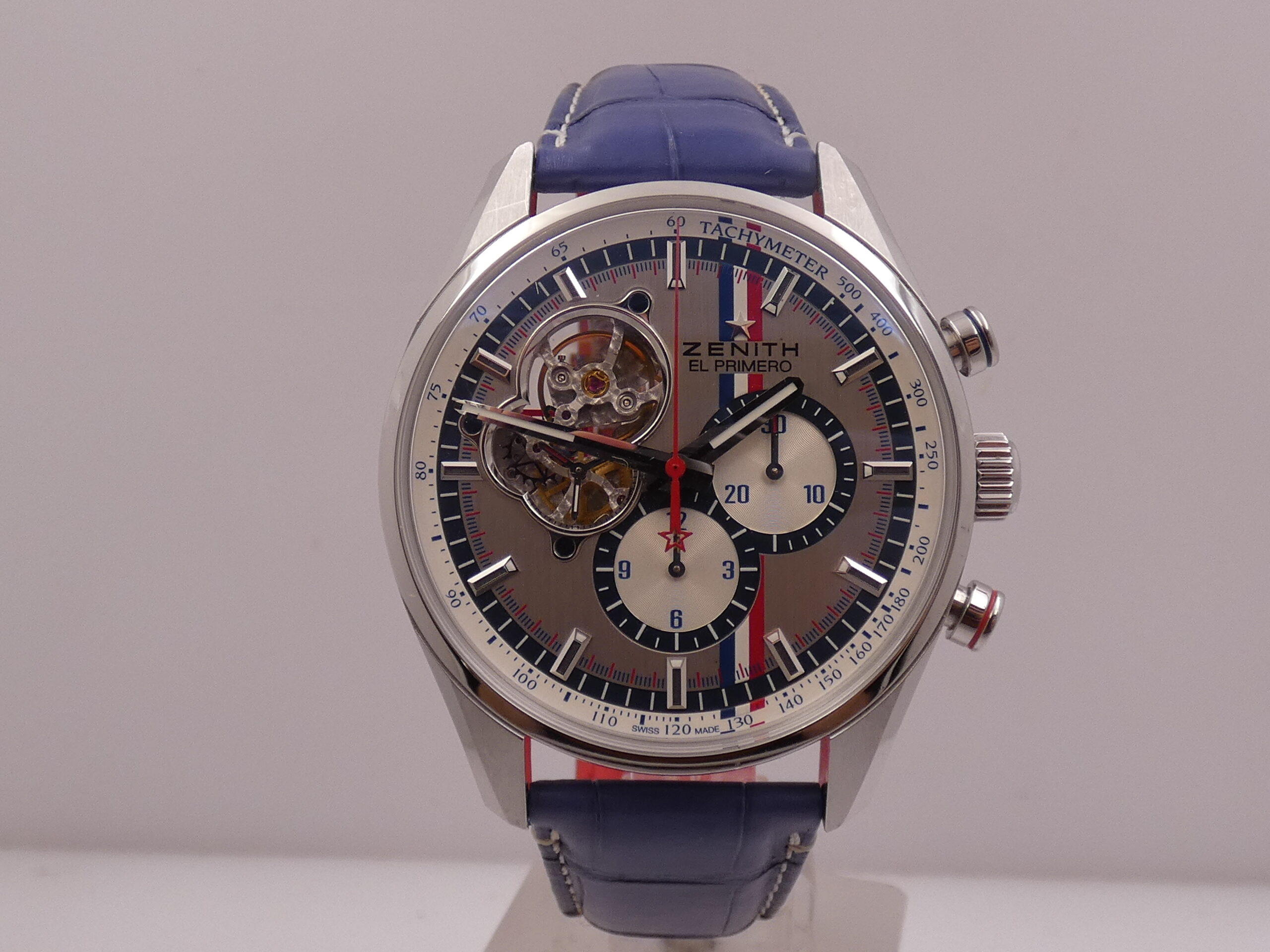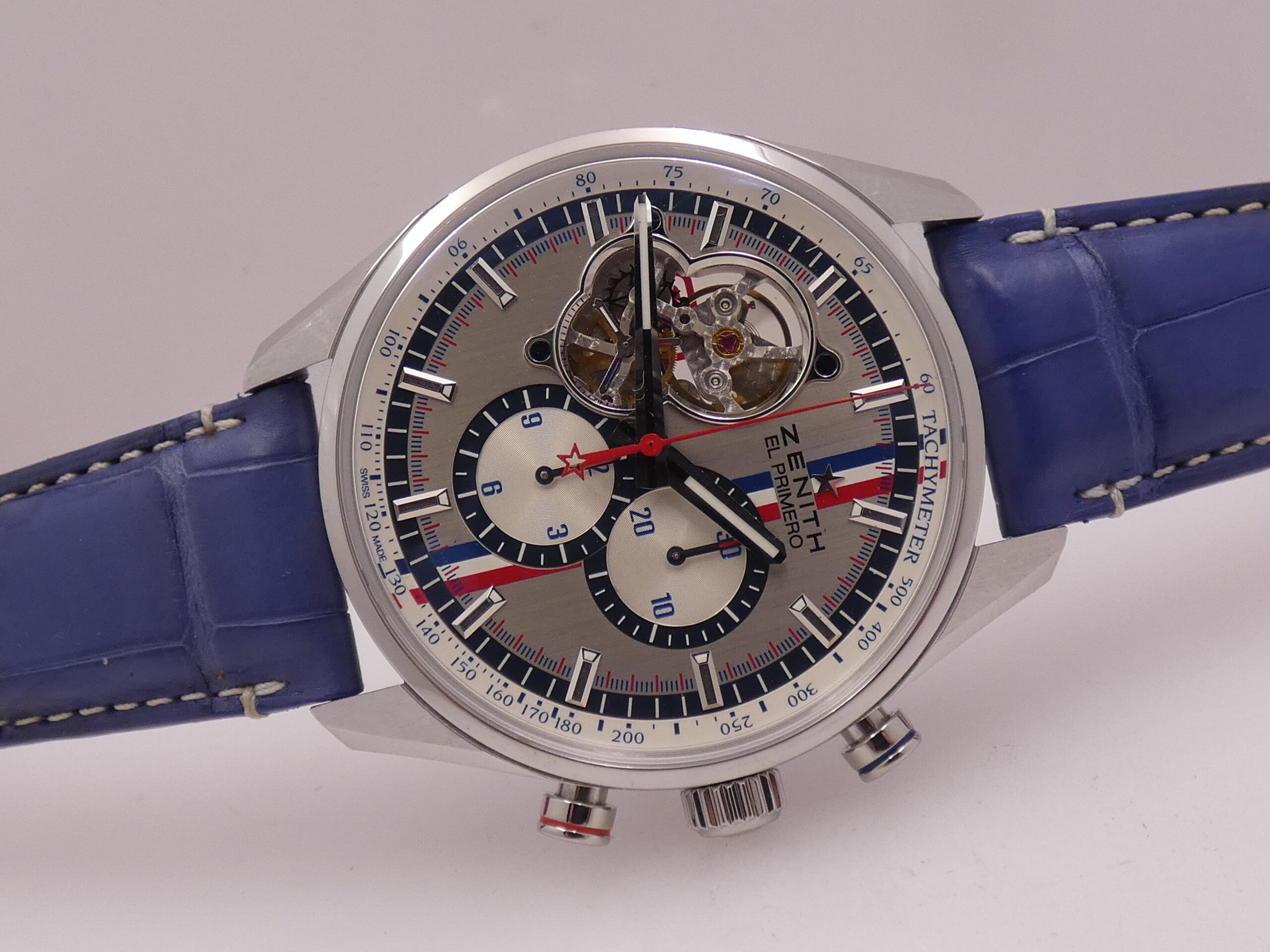 Quadrante: Open Heart, argentè soleil con design “racing”, indici a barretta in acciaio, in rilievo e punti luminescenti sulle estremità, lancette a bastone, anch’esse in acciaio e luminescenti, secondi continui al 9, minuti del crono al 3, ore del crono al 6, secondi cronografici al centro, scala sessantesimale con suddivisione ad 1/5 di secondo, scala tachimetrica sul rehaut, logo Zenith all’ 1