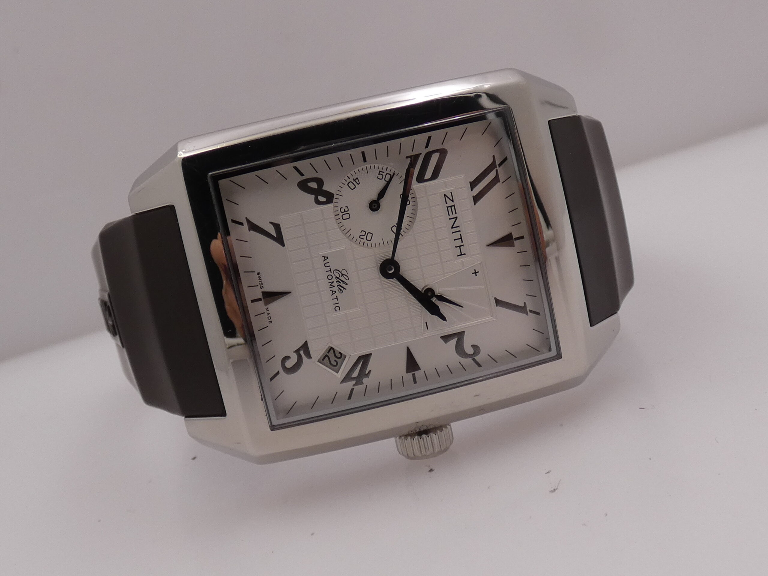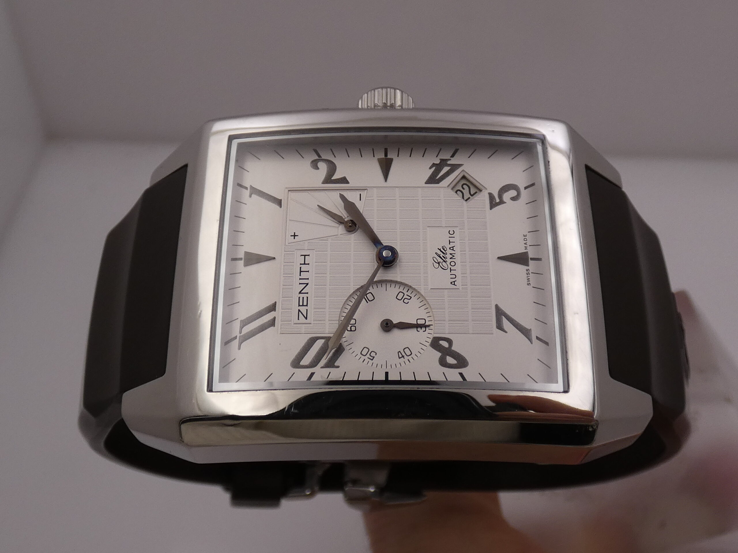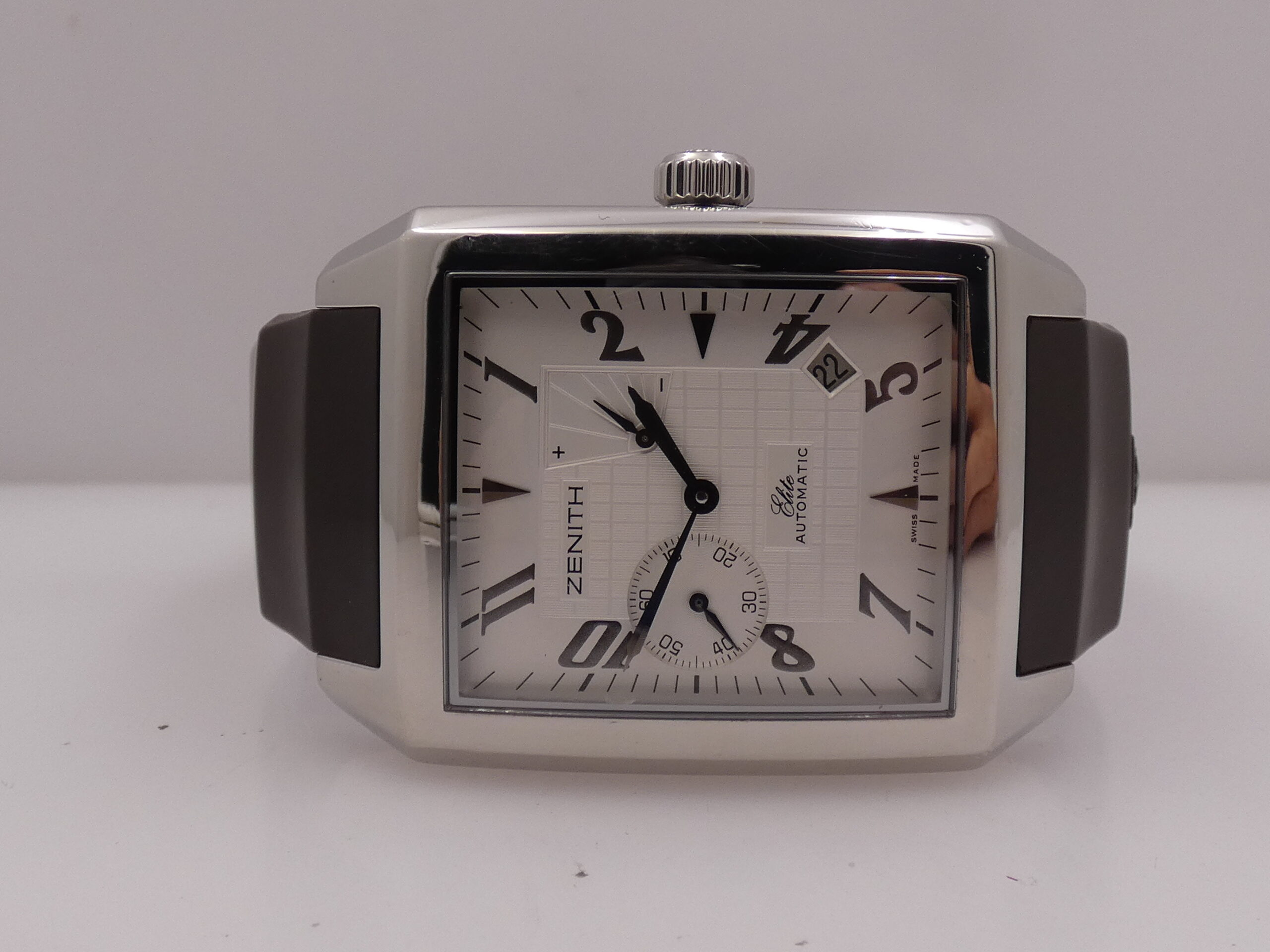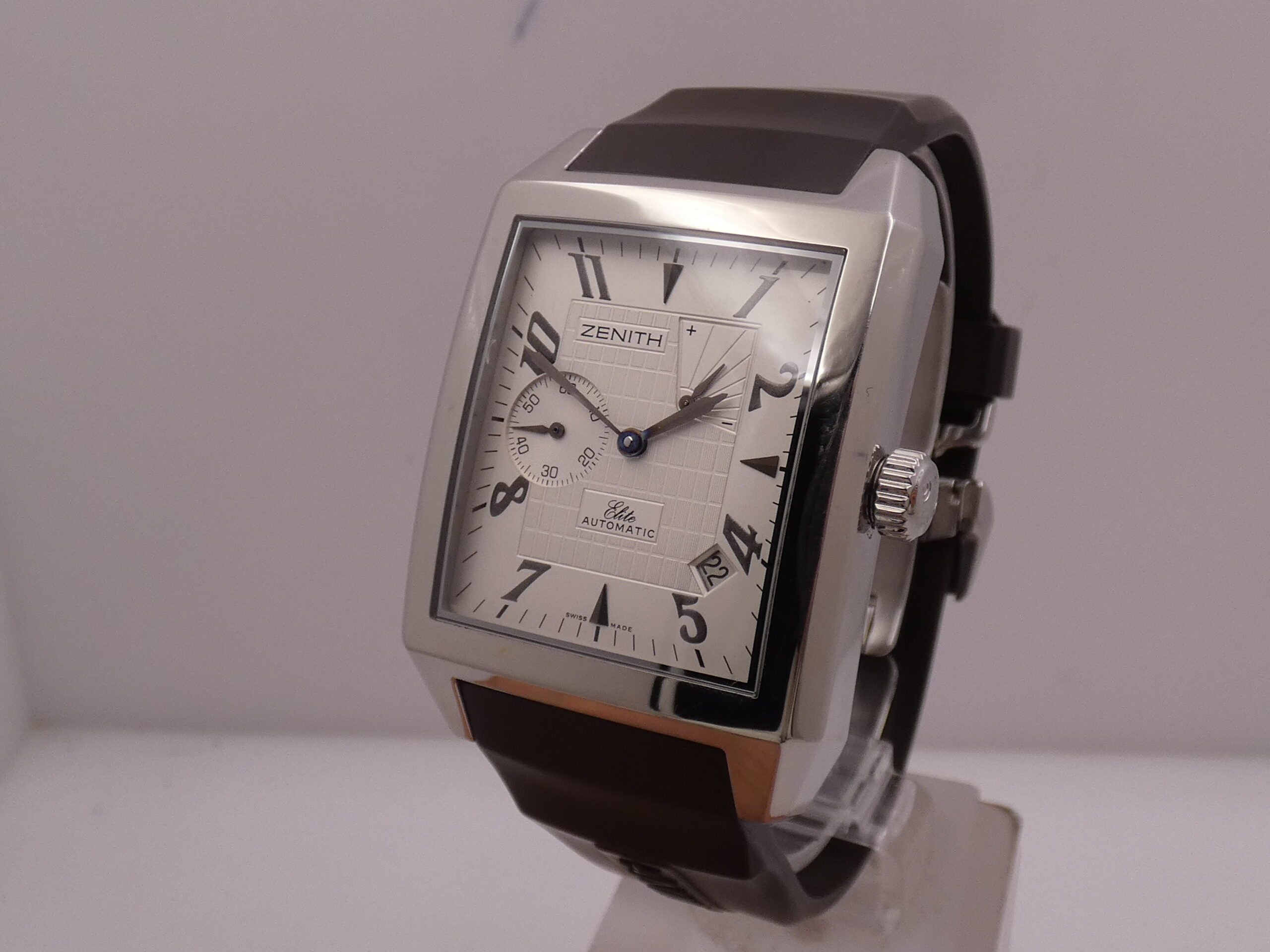 Quadrante: bianco/argentè con parte centrale con bellissime lavorazioni, indici arabi, geometrici a quarti, lancette in acciaio brunito, secondiera al 9, indicazione del datario tra 4 e 5 con rimessa rapida in corona, indicatore della riserva di carica tra 1 e 2, scala sessantesimale, logo Zenith all’ 11