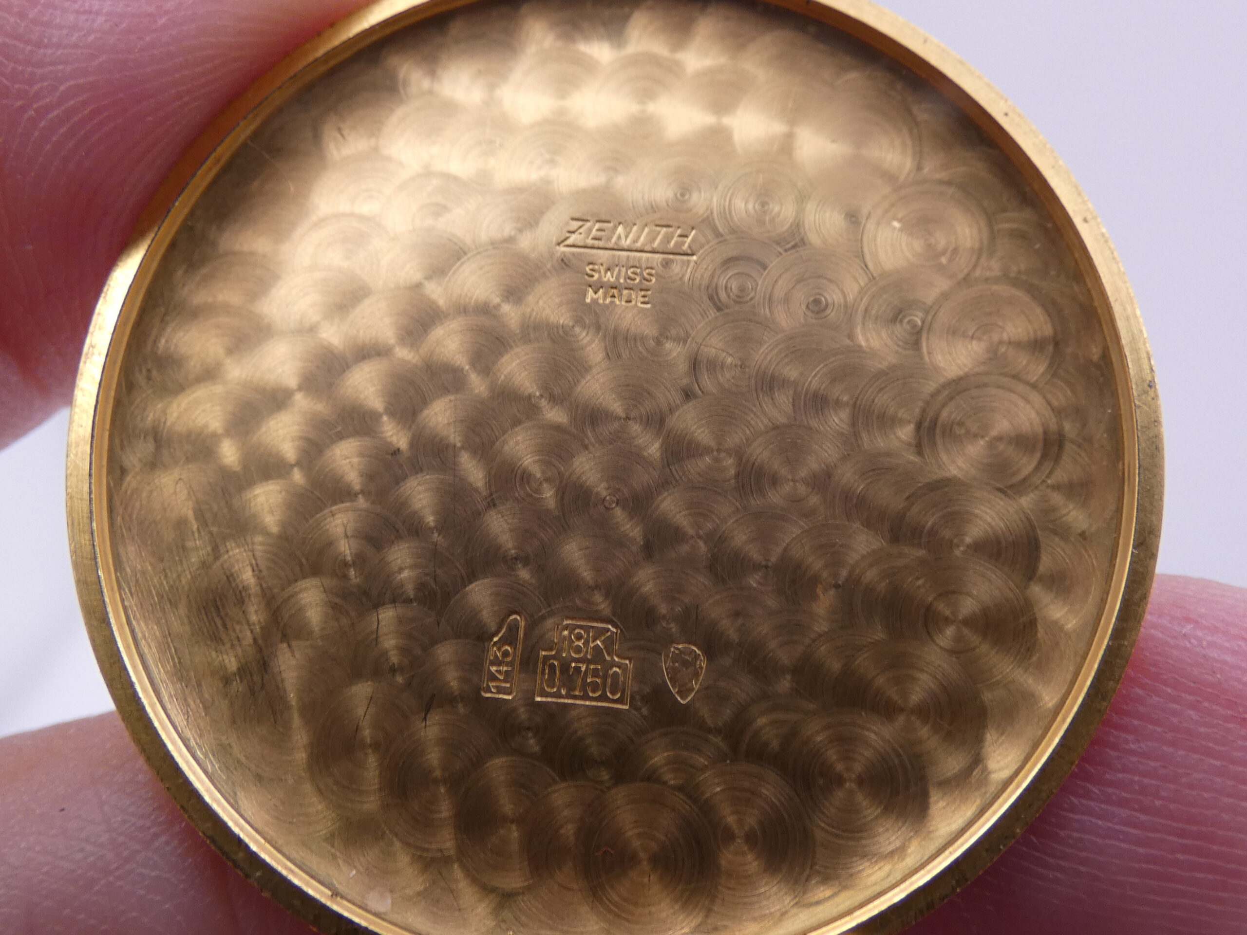 Quadrante: bianco/argentè con leggera patina del tempo, con indici a barretta, arabi a mezza, in oro rosa ed in rilievo, lancette dauphine anch’esse in oro rosa, secondi al 6, logo e stellina Zenith al 12